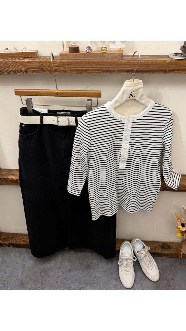 Top60401005 質感坑條亨利領七分袖針織上衣