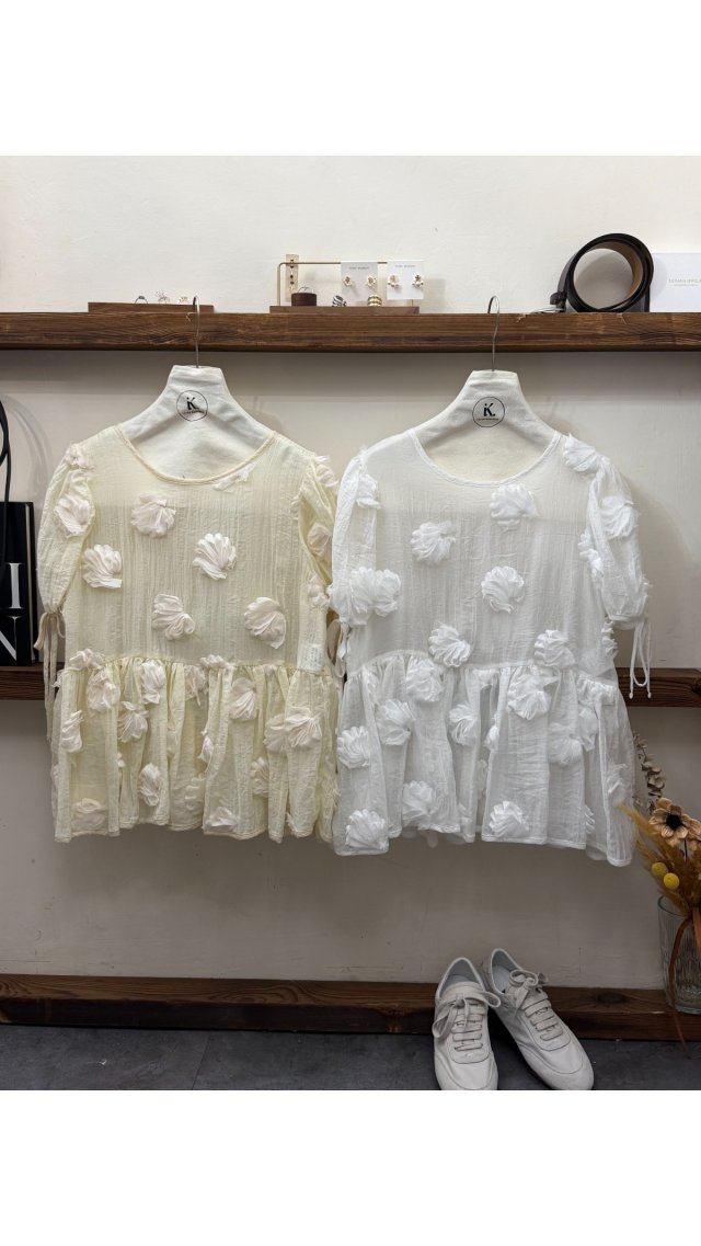 Top60401006 溫柔氣質立體花朵泡泡袖上衣