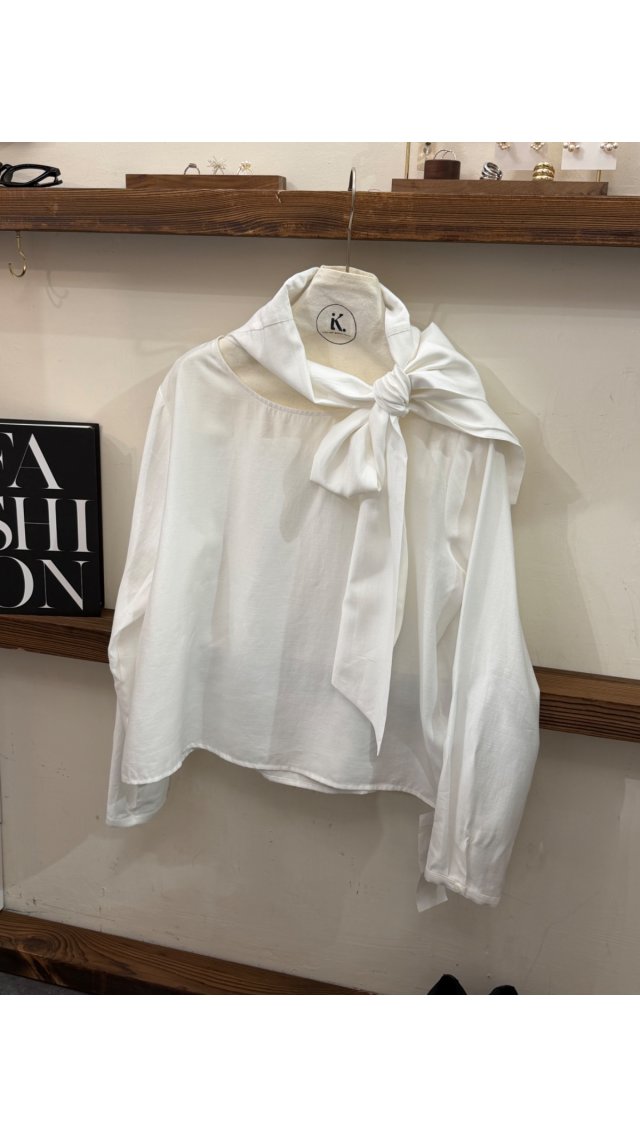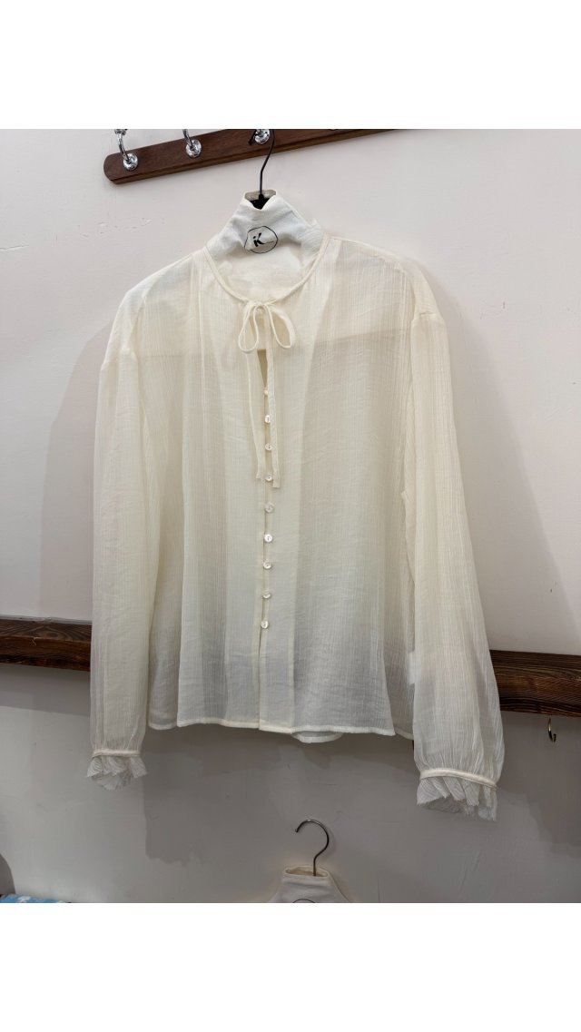 TOP60417009 溫柔米白肌理皺紋飄帶襯衫