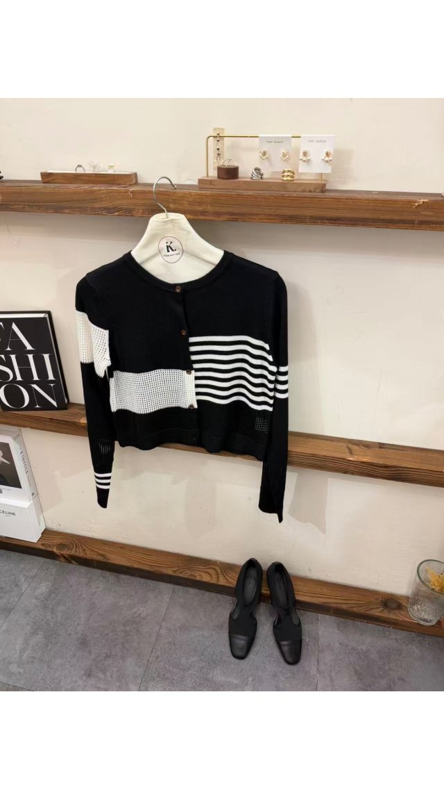 Kn60404004 時尚個性不對稱條紋鏤空針織開衫