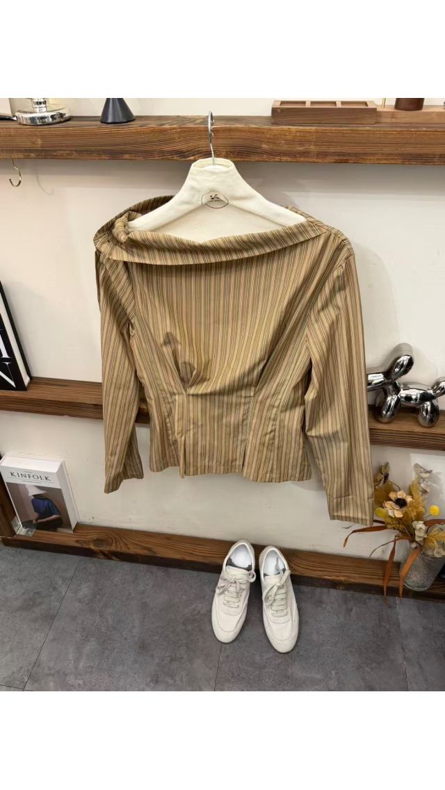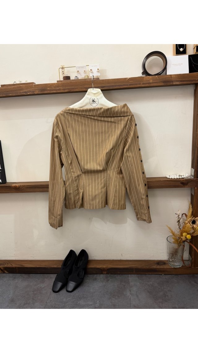 Top60408001 復古不規則斜領條紋長袖襯衫