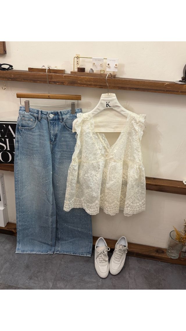 Top60404013 法式浪漫立體刺繡蕾絲 V 領無袖娃娃衫