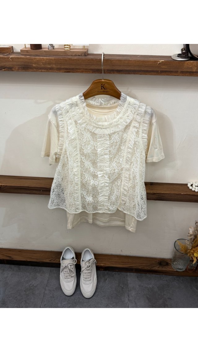 TOP60417003 法式浪漫鏤空蕾絲拼接全麻襯衫