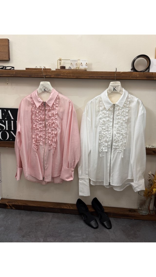 Top60404017 法式浪漫荷葉邊拉鍊翻領長袖襯衫外套
