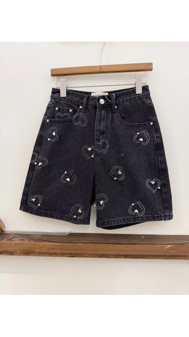 SP60414005 甜酷愛心燙鑽高腰牛仔短褲