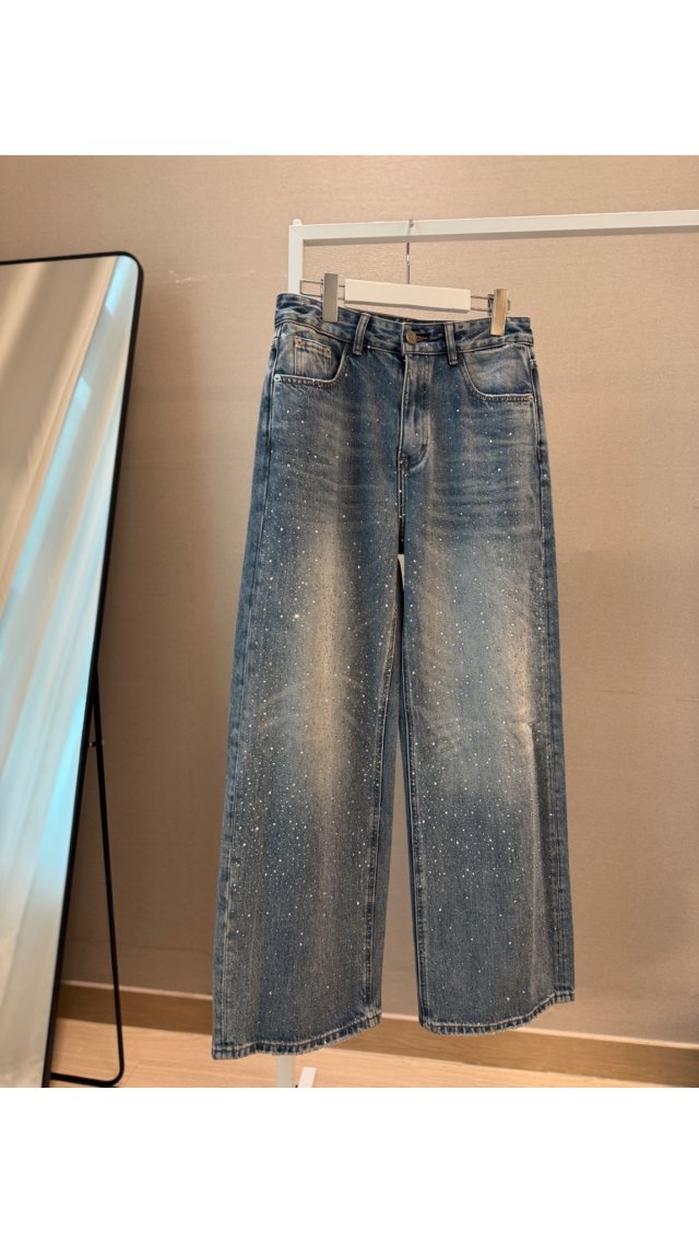 JN60318005 淺藍做舊閃石柔軟棉質闊腿牛仔褲