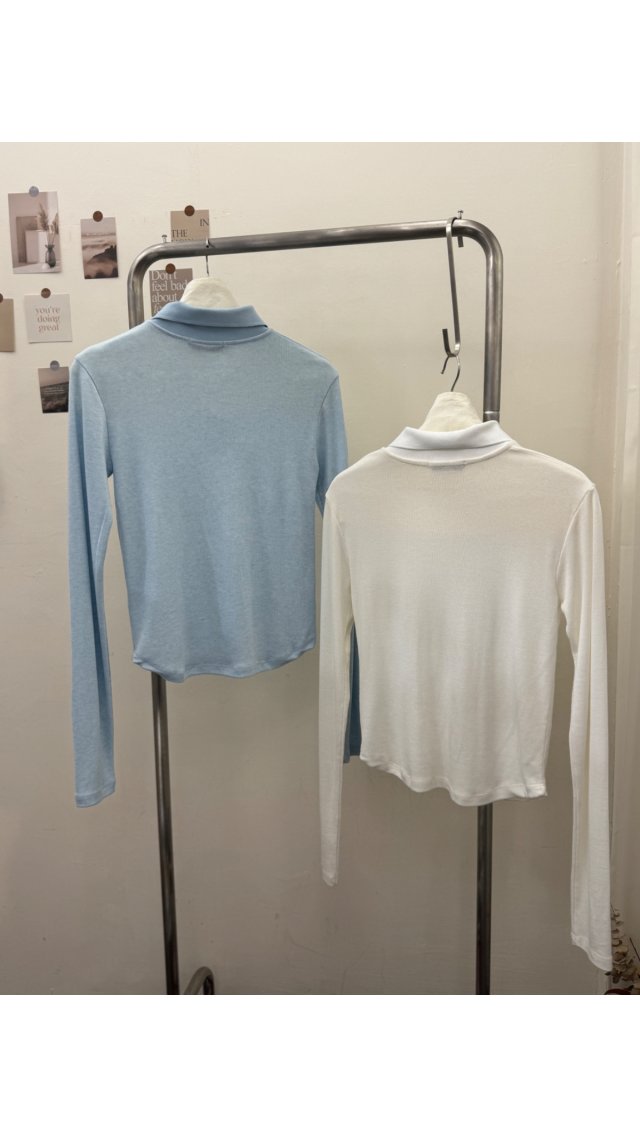 Top60322004 柔軟坑條長袖Polo領短款上衣