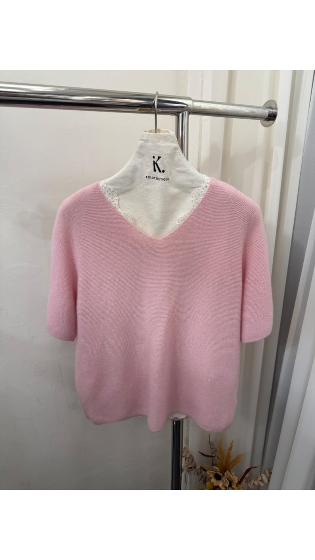 KN60310002粉色V領100%山Cashmere四分袖針織TOP