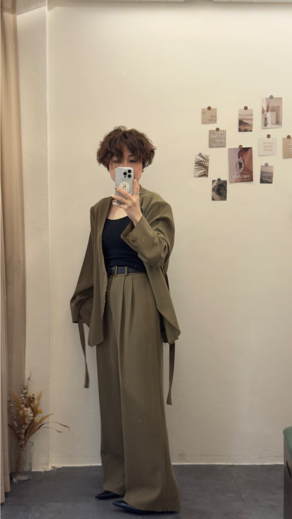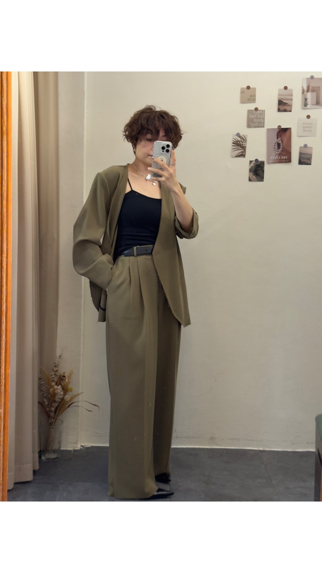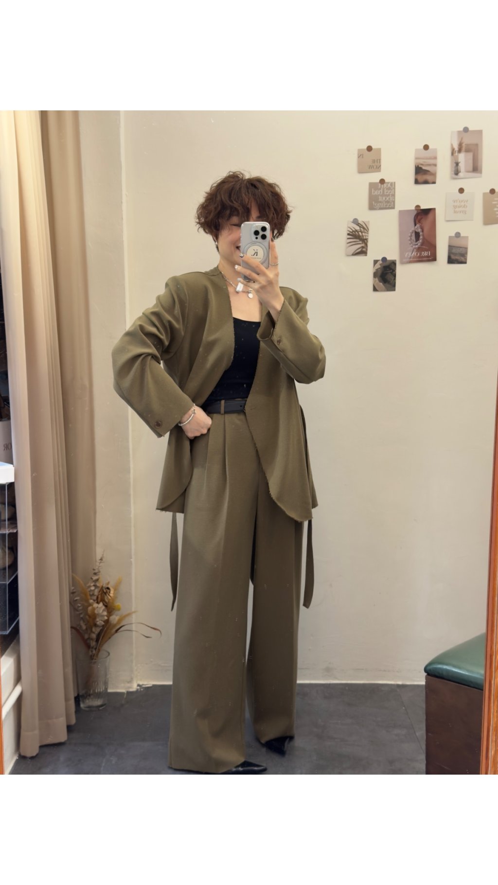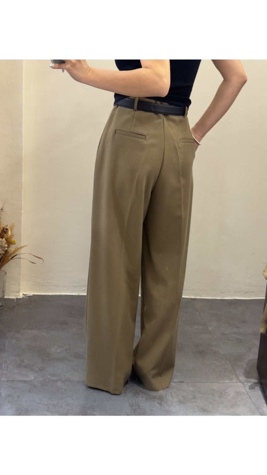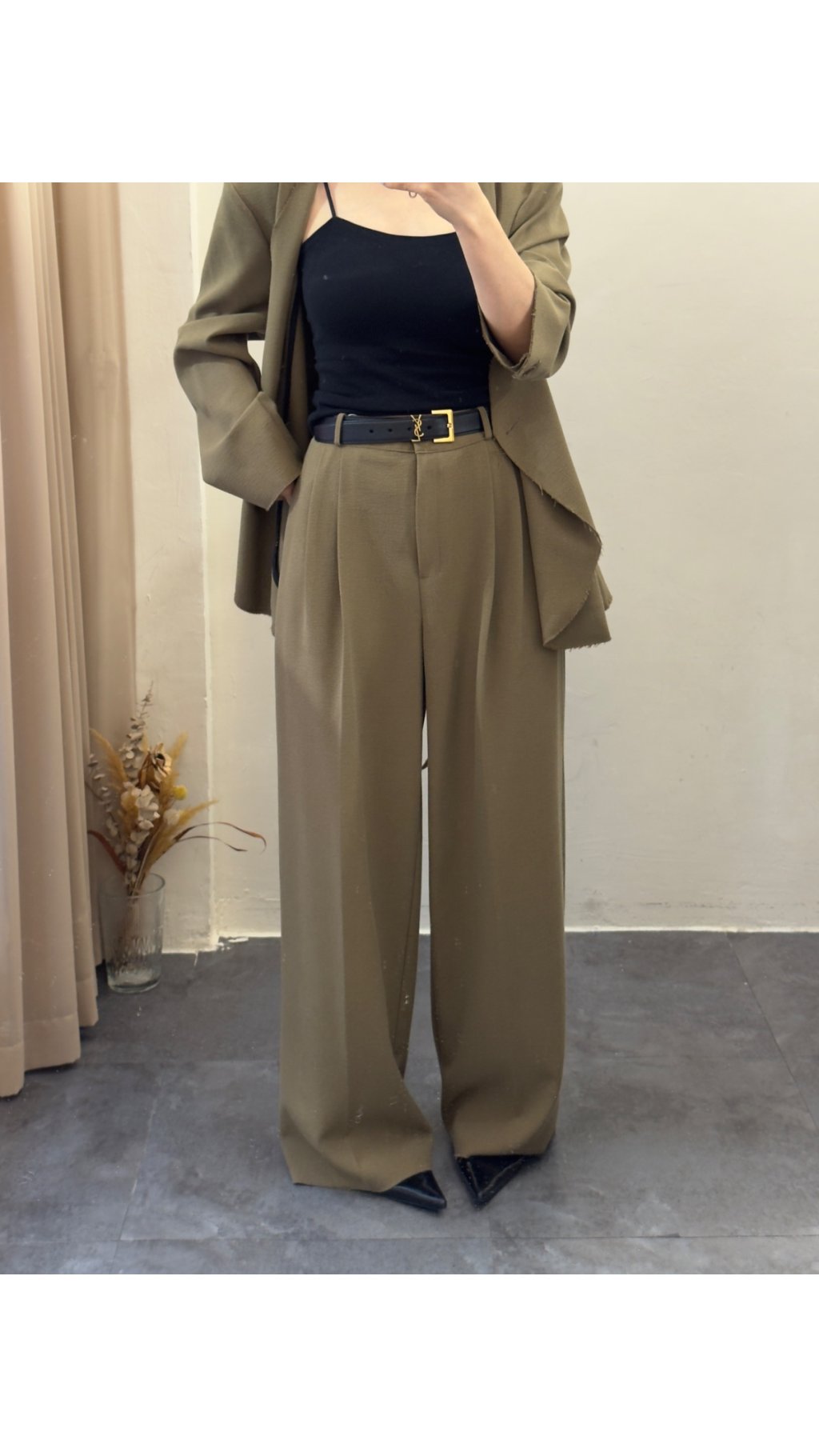 選用垂墜感極佳嘅西裝面料,觸感順滑柔軟,帶有適度挺括感,既能撐起闊腿版型,又唔會過於厚重。面料唔易起皺,日常著免熨燙,打理超方便,係懶人都可以著得靚嘅實用款。表面呈啞光質感,軍綠色溫柔復古,黑色沉穩高級,兩色都充滿高級質感,唔會有廉價塑膠感。