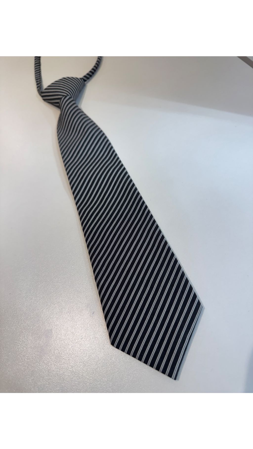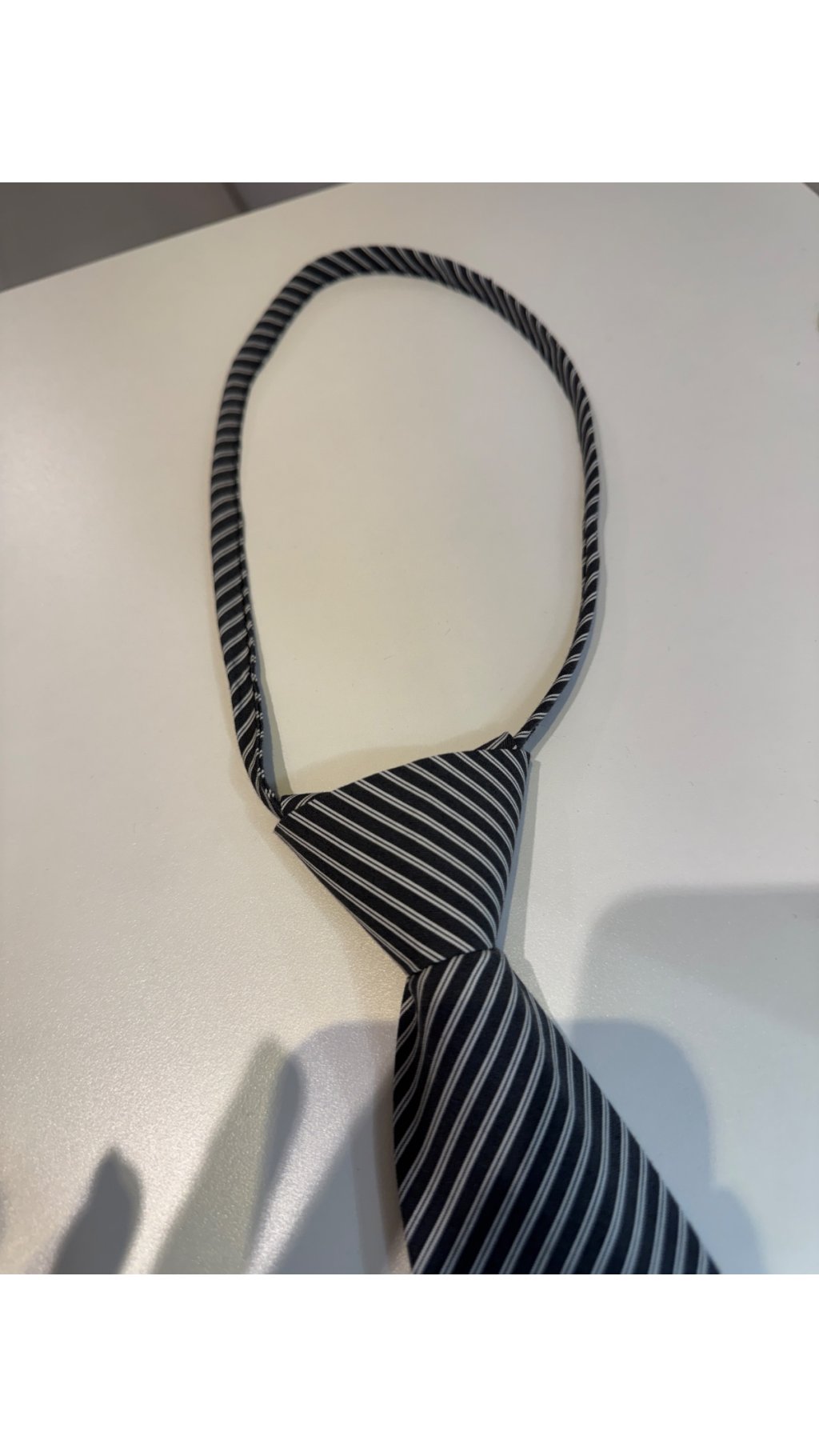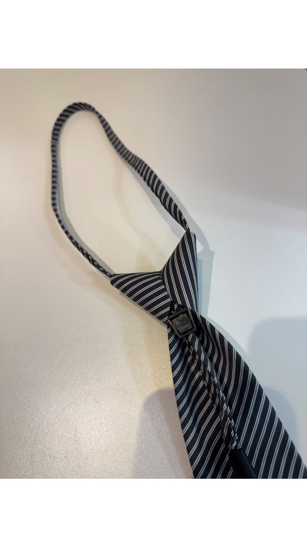 黑底白條懶人免打領呔,復古學院風設計,係襯衫搭配嘅點睛飾品。