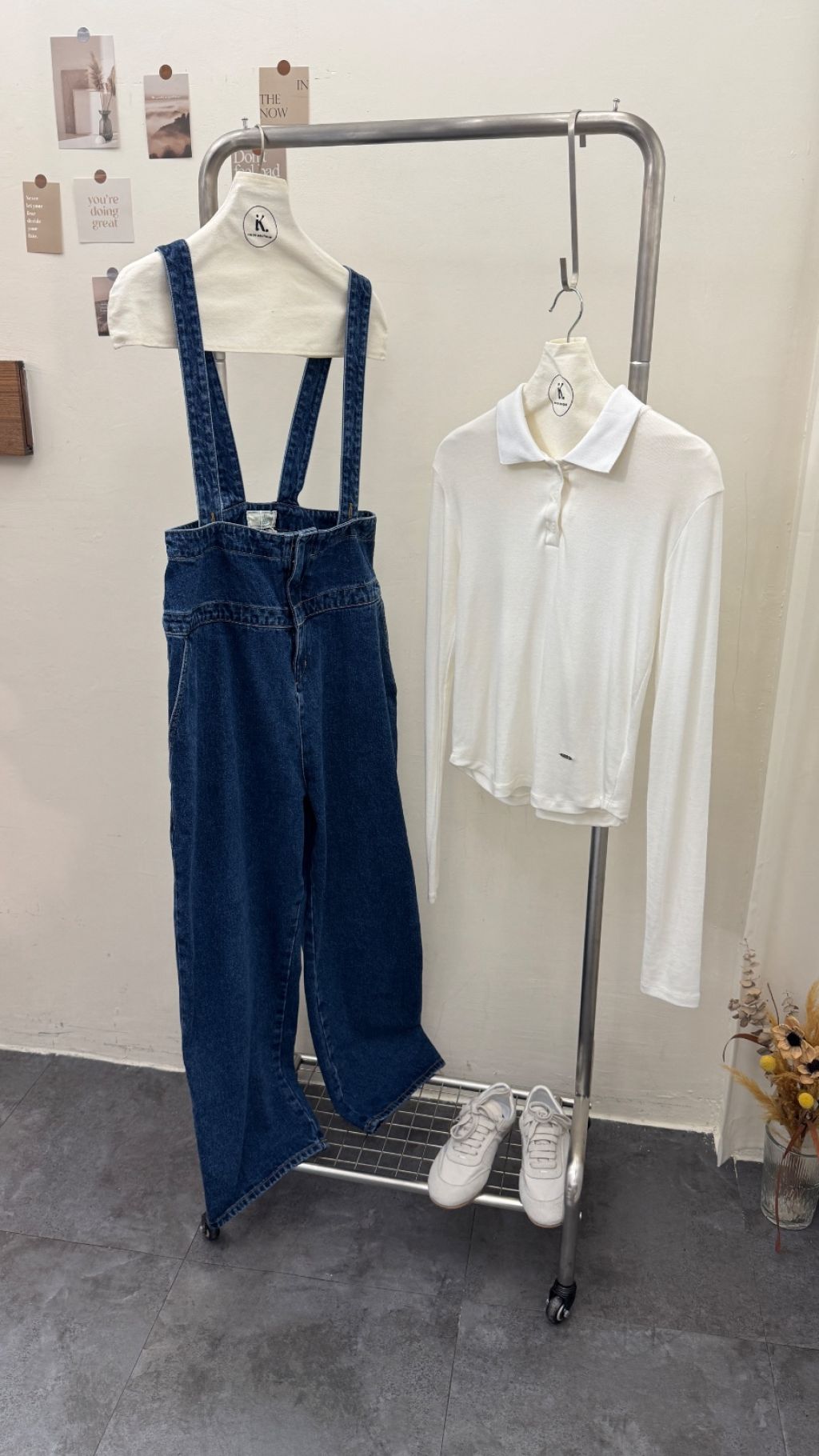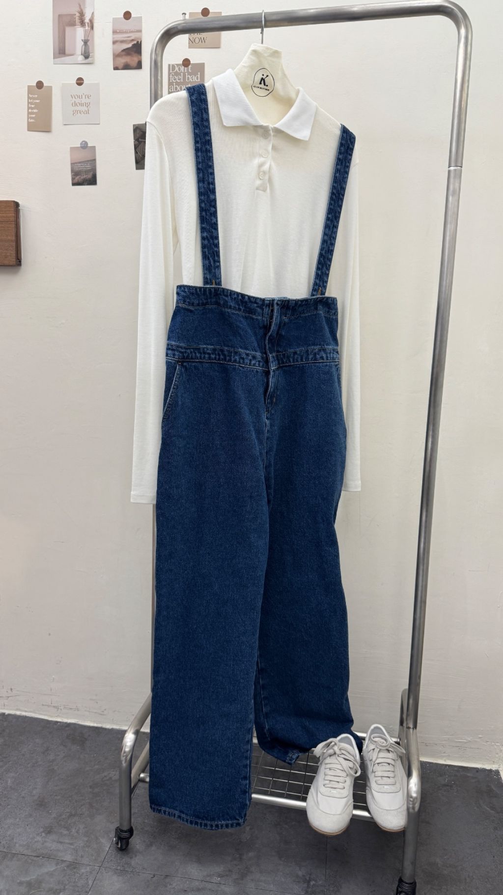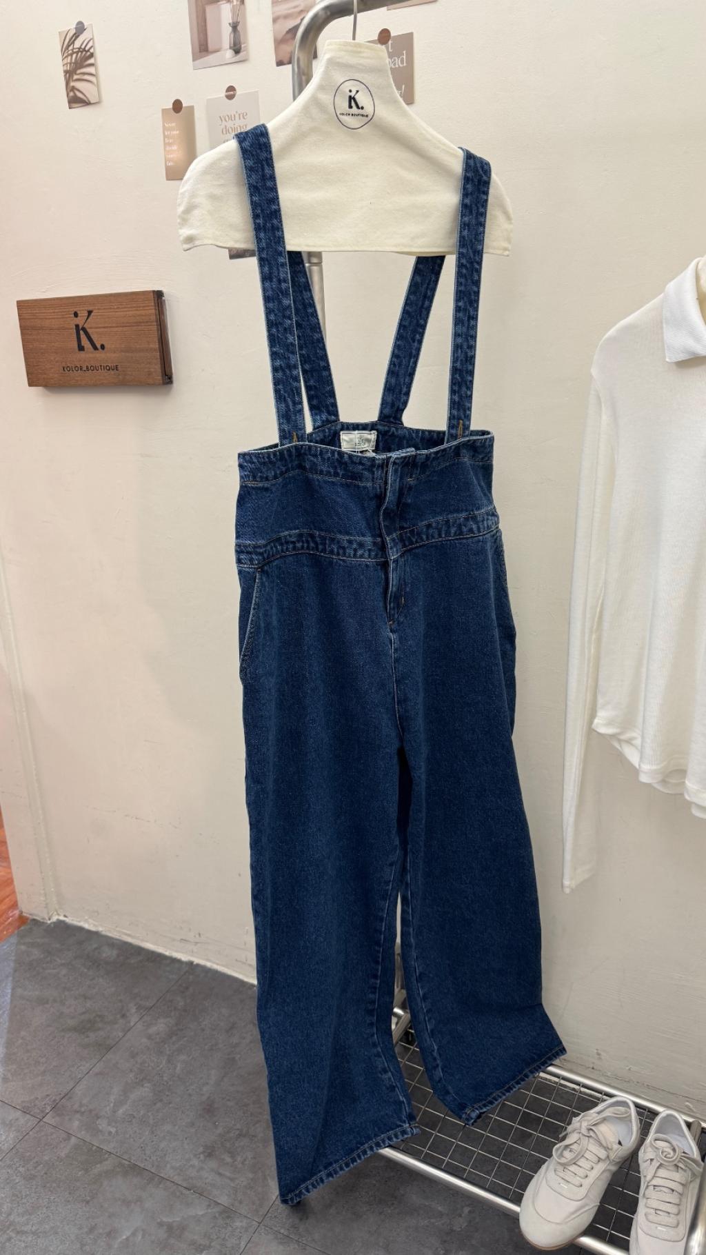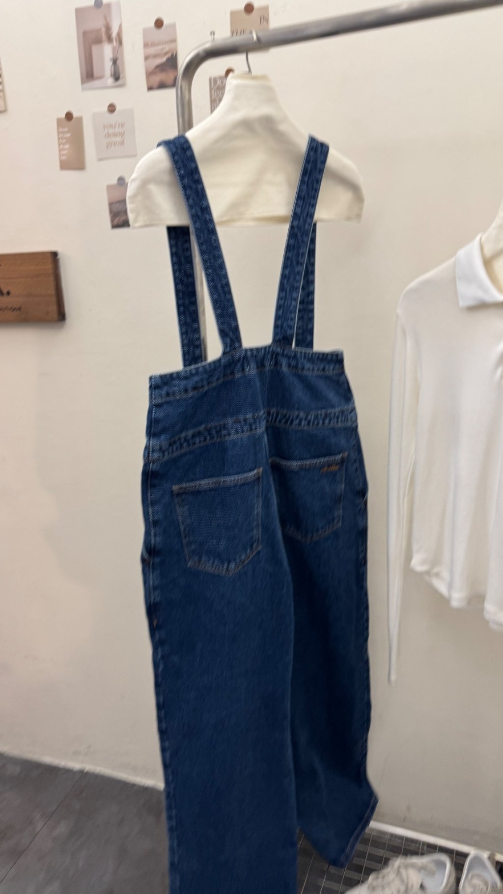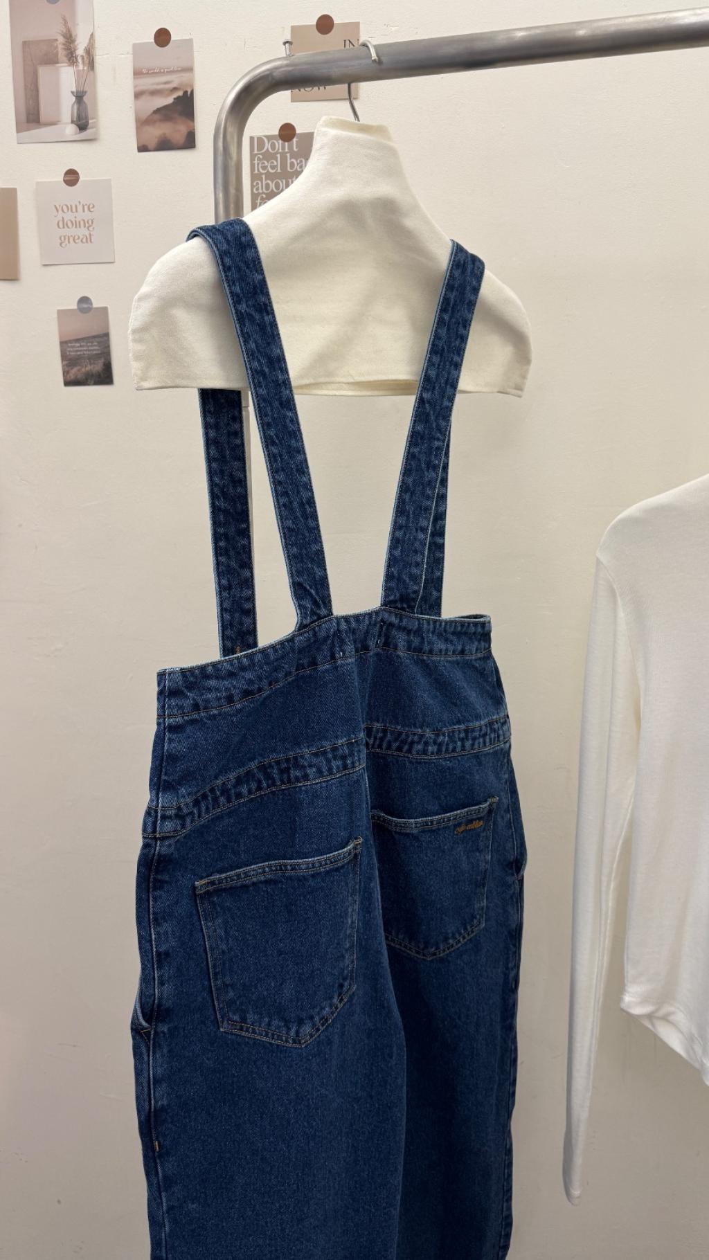 深藍復古闊腿牛仔吊帶褲,高腰背帶設計,係春日減齡慵懶嘅必備單品。