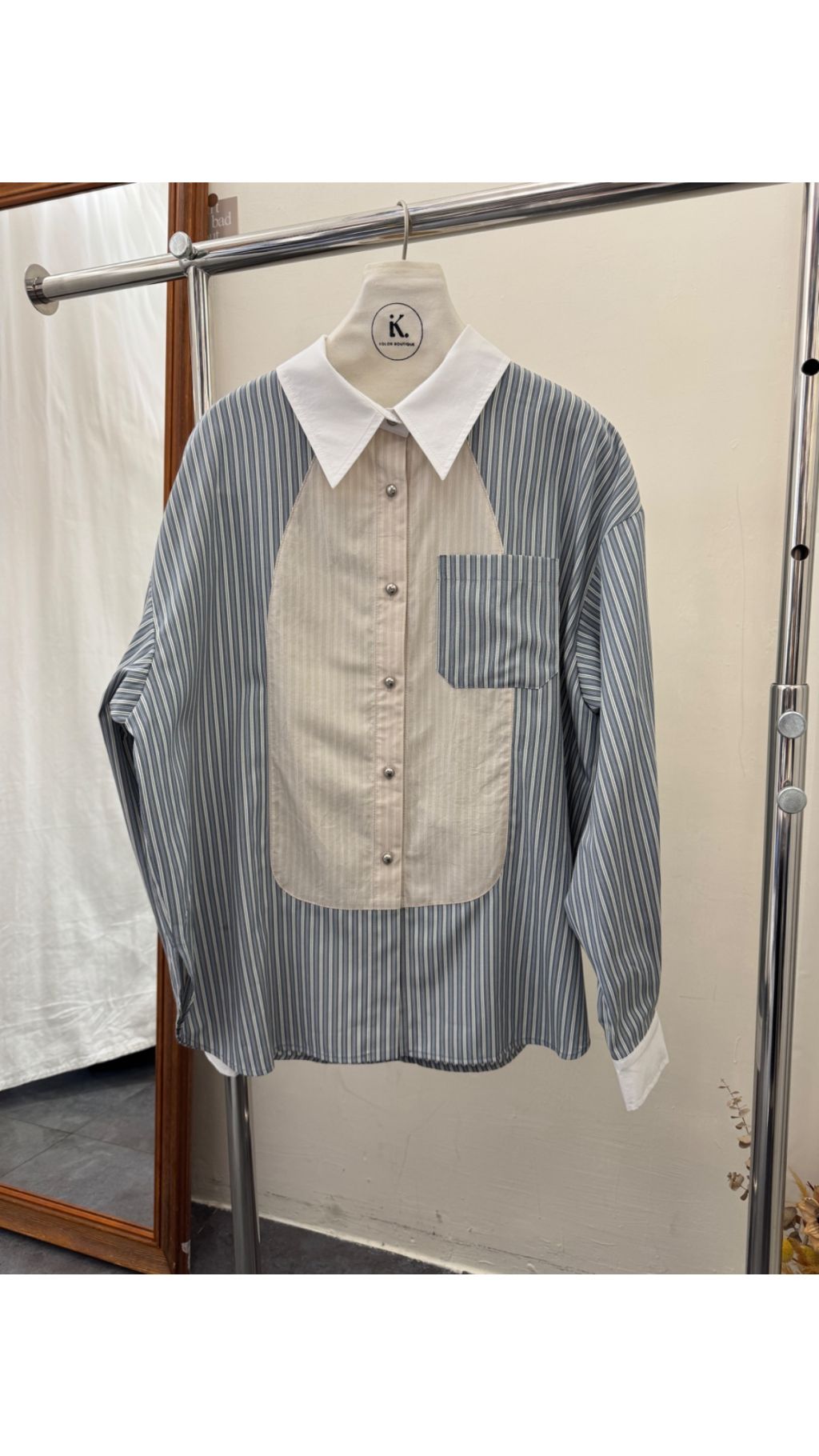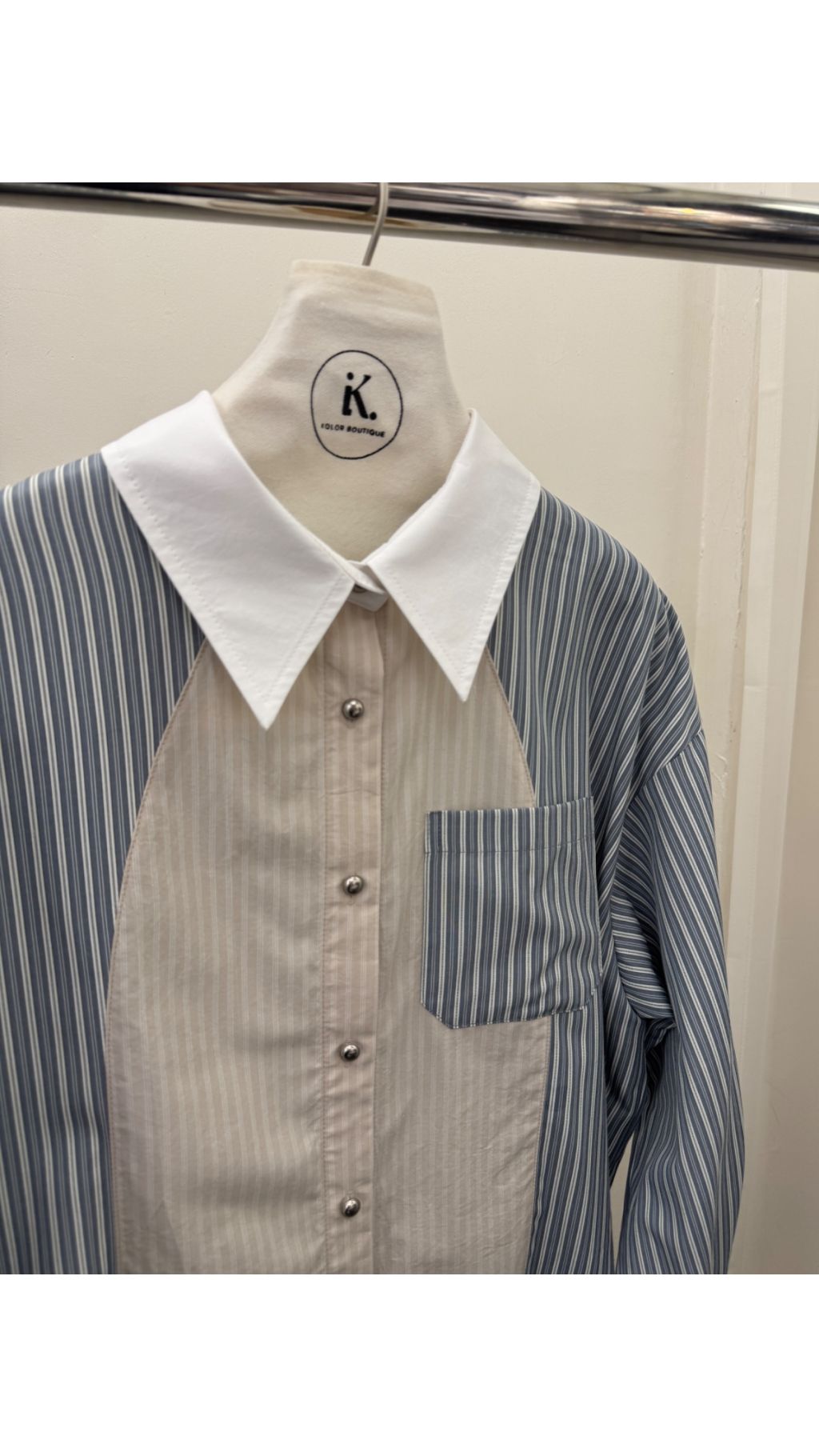 • 不規則撞色拼接:前片採用淺杏色豎條與灰藍白豎條不規則拼接,後片則是滿版灰藍白直條,層次感豐富,打破傳統條紋襯衫的單調感。