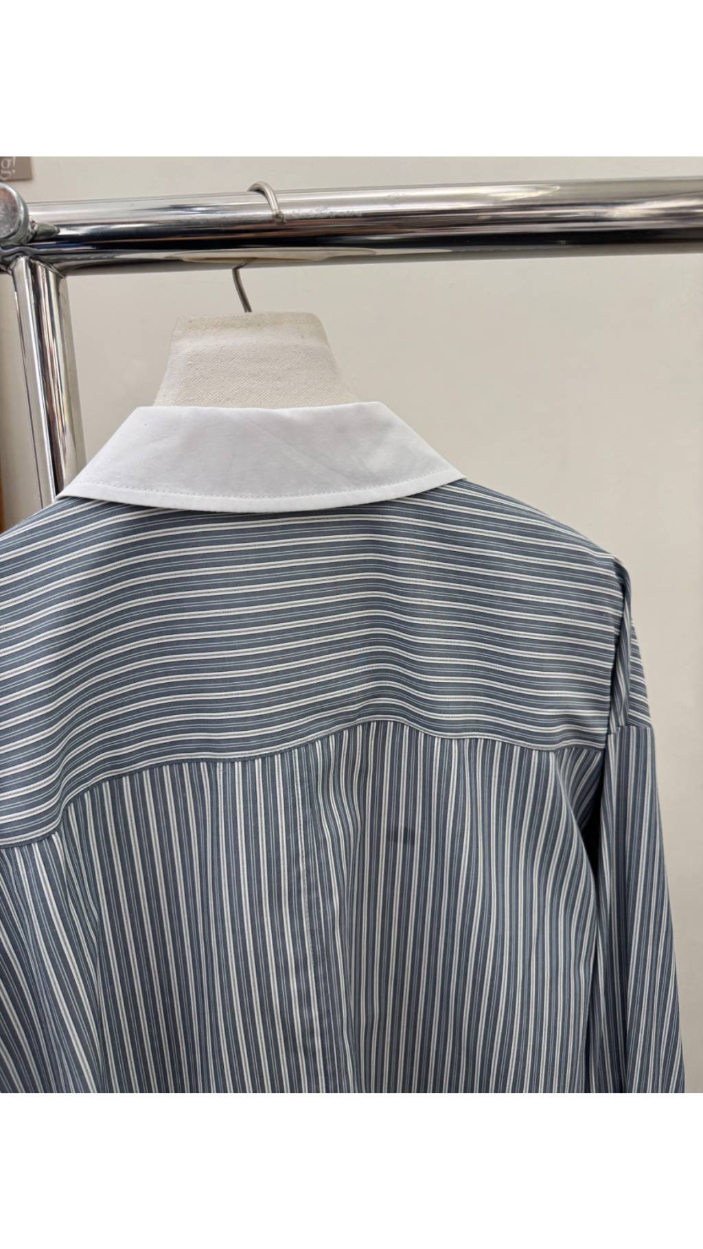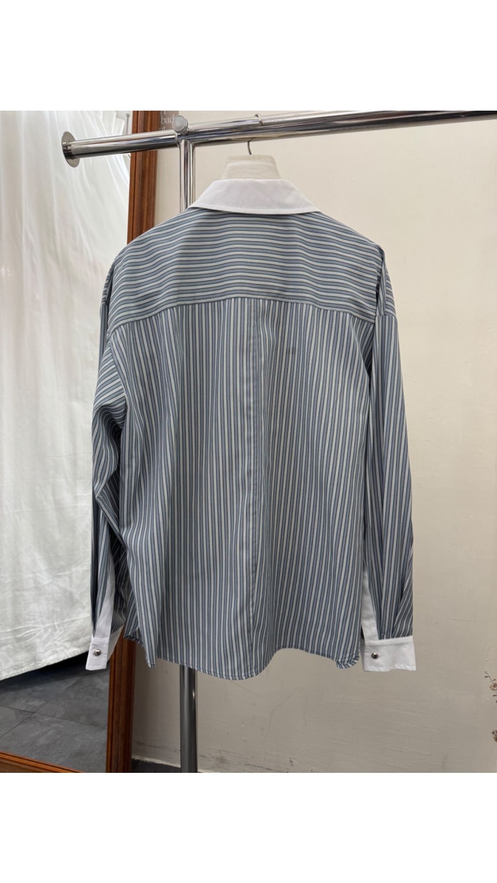 • 白色撞色領+袖口:經典白色翻領與袖口,與灰藍條紋形成鮮明對比,提亮整體色調,同時修飾頸部與手臂線條,增添知性氣質。