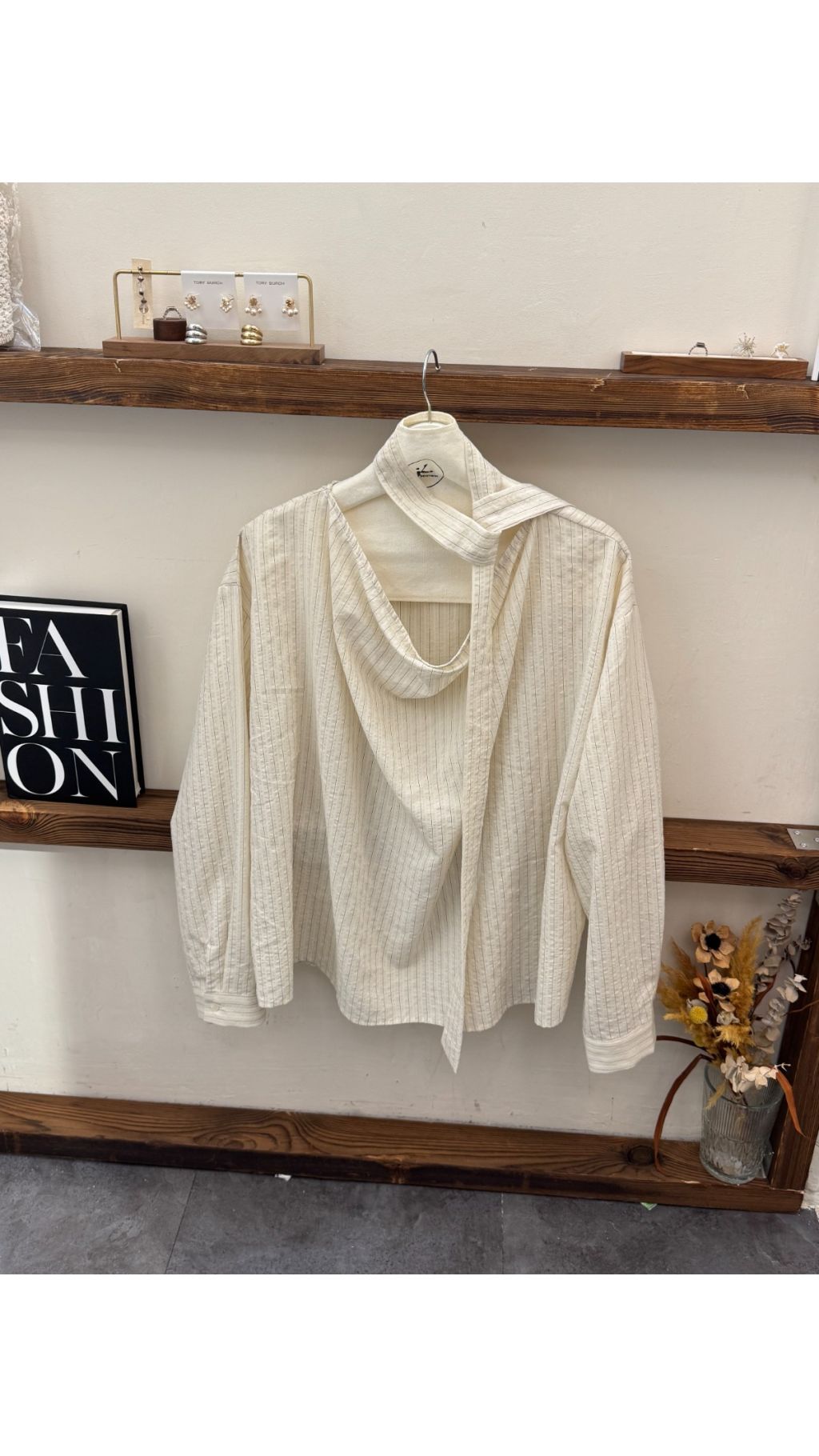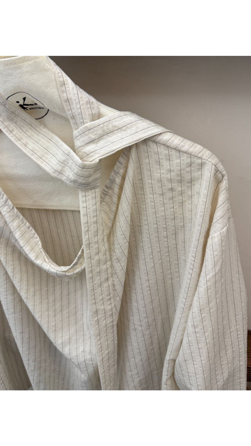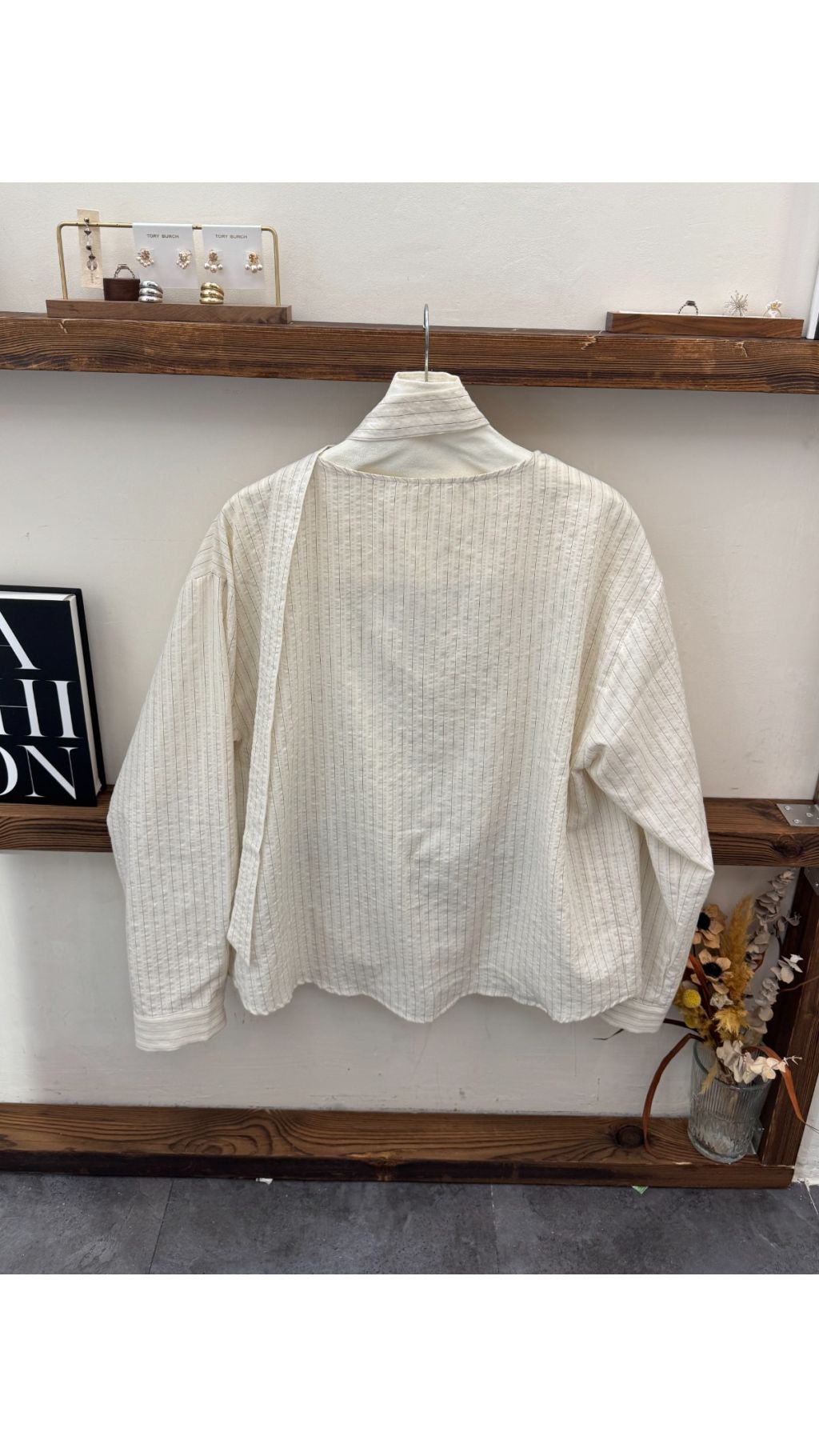 - 細條紋肌理:米白基底搭配淺灰細條紋,視覺上顯瘦又有層次感,肌理感面料帶來獨特觸感,復古又耐看。