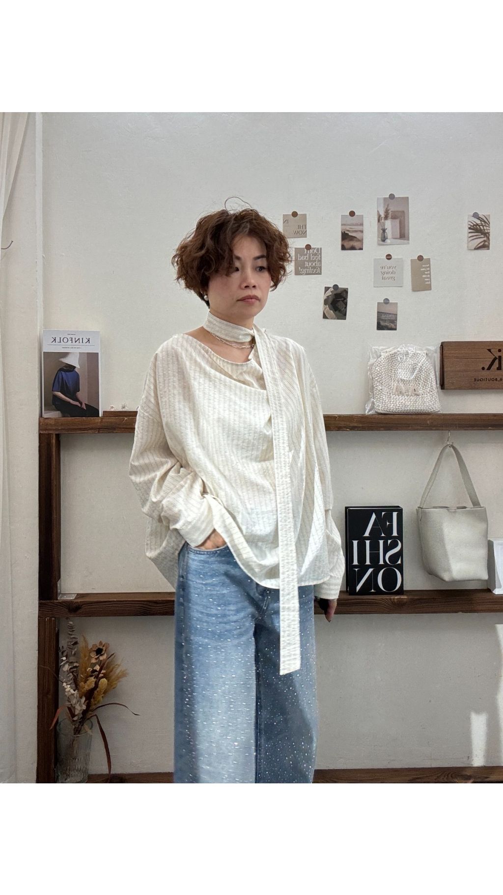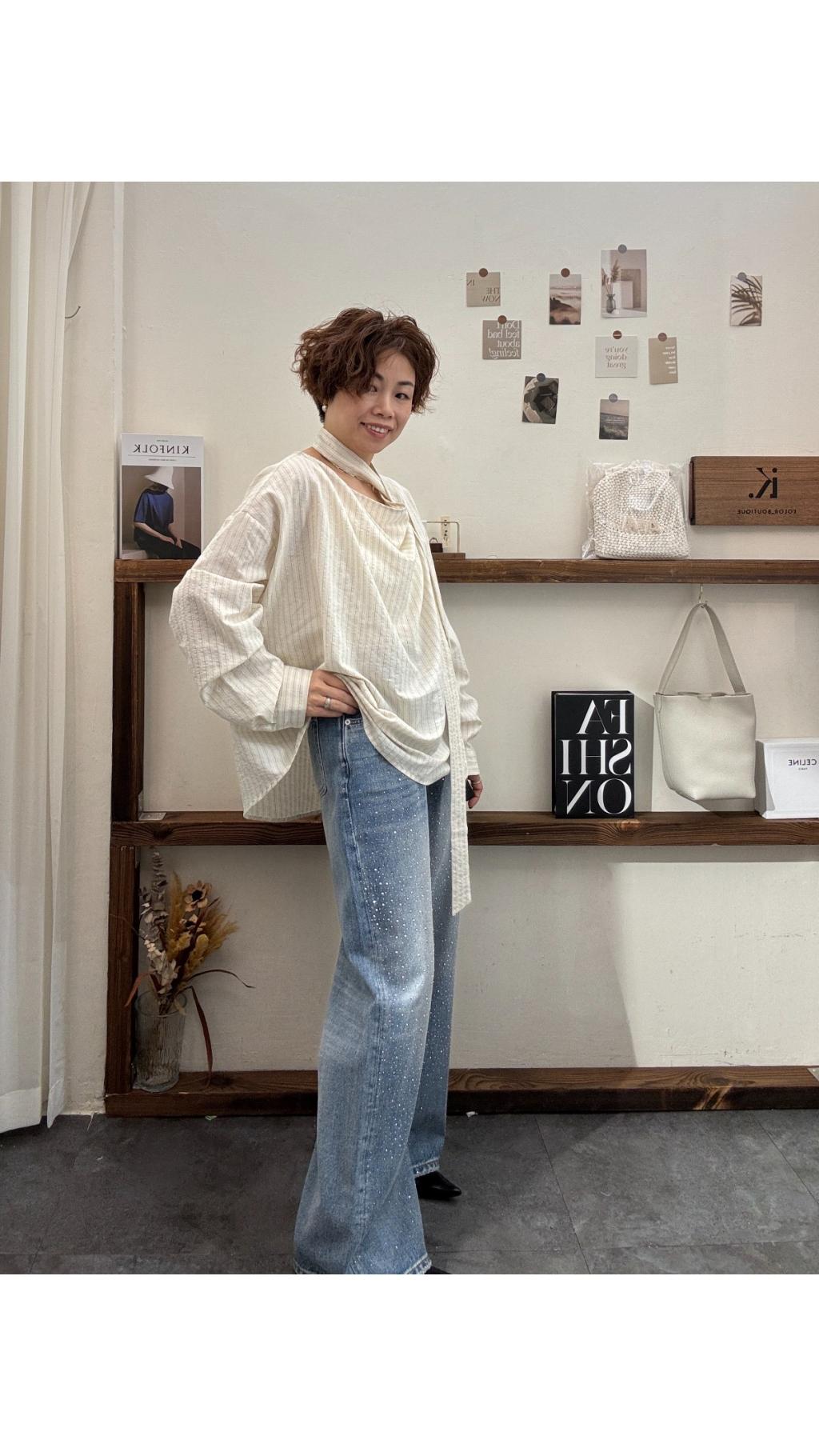 🔹 穿搭指南- 慵懶休閒風:搭配高腰牛仔闊腿褲 + 小白鞋,將下擺一邊塞進褲腰,隨性又顯比例,適合週末出遊或逛市集。