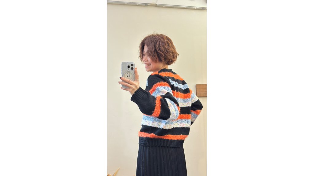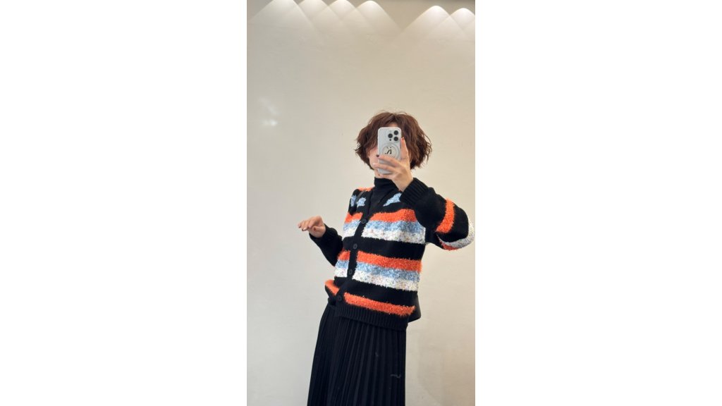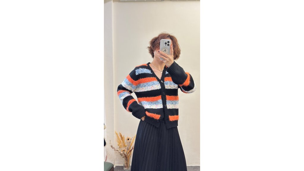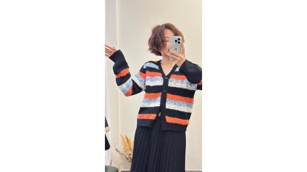 KN004-JS 毛絨混紡黑底橙紅條紋針織外套