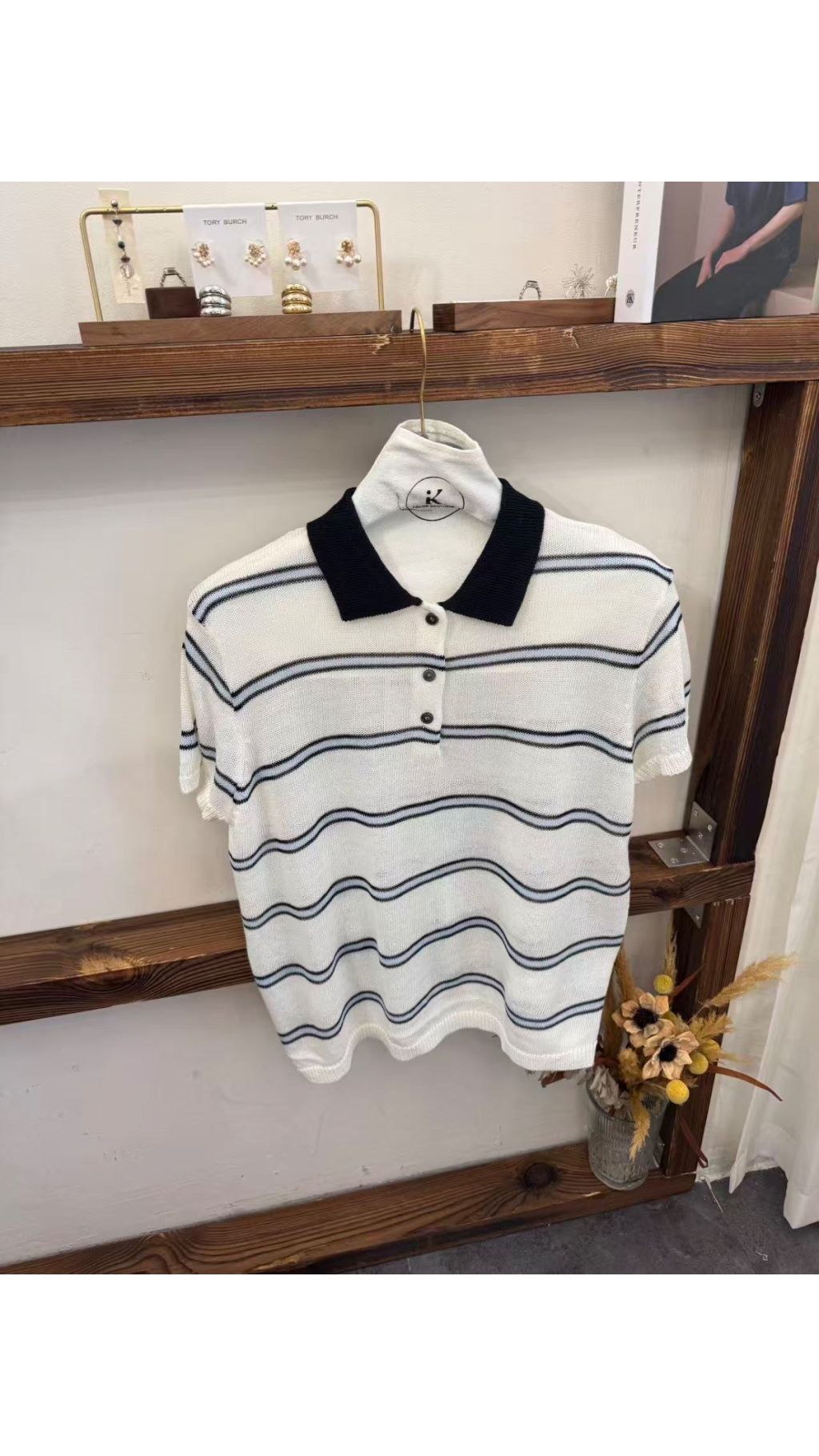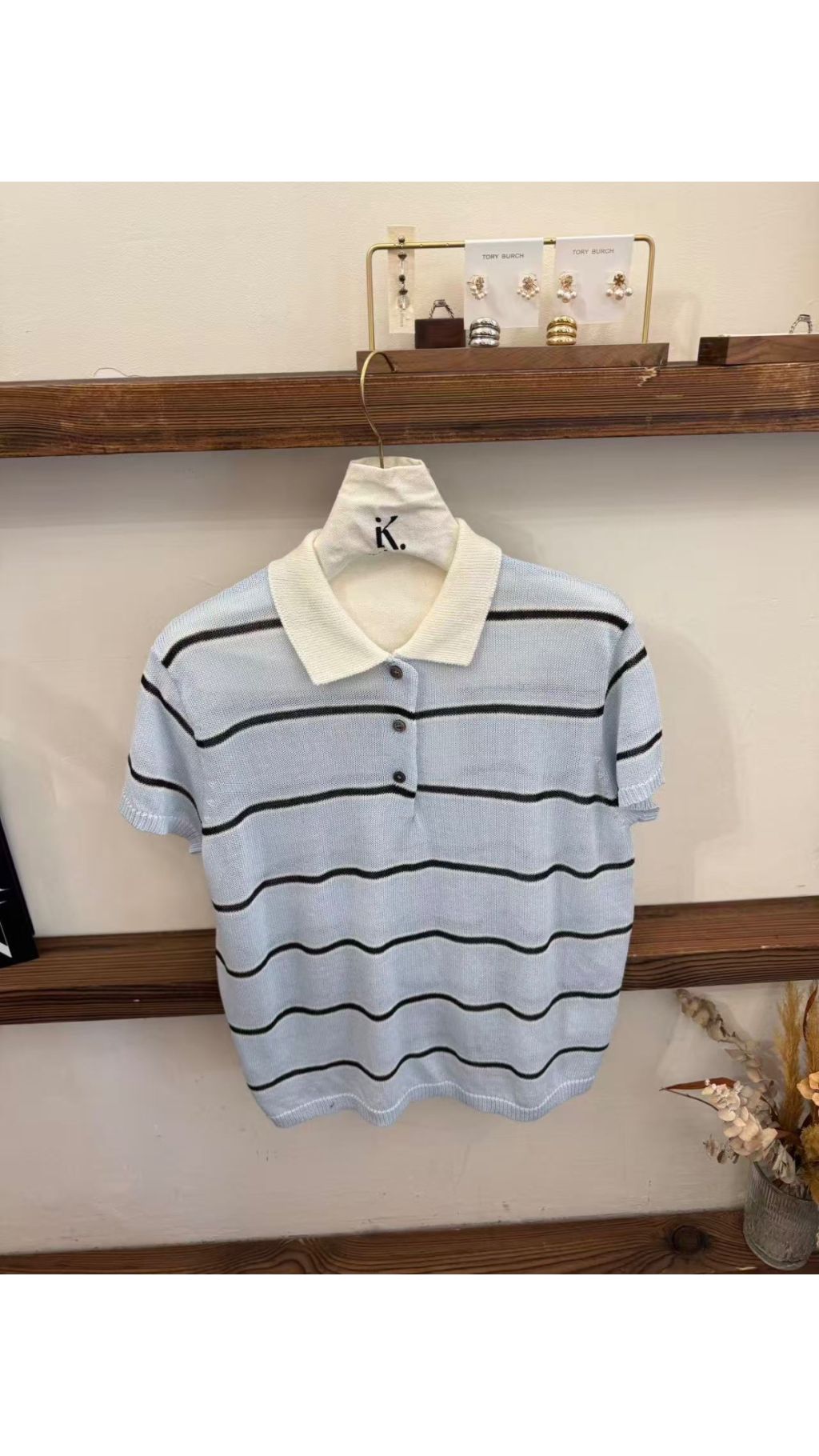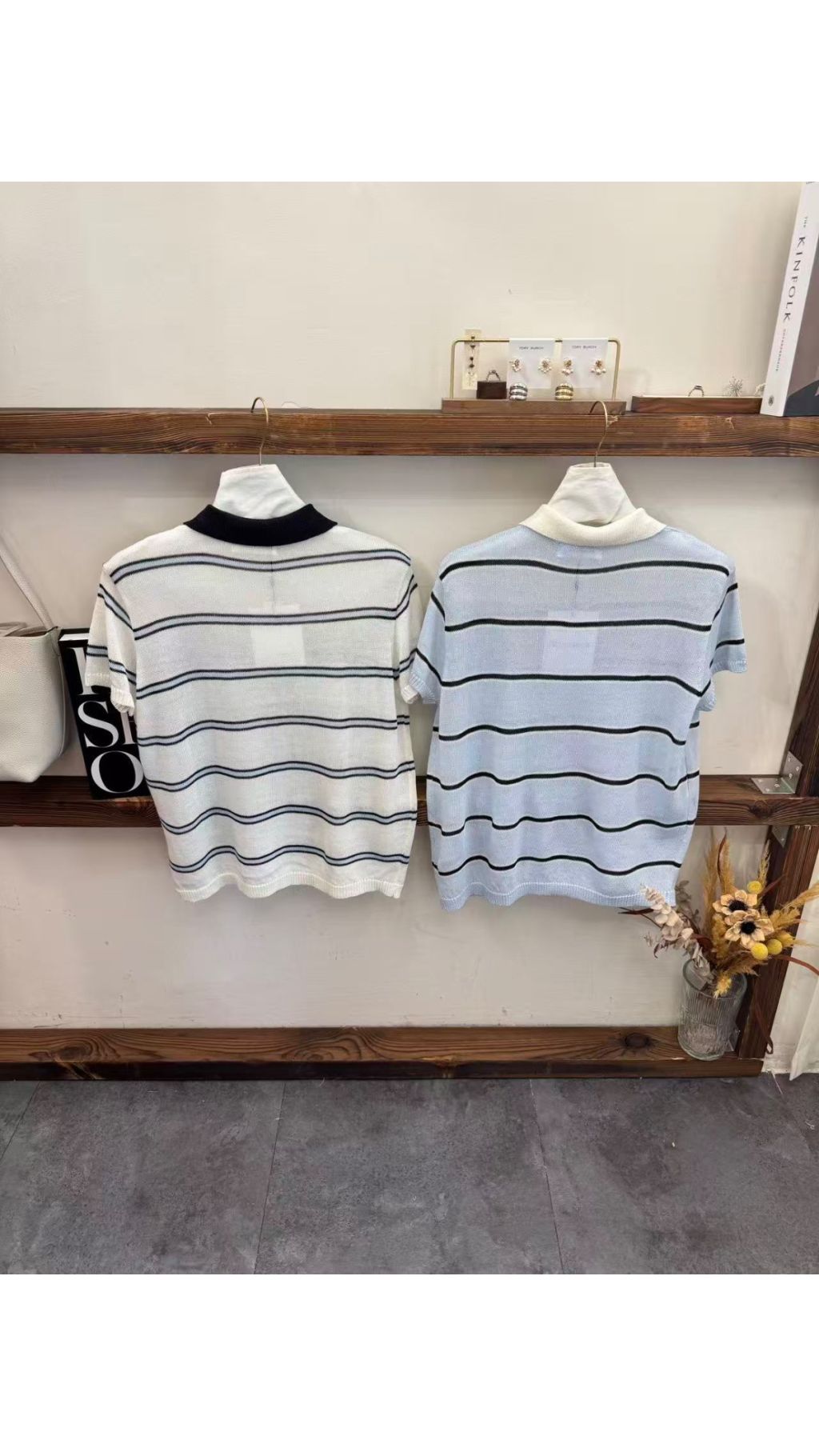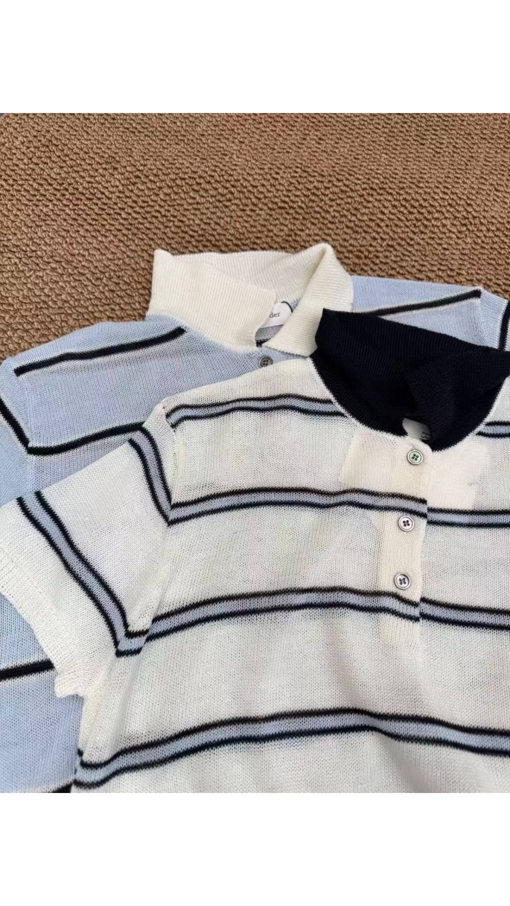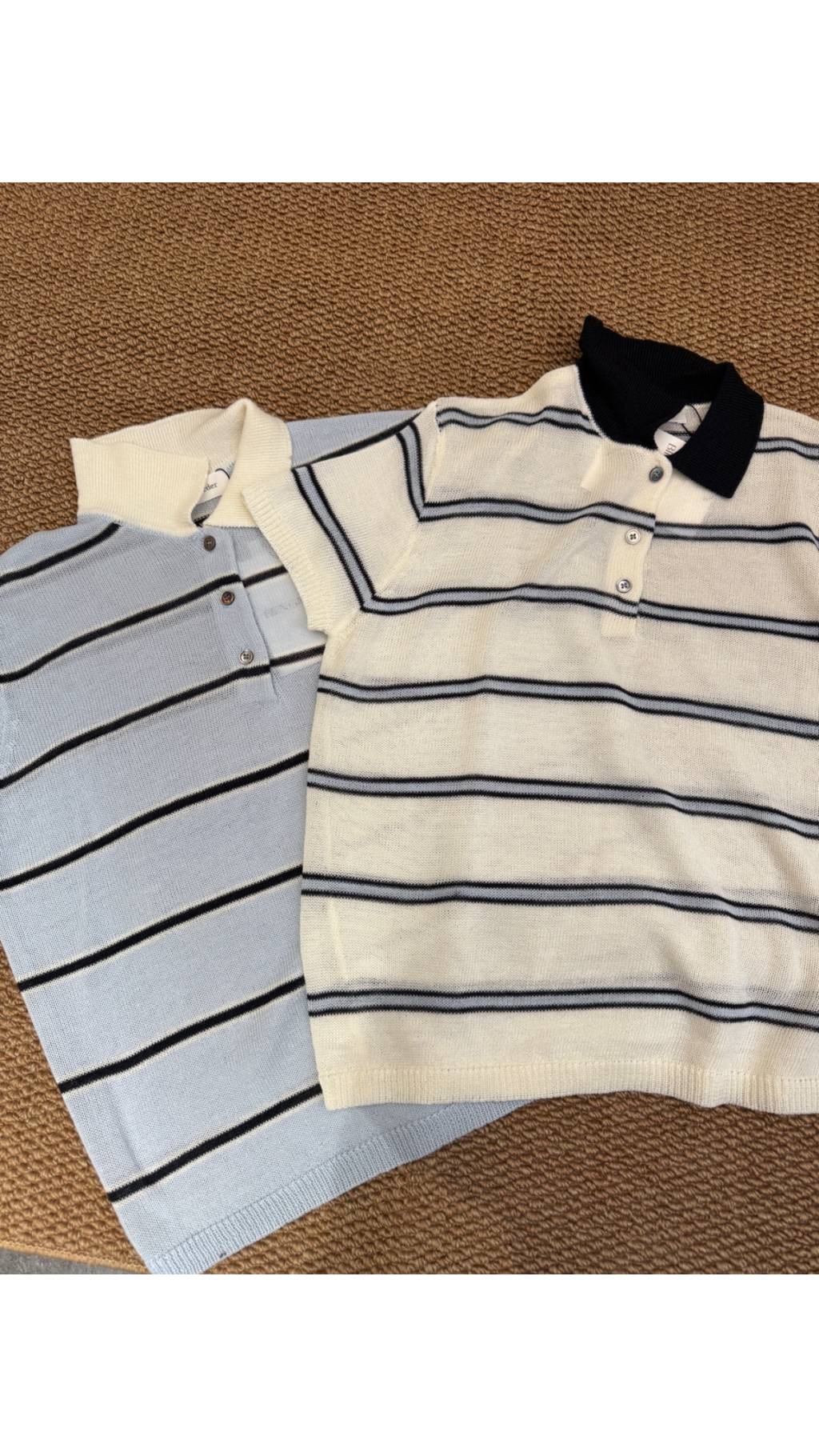 淺藍條紋款:淺藍基底 + 黑色細條紋 + 白色翻領,清新元氣,充滿春日感,顯白又減齡。