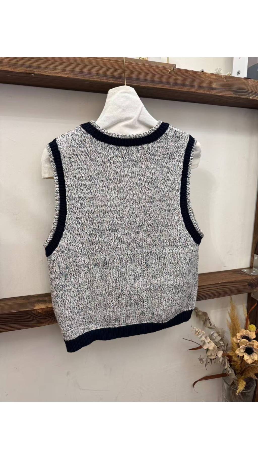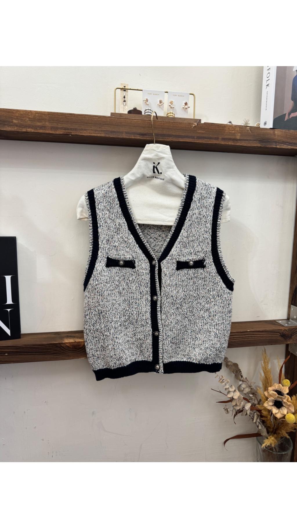 混色花紗針織 + 黑色撞色包邊,融合了小香風的精致與針織的溫柔,短款版型拉高腰線,無論日常疊穿、約會還是職場穿搭,都能輕鬆營造出高級層次感。