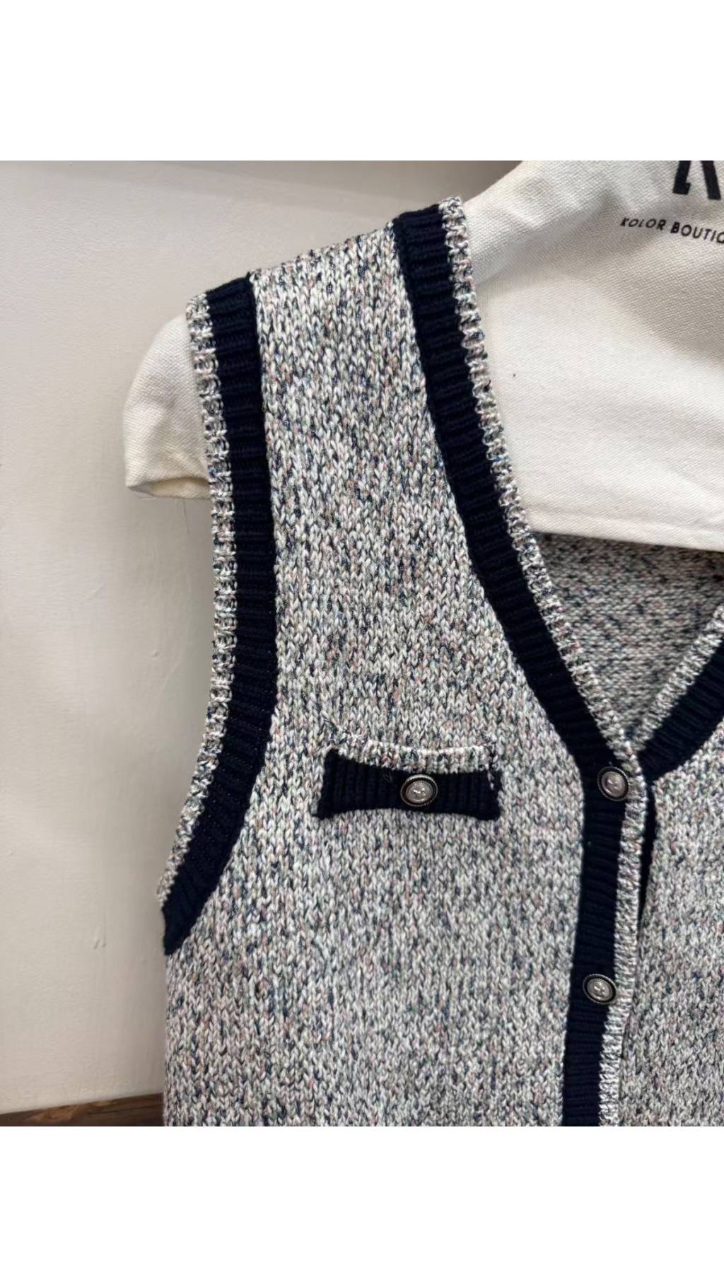 黑色撞色包邊:V 領、門襟、袖口與下擺均以黑色羅紋包邊,對比鮮明,強化輪廓線條,增添小香風的優雅氣質。