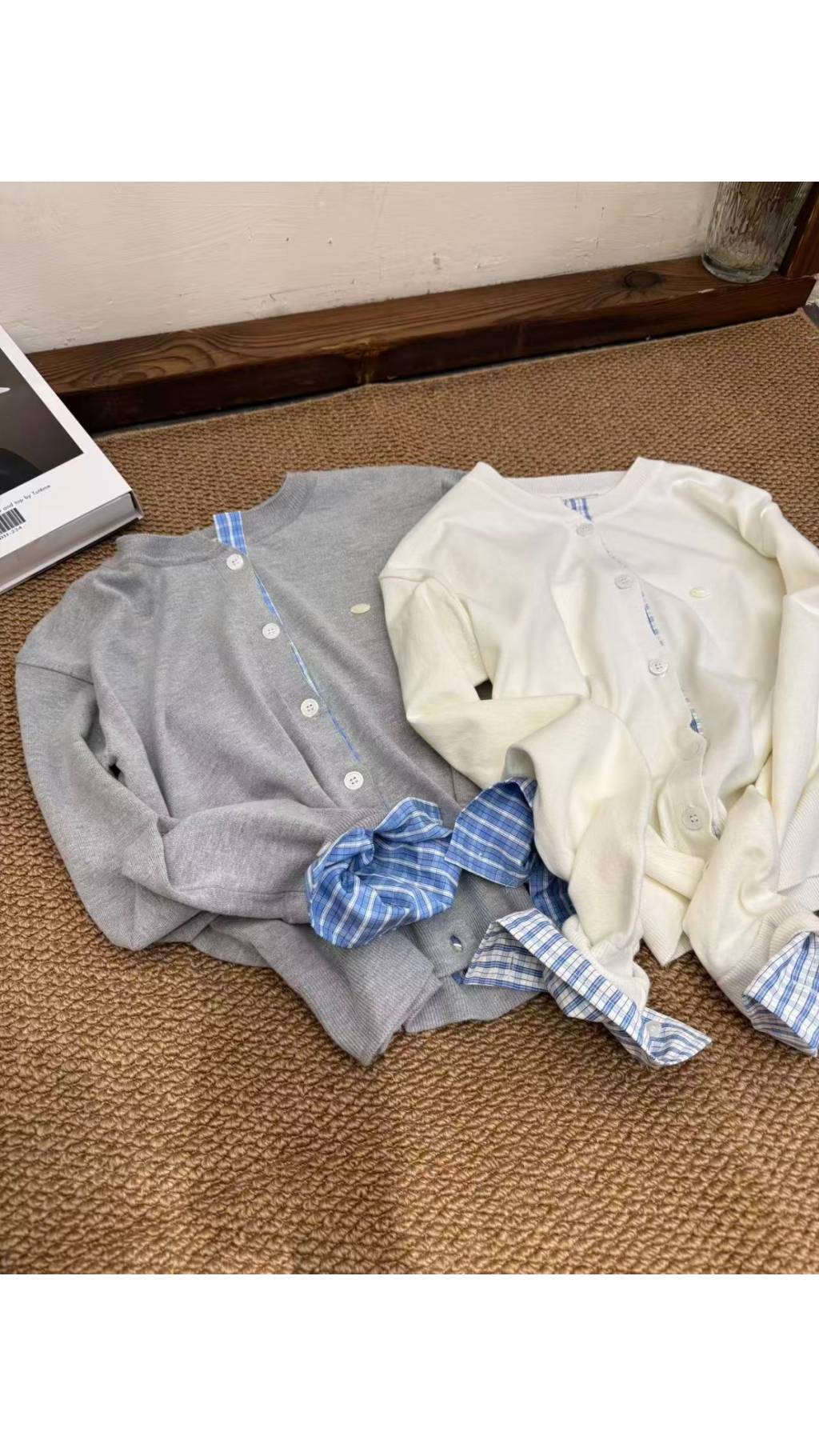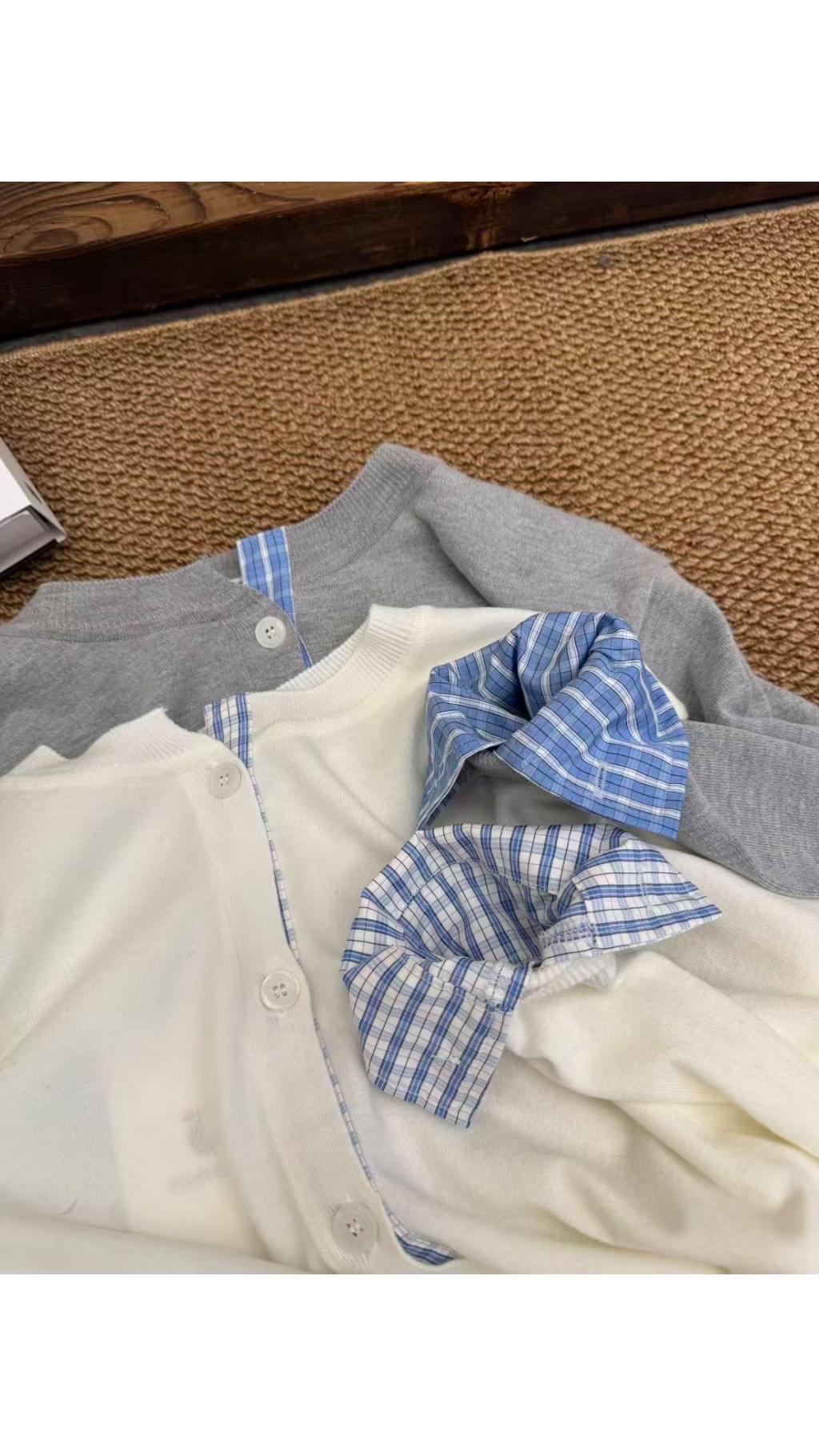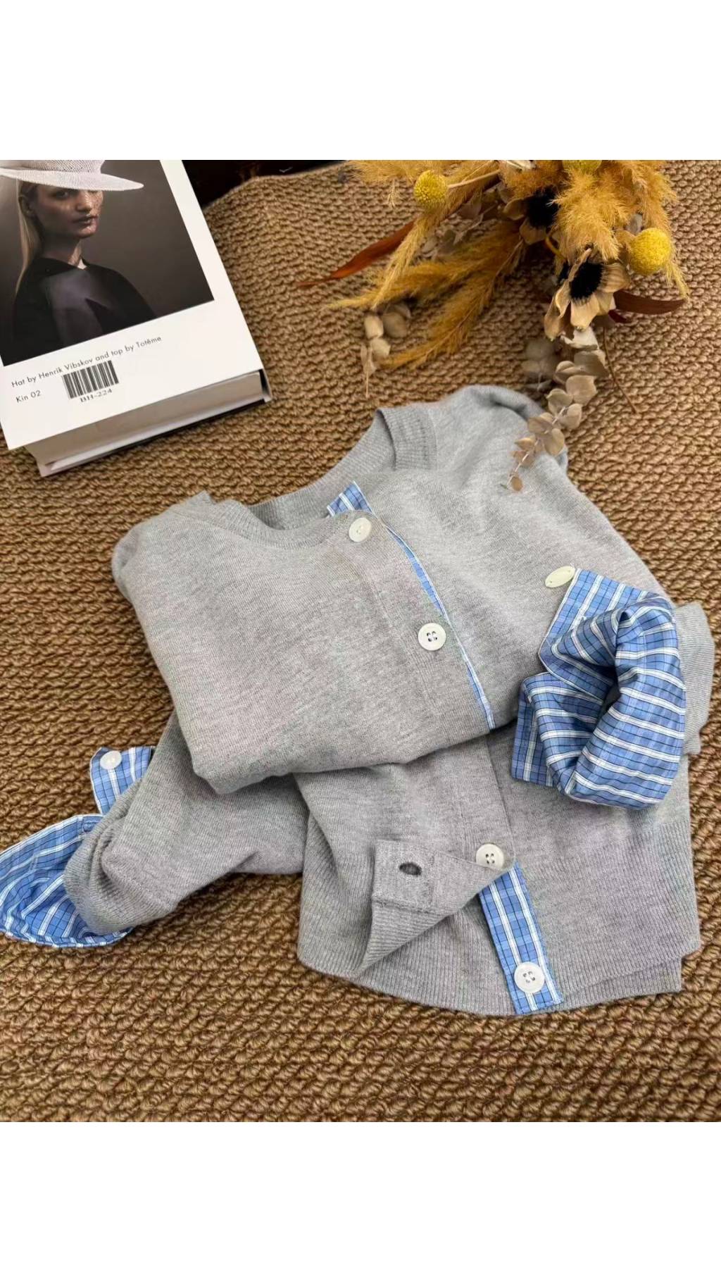 基礎針織開衫 + 藍白格紋襯衫拼接,假兩件設計省去疊穿麻煩,同時營造出豐富層次感,柔軟親膚的面料與利落版型,無論日常通勤、約會還是休閒出遊都能輕鬆駕馭。