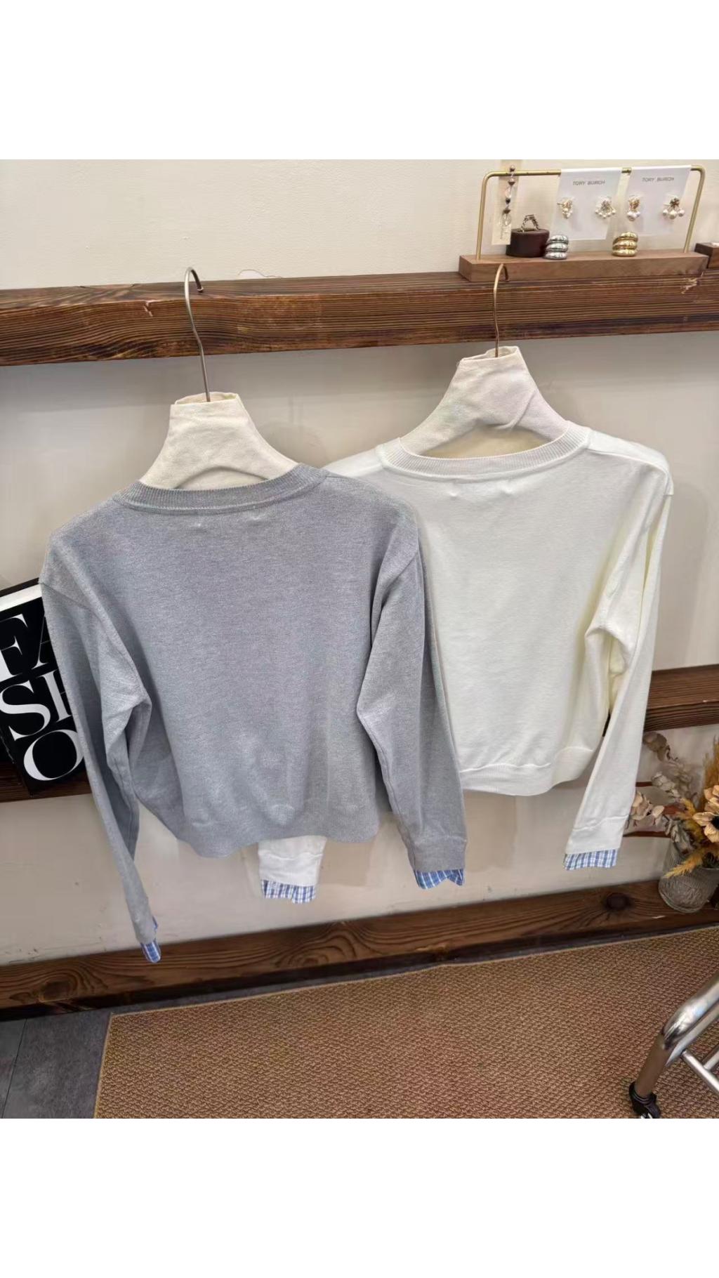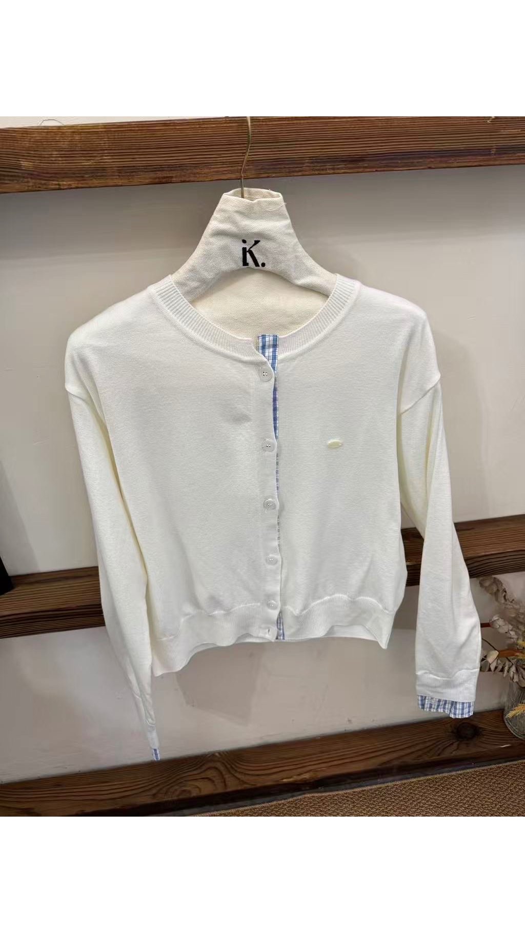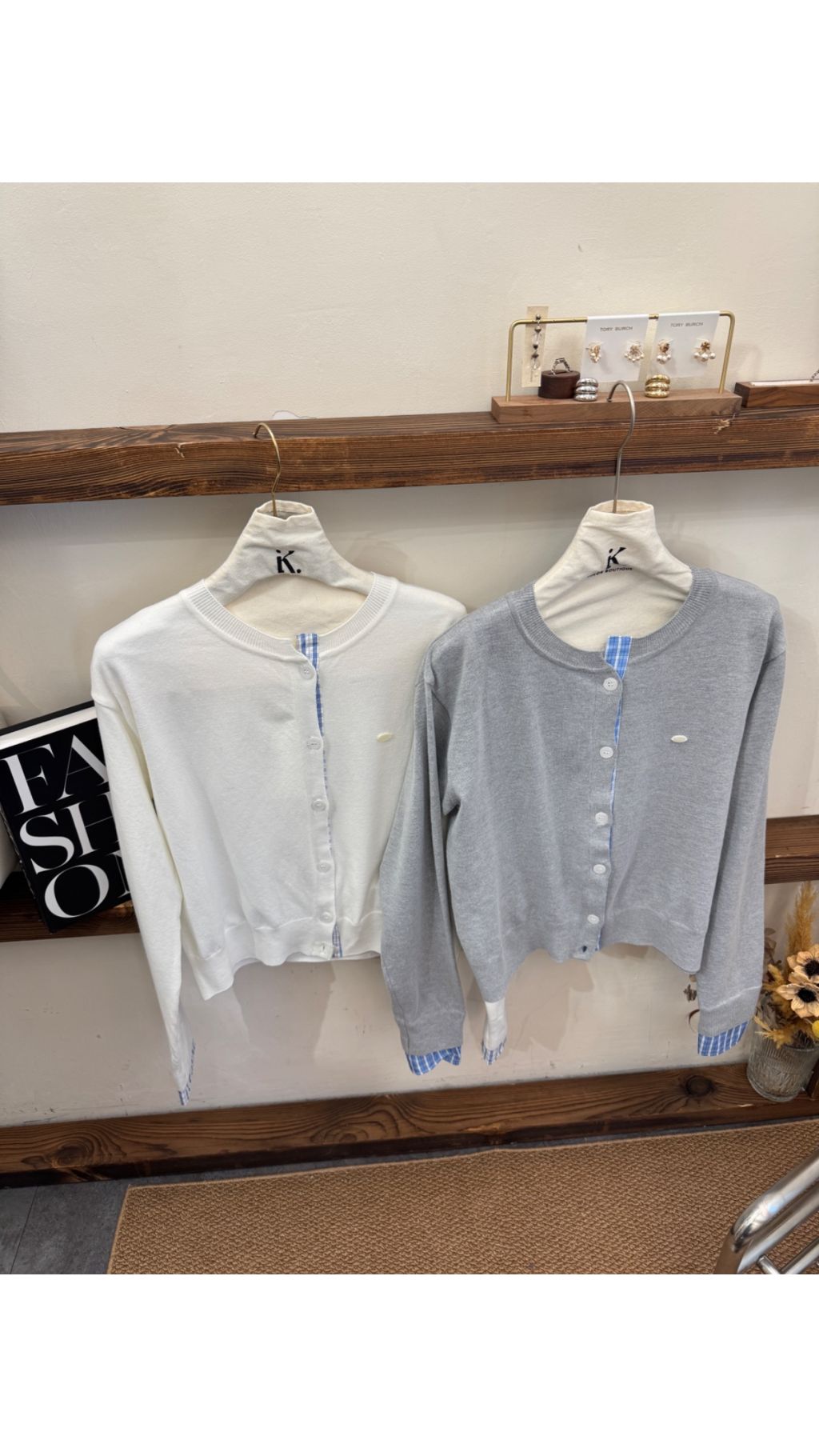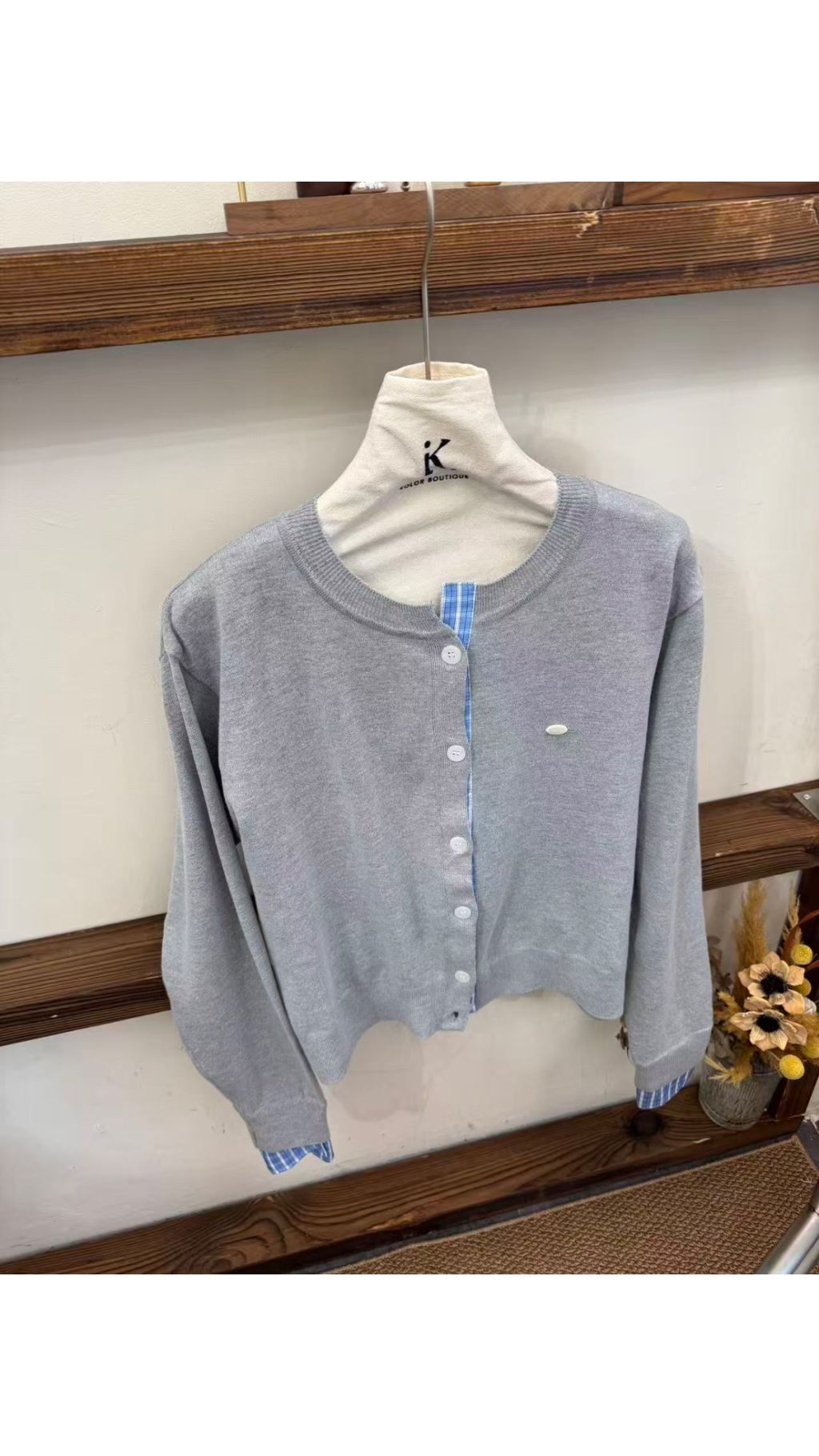 基礎針織開衫 + 藍白格紋襯衫拼接,假兩件設計省去疊穿麻煩,同時營造出豐富層次感,柔軟親膚的面料與利落版型,無論日常通勤、約會還是休閒出遊都能輕鬆駕馭。