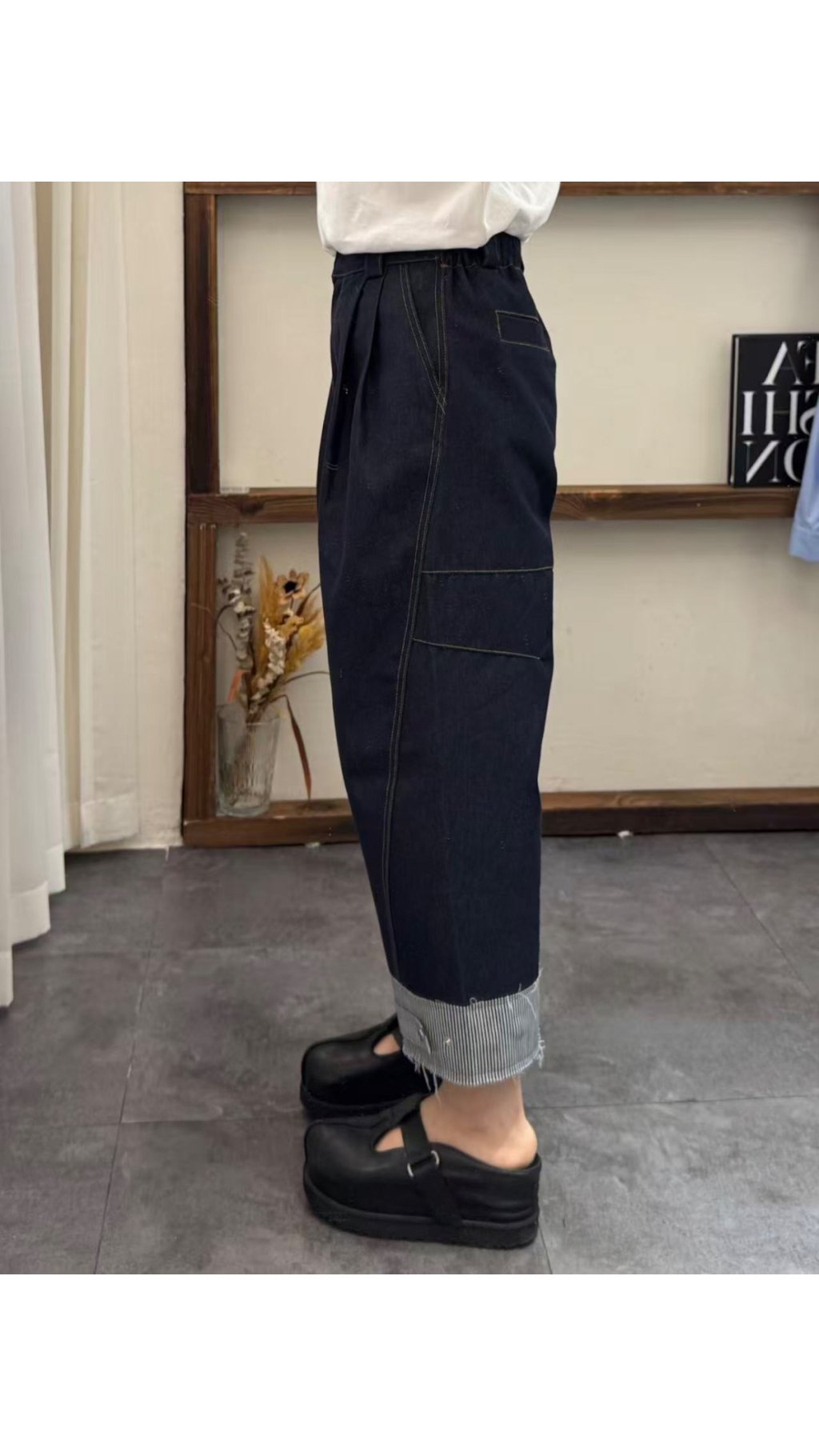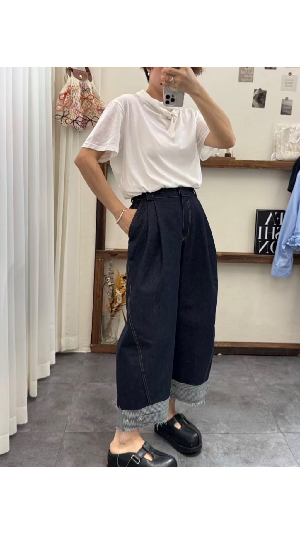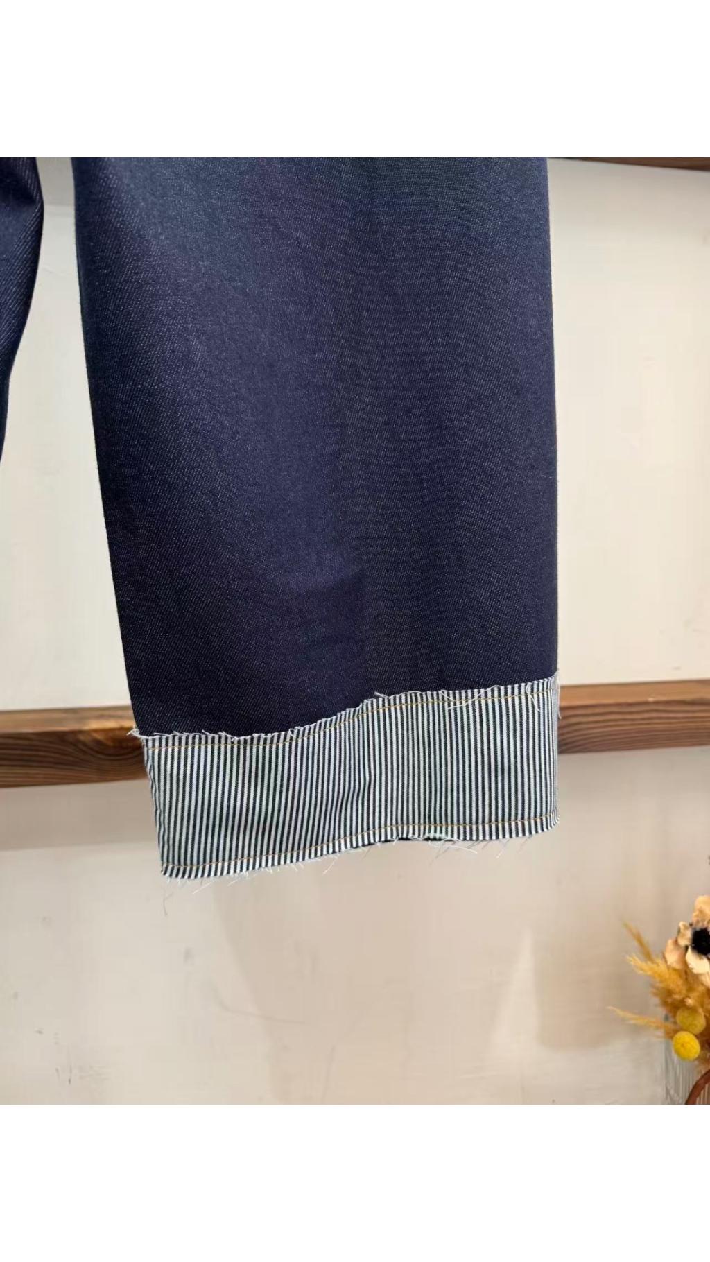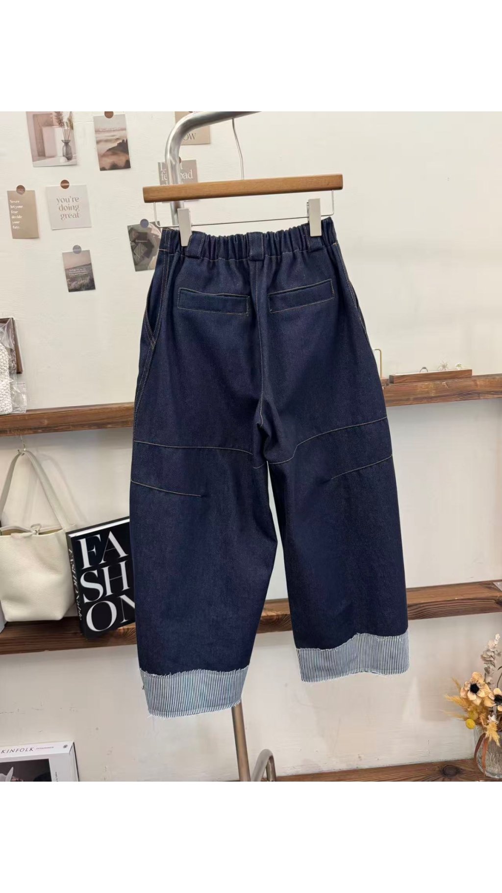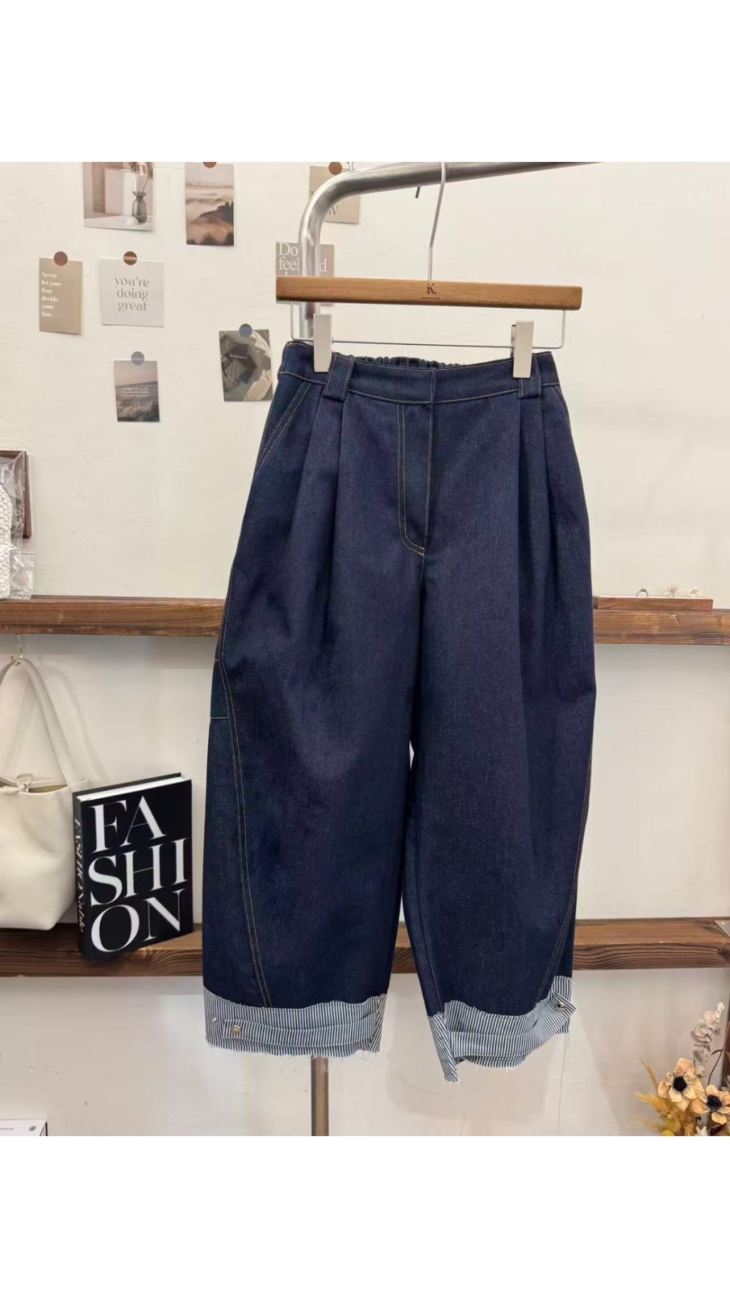 深藍牛仔面料 + 豎條紋翻邊細節,融合了工裝的硬朗與休閒的隨性,高腰闊腿版型有效遮肉顯瘦,無論日常通勤、週末出遊還是約會,都能輕鬆營造出慵懶復古的氛圍感。