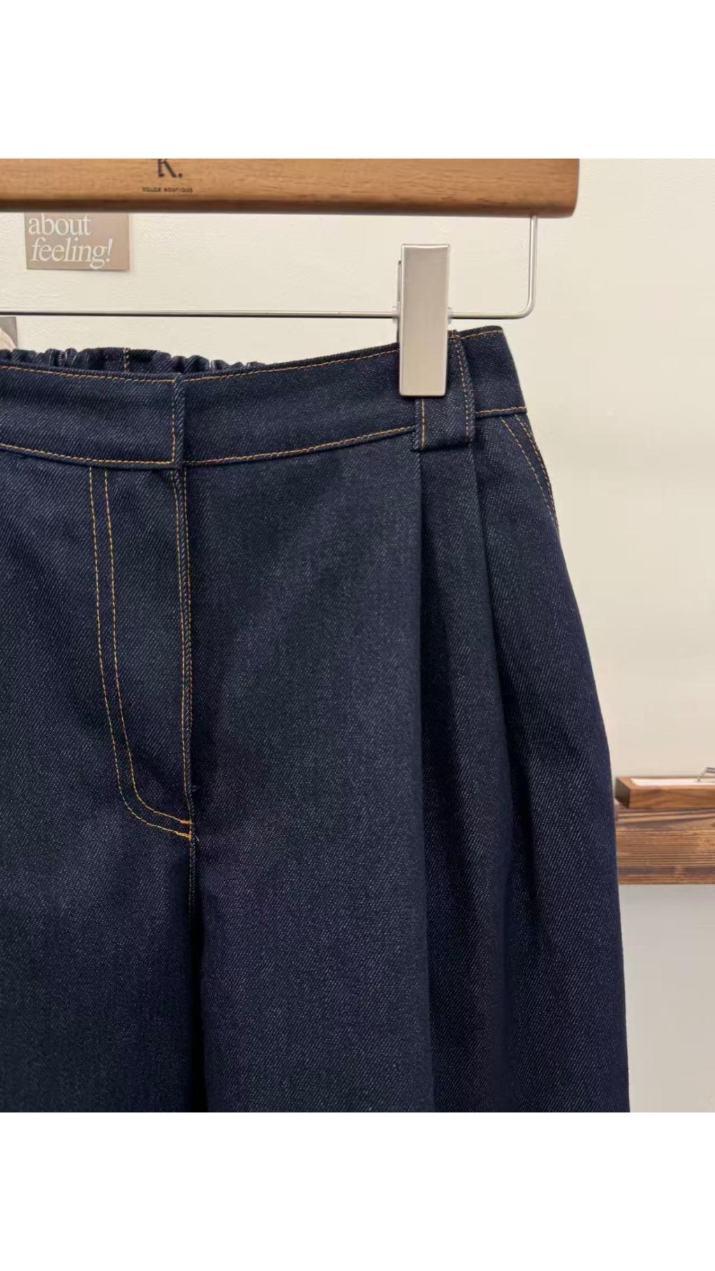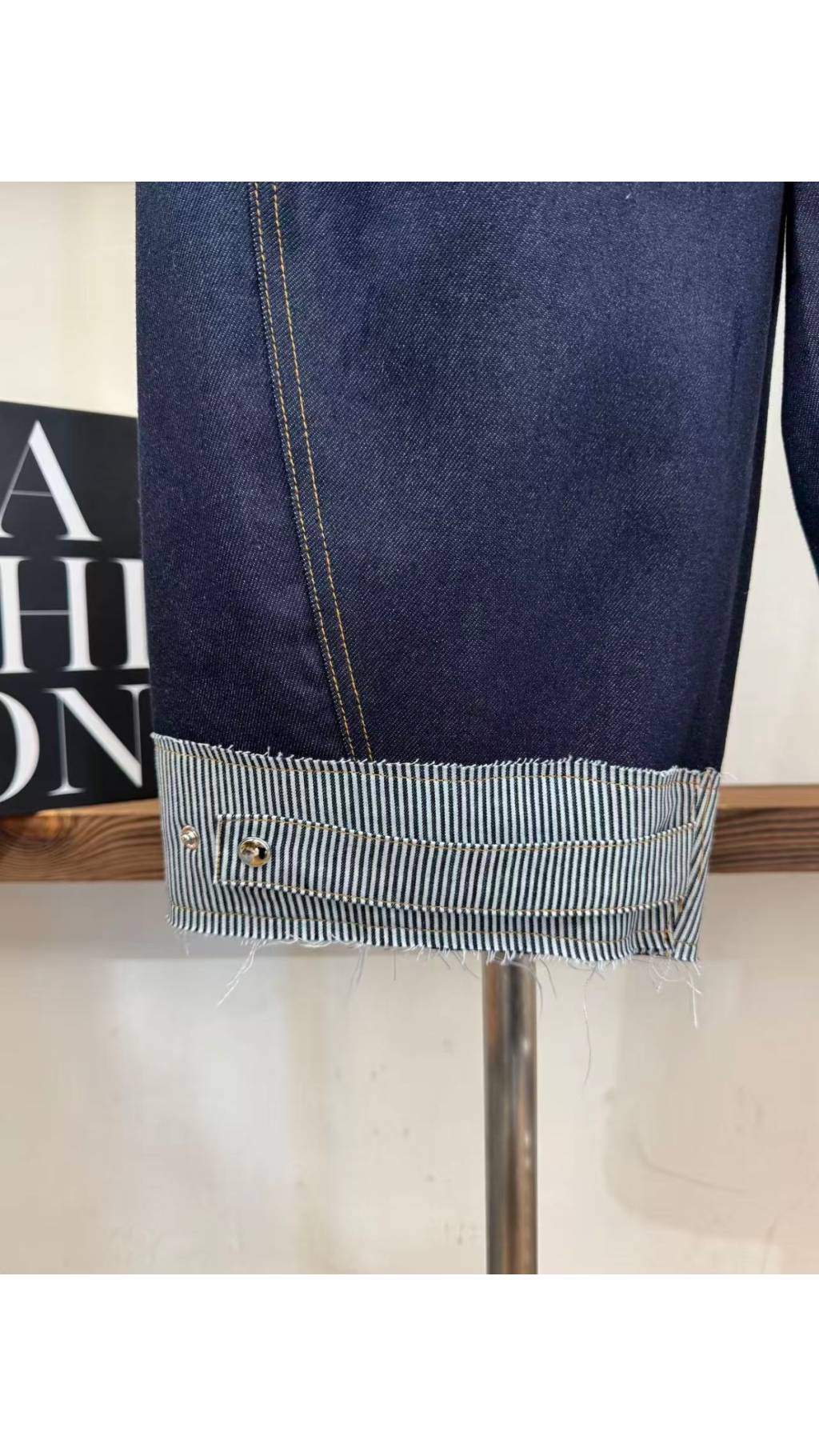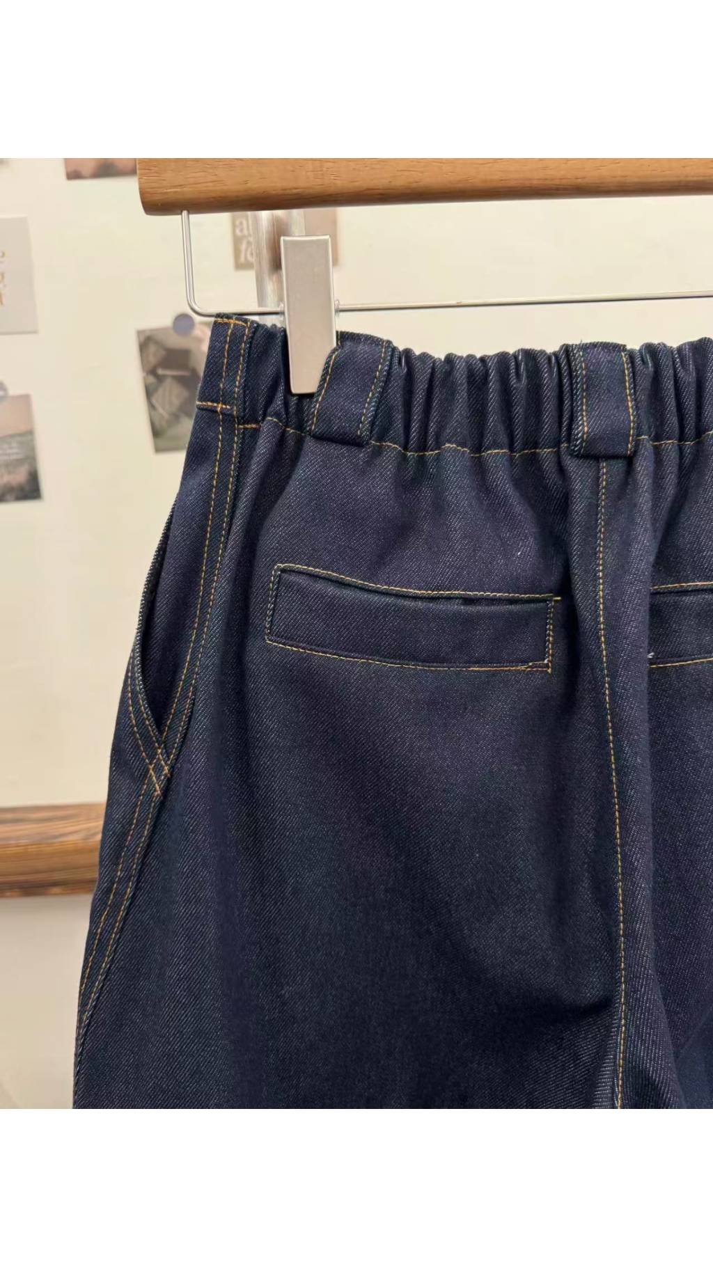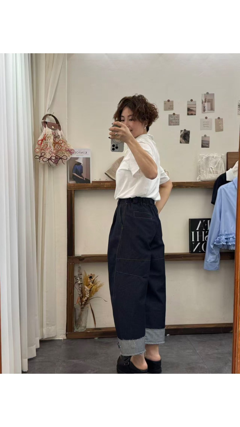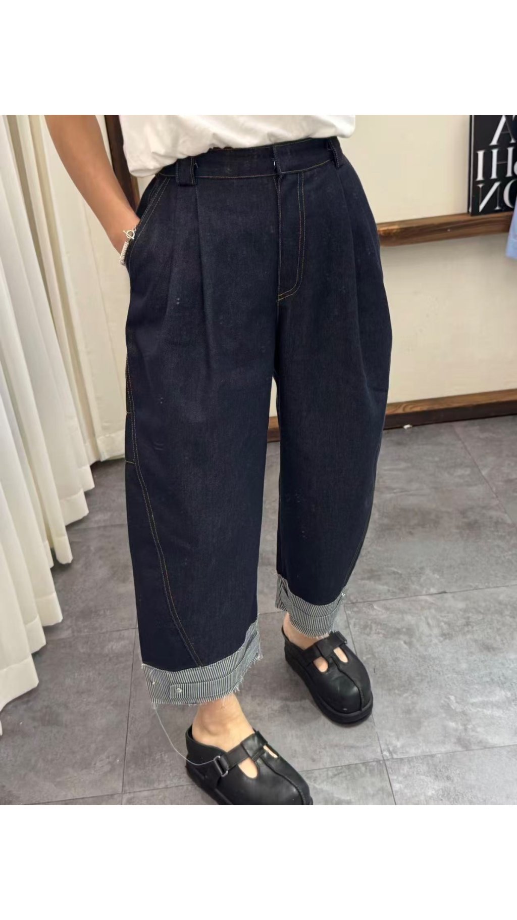 深藍牛仔面料 + 豎條紋翻邊細節,融合了工裝的硬朗與休閒的隨性,高腰闊腿版型有效遮肉顯瘦,無論日常通勤、週末出遊還是約會,都能輕鬆營造出慵懶復古的氛圍感。