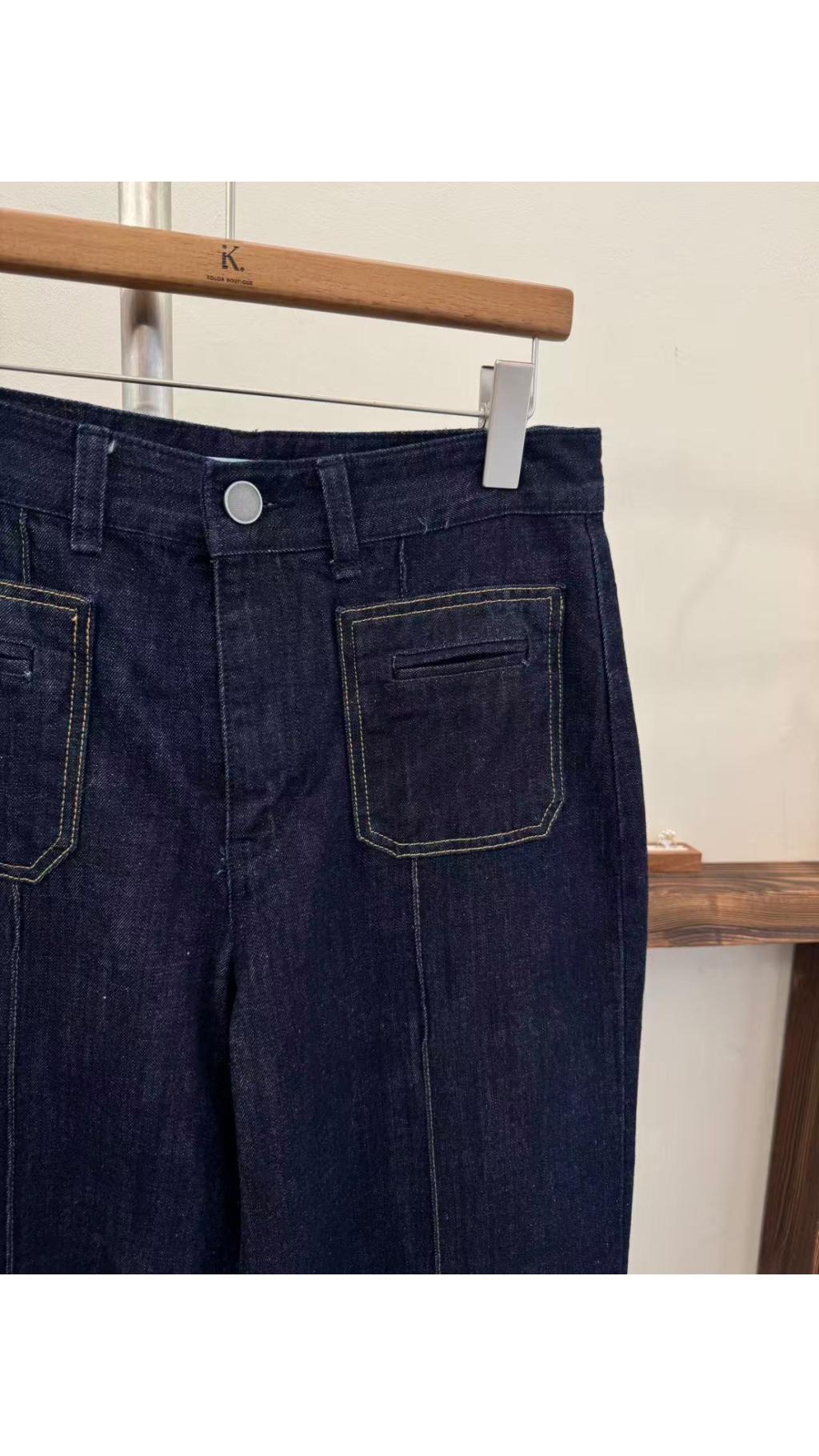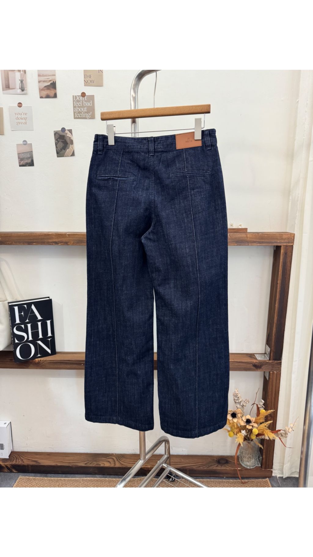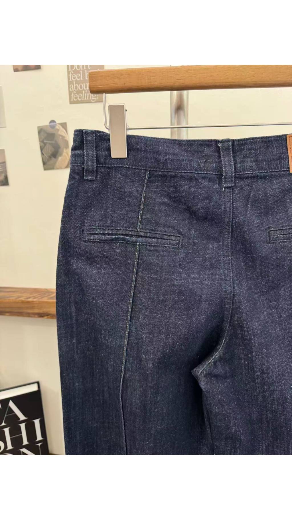 深藍原色牛仔面料 + 前片明線分割設計,融合了經典牛仔的硬朗與現代剪裁的利落,高腰直筒版型有效遮肉顯瘦,無論日常通勤、週末出遊還是約會,都能輕鬆營造出高級復古的氛圍感。