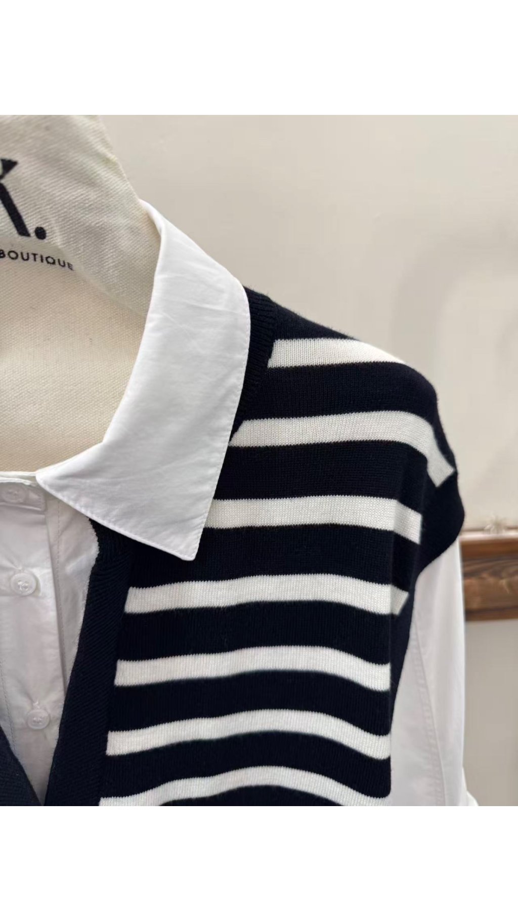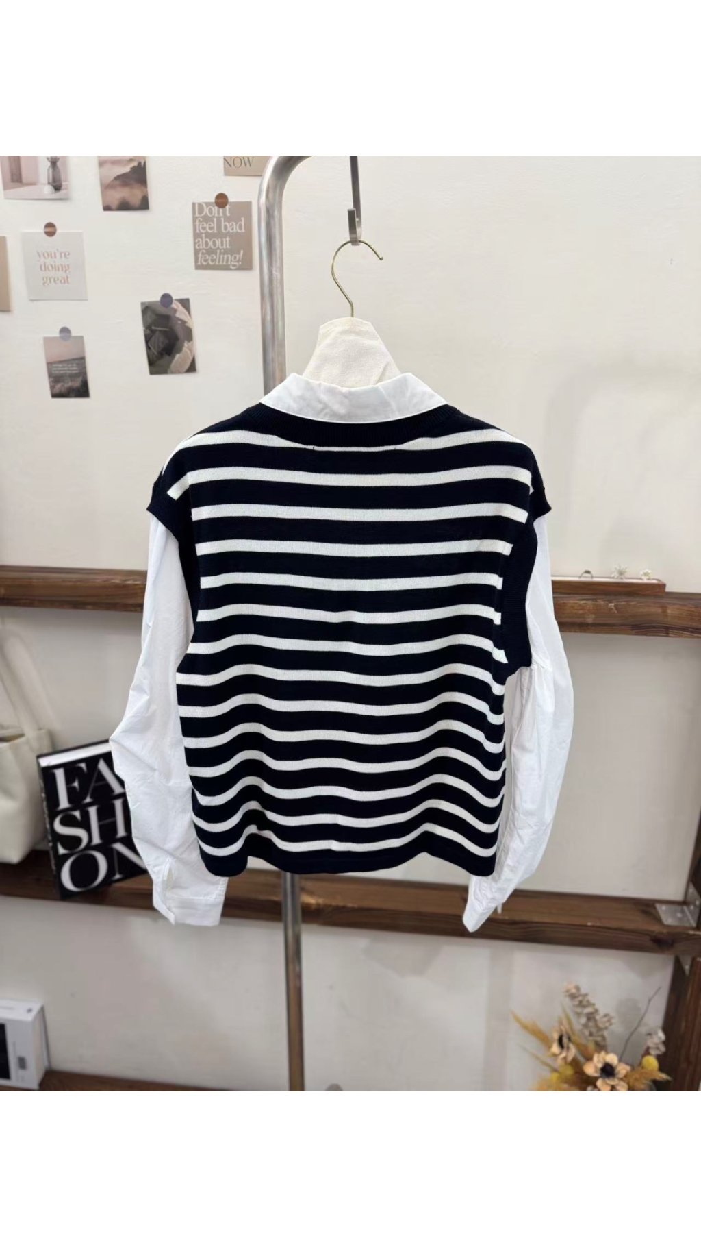 針織馬甲與襯衫袖的拼接設計,省去疊穿麻煩,同時營造出豐富層次感,經典黑白條紋融合知性翻領,無論日常通勤、約會還是休閒出遊,都能輕鬆營造出隨性又高級的韓系風格。