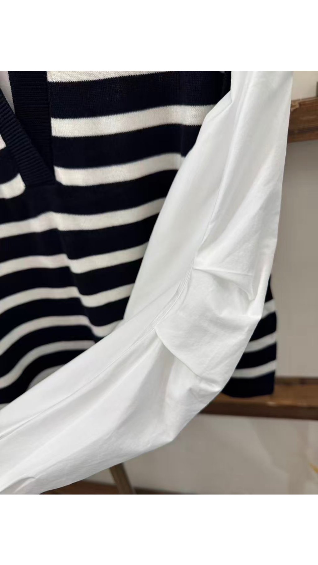 假兩件拼接設計:前片 V 領針織條紋馬甲 + 後片襯衫領與長袖拼接,模擬疊穿效果,層次感滿滿,又避免了真實疊穿的臃腫感。