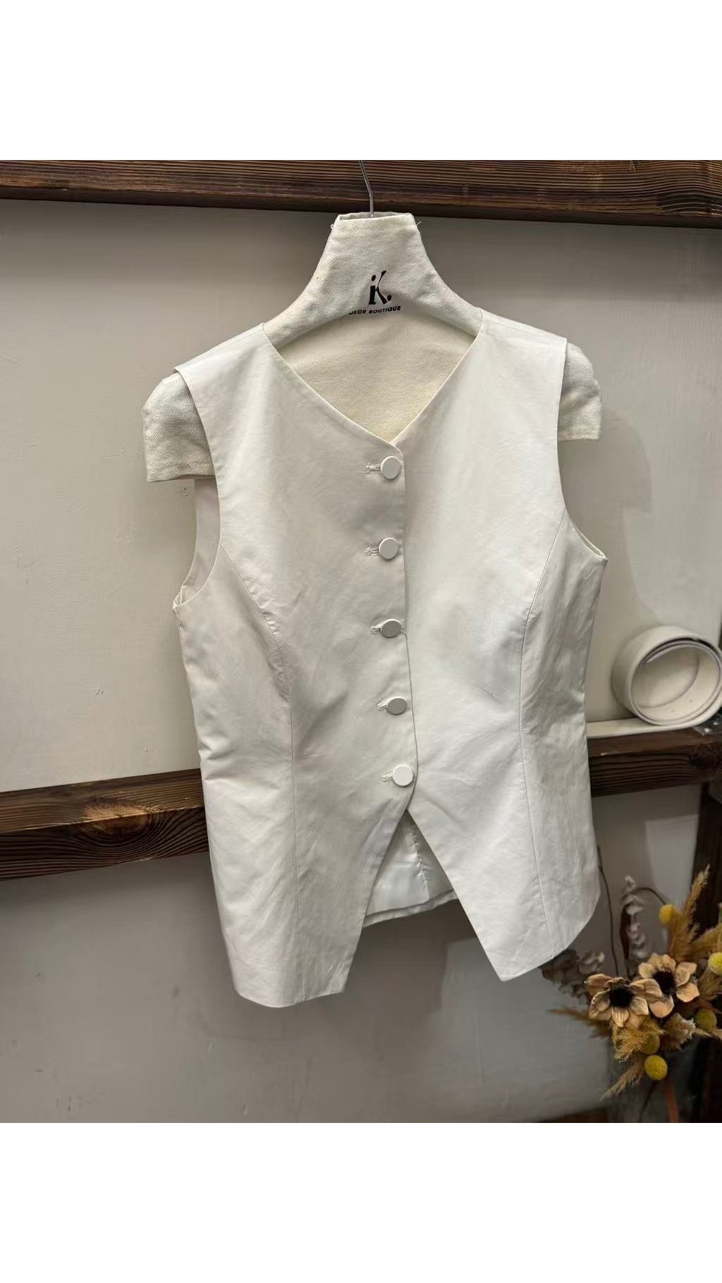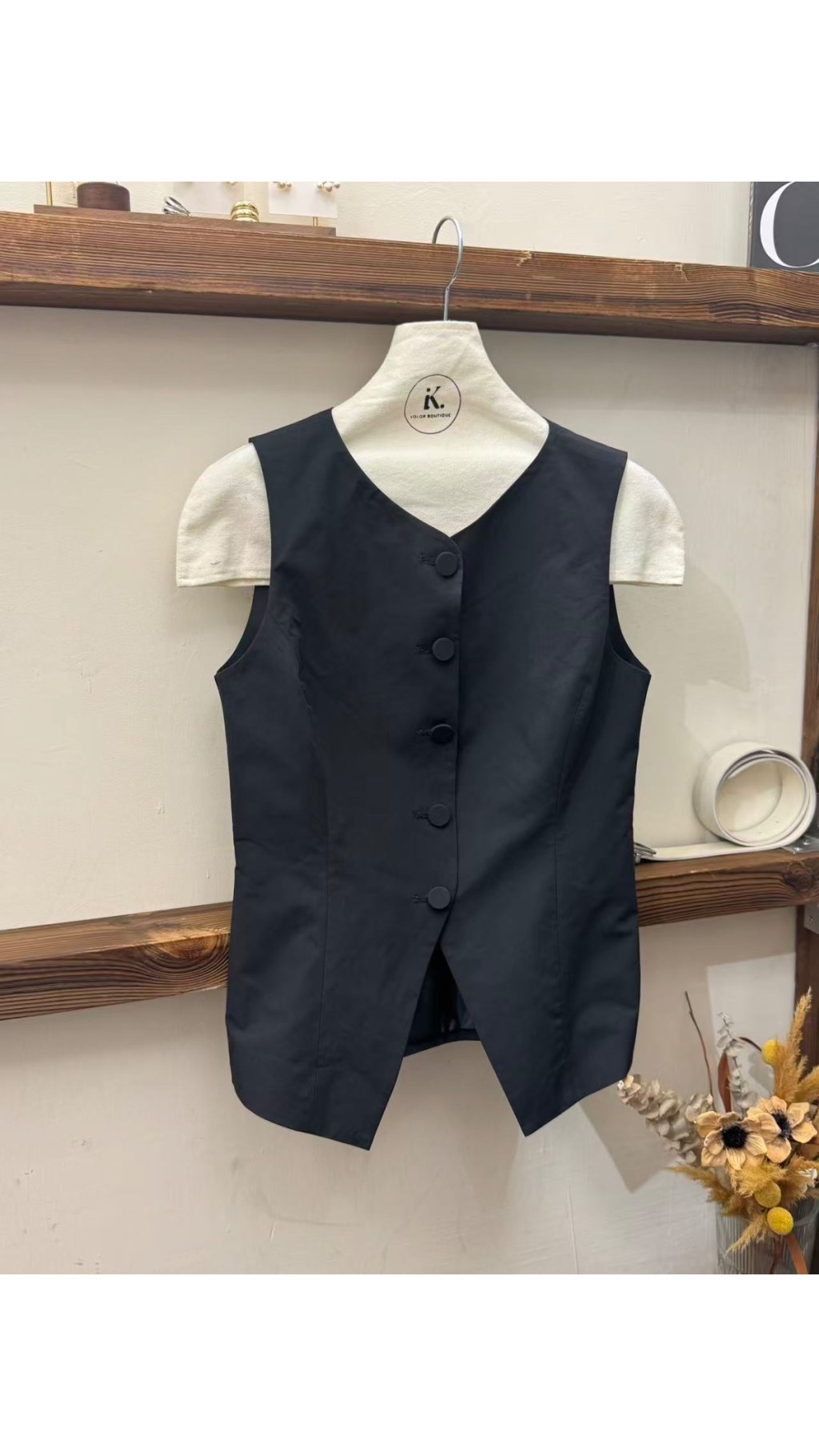 溫柔約會風:內搭蕾絲背心 / 絲質上衣,搭配高腰半身裙 + 細帶涼鞋,外搭這件馬甲,溫柔又有氣場,約會超加分。