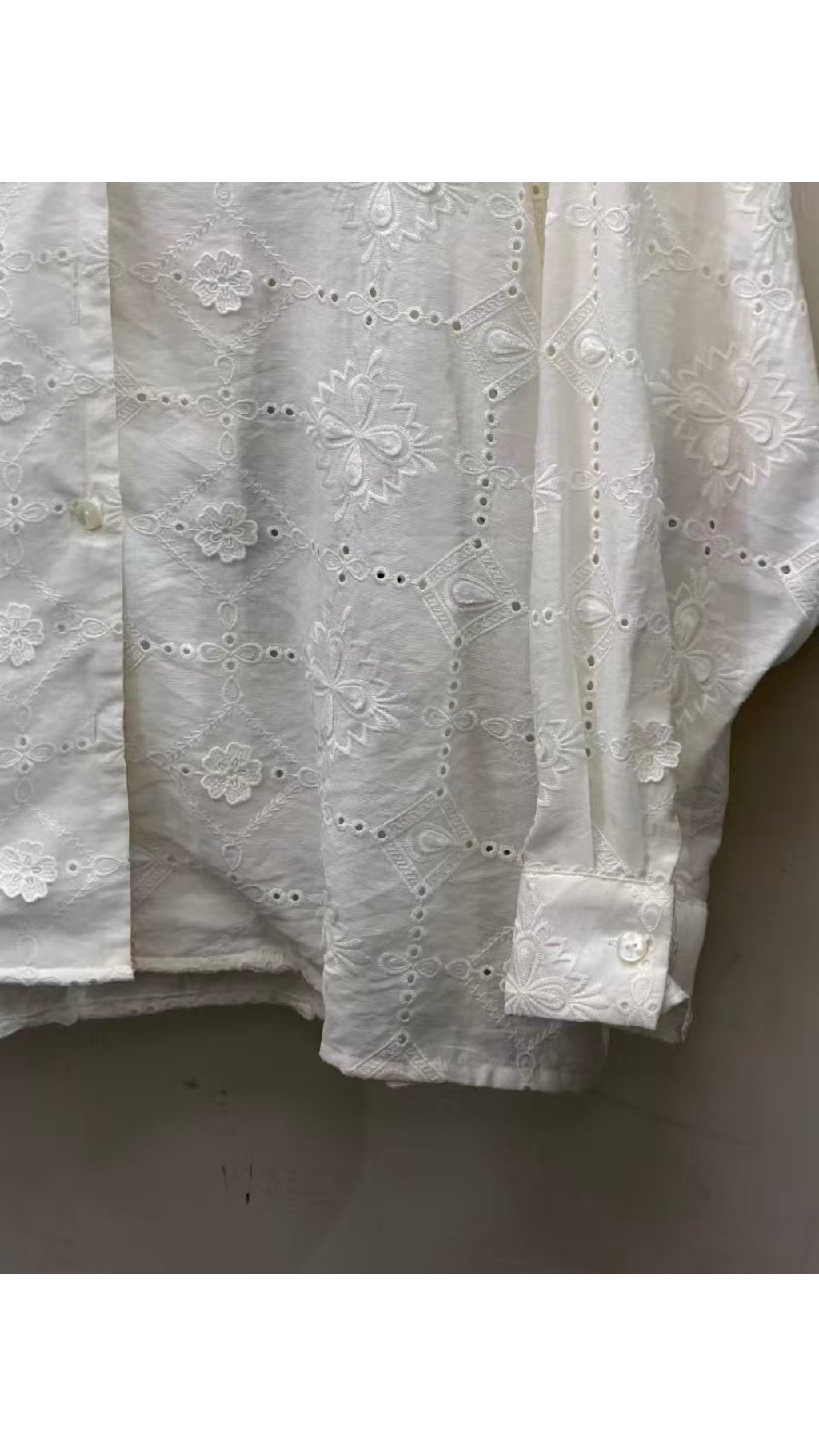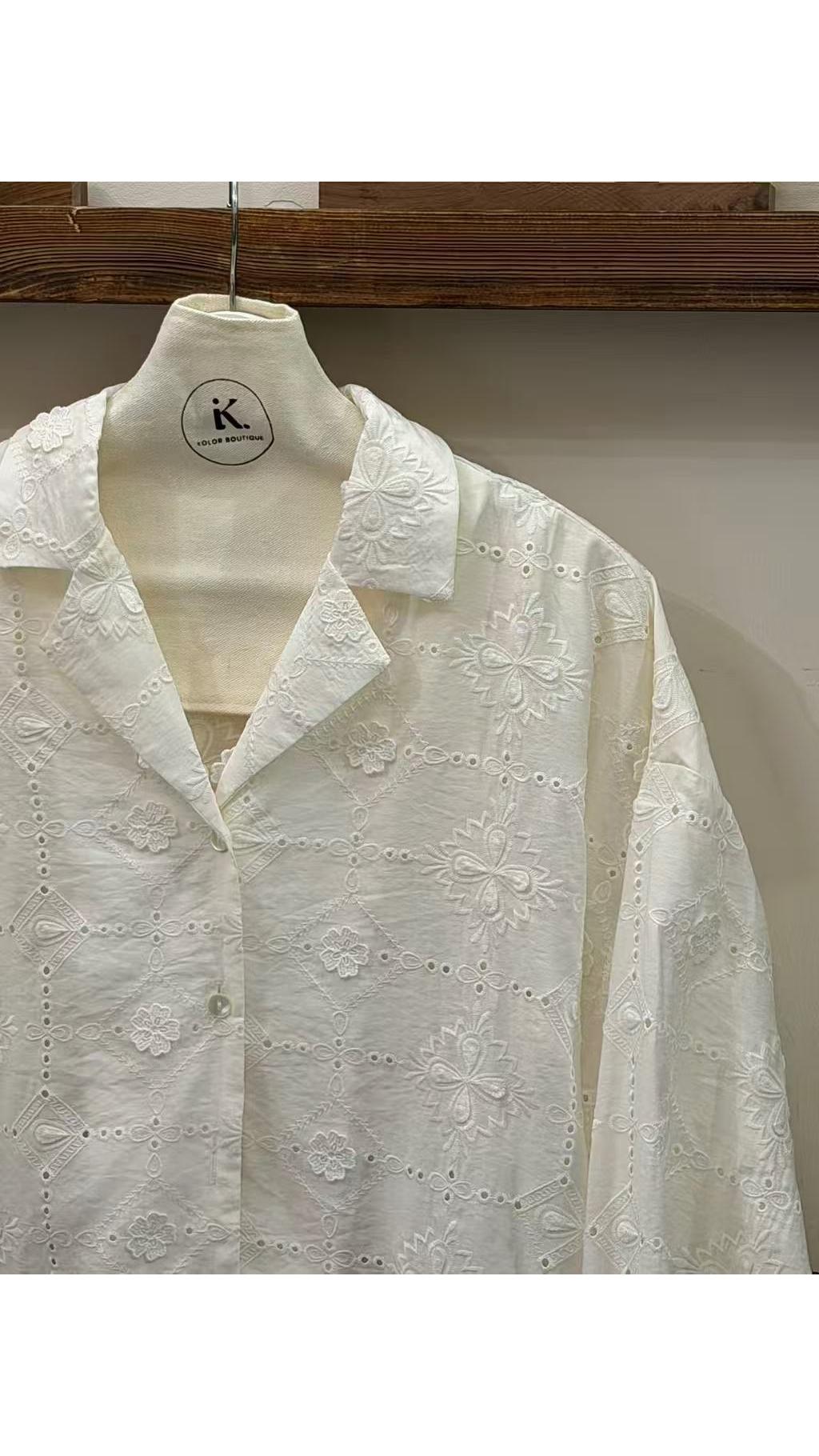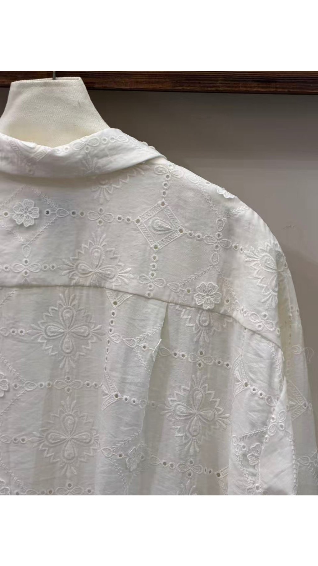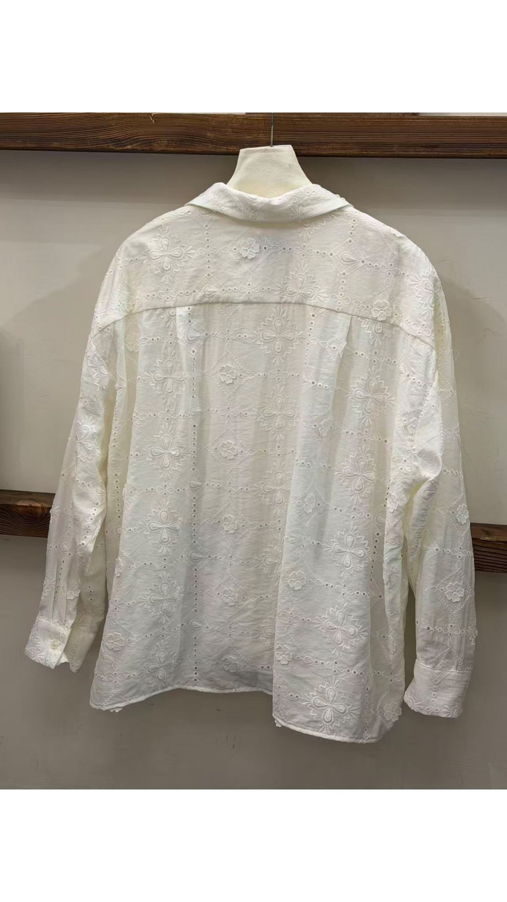 滿身立體鏤空刺繡:衣身、領口、袖口均飾有立體花卉鏤空刺繡,透而不露,浪漫感滿滿,層次感豐富,提升整體精致度。
