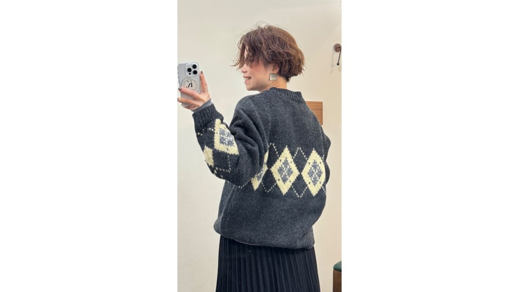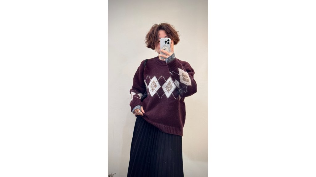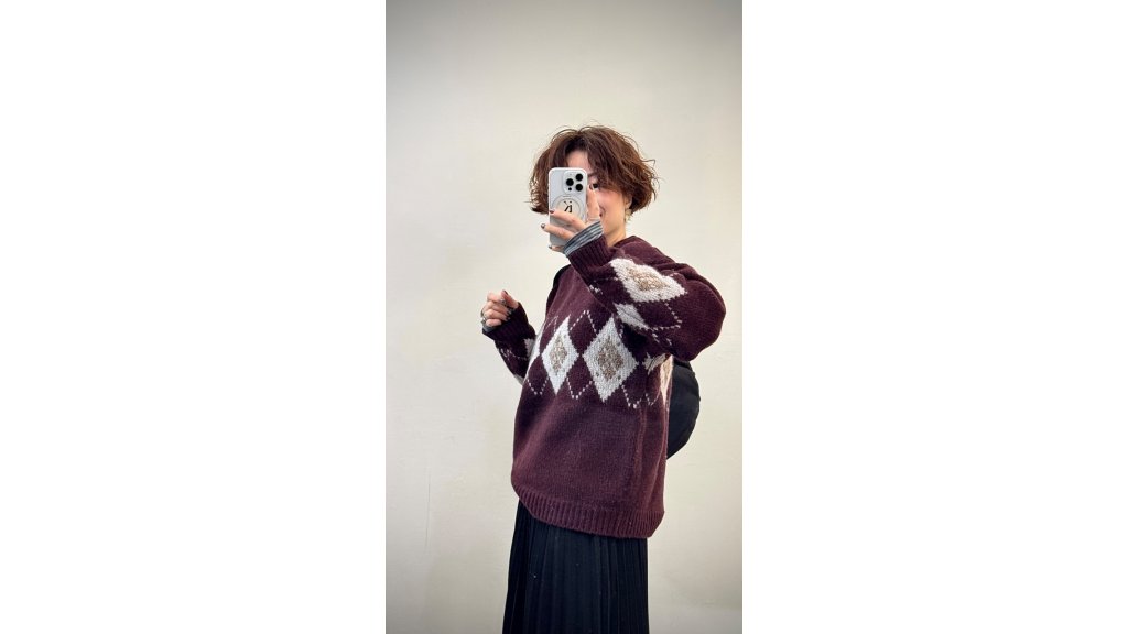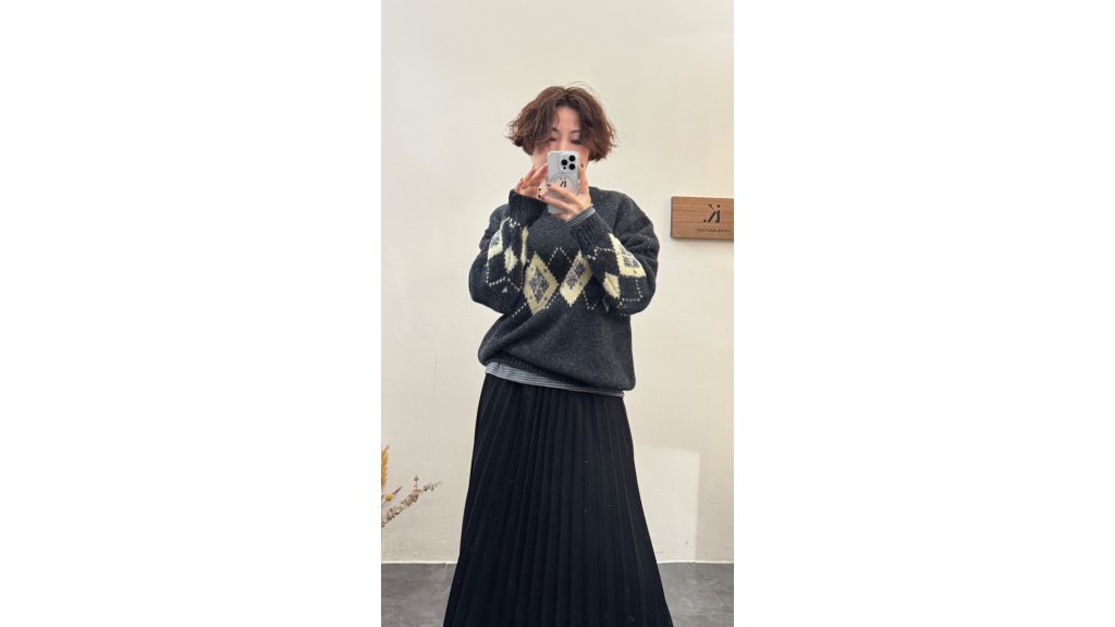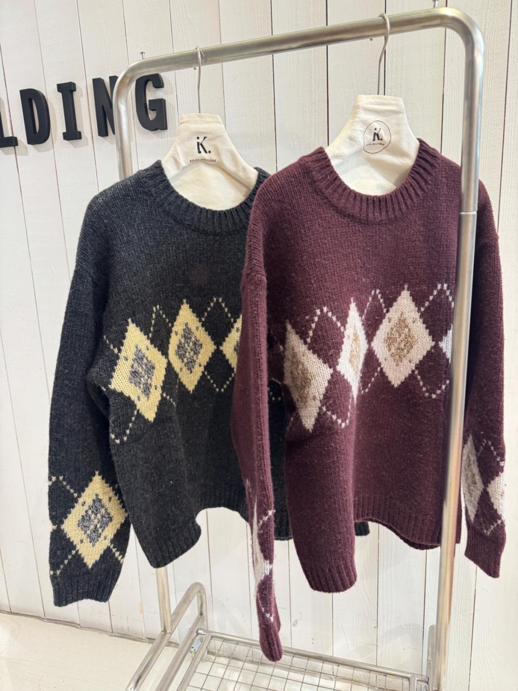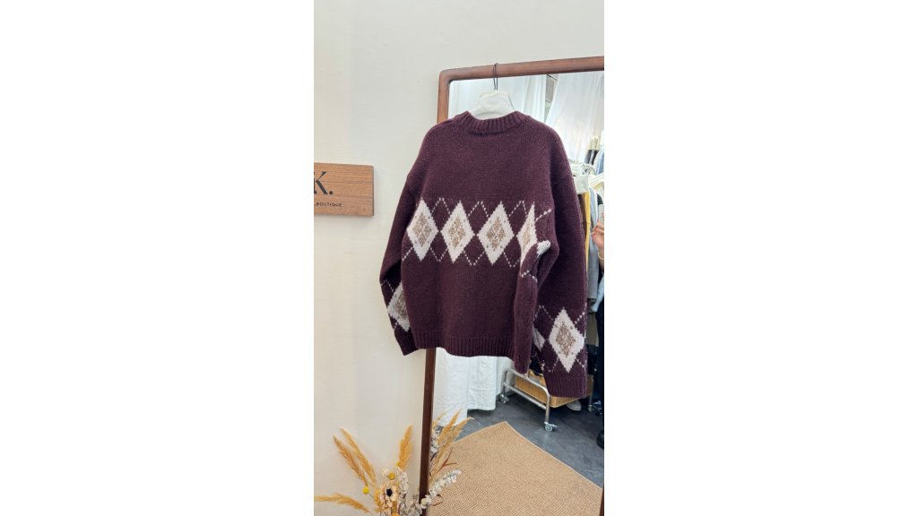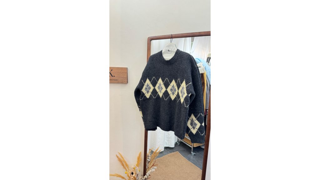 KN014-OLI 厚實平針羊毛菱形圖案提花針織衫