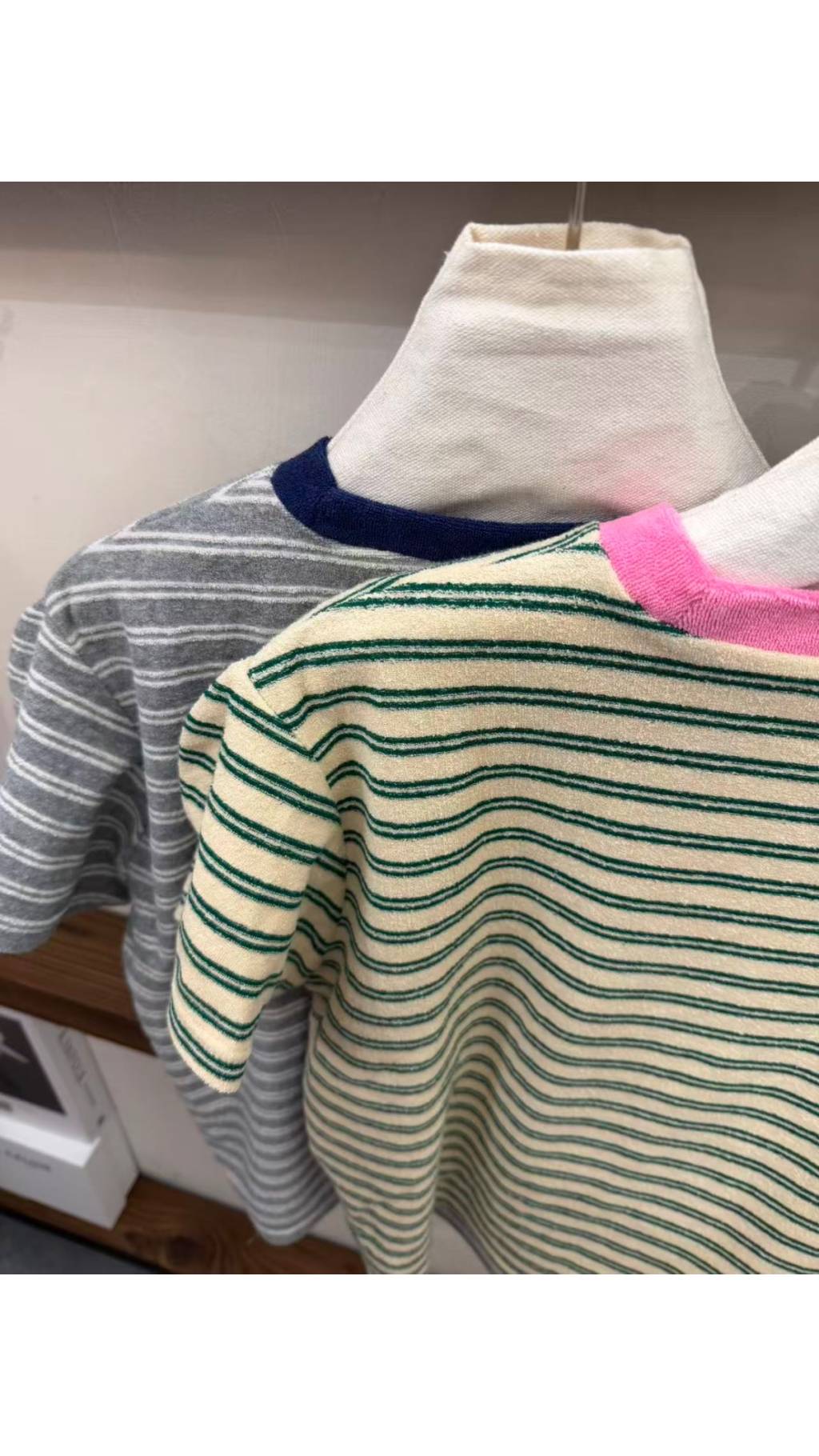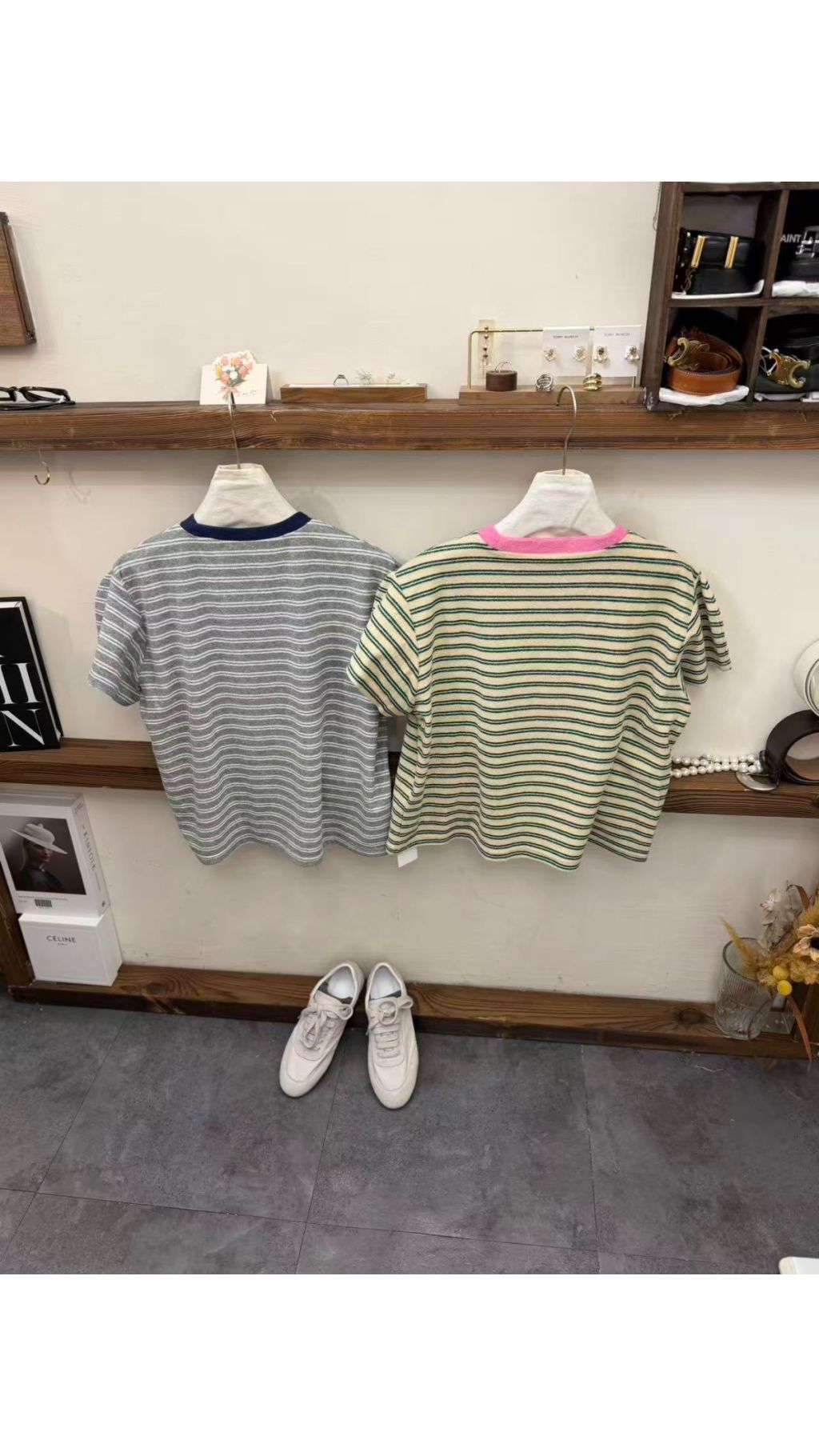 粉領綠條紋:清新減齡的粉色領口搭配綠條紋,顯白不挑皮,打造韓系休閒風與日常減齡風,適合黃皮姐妹放心駕馭。