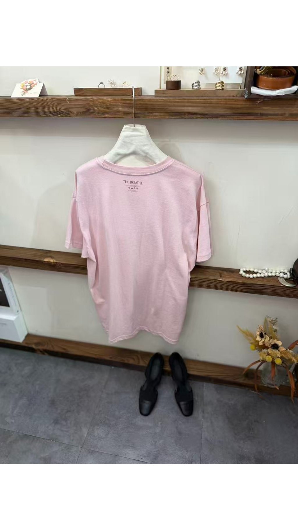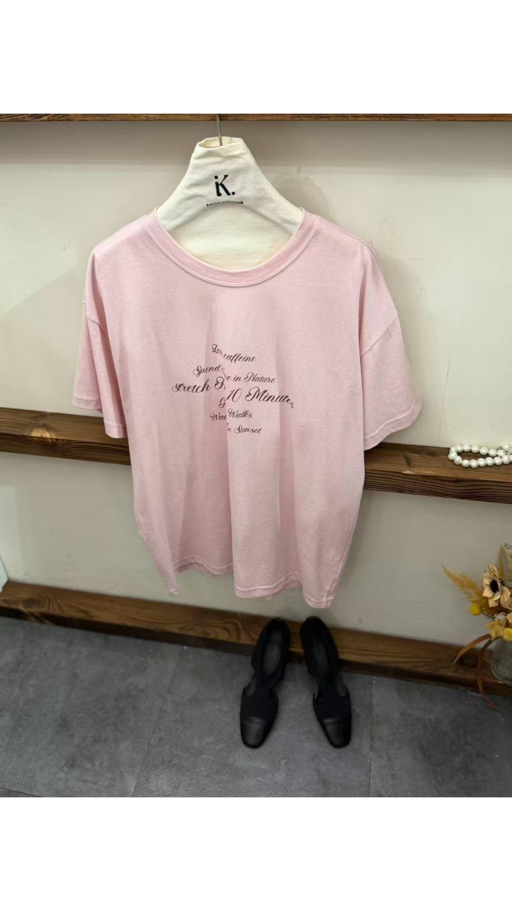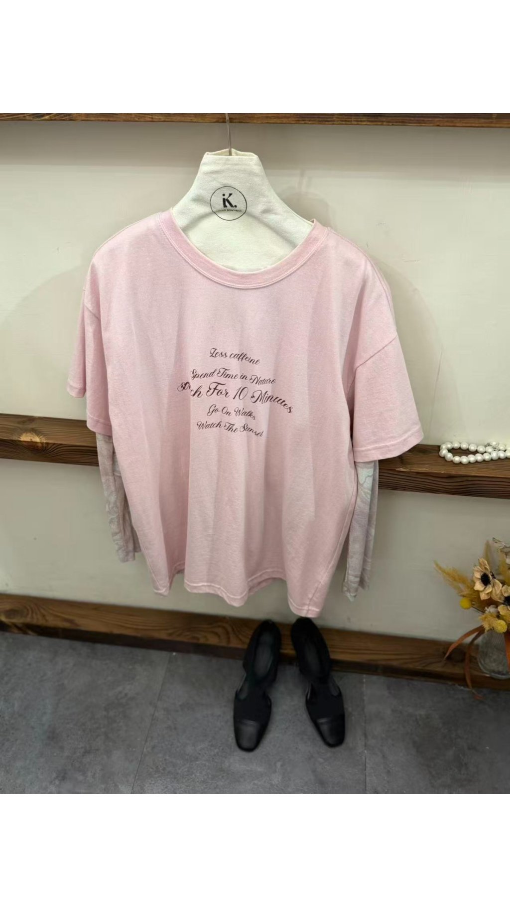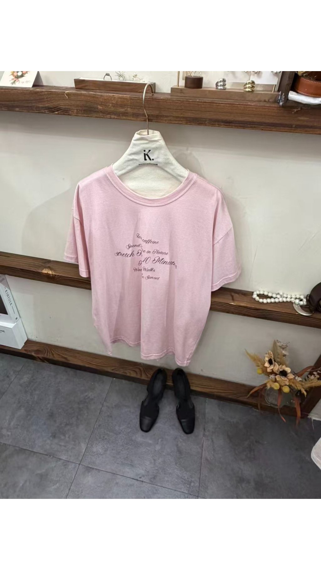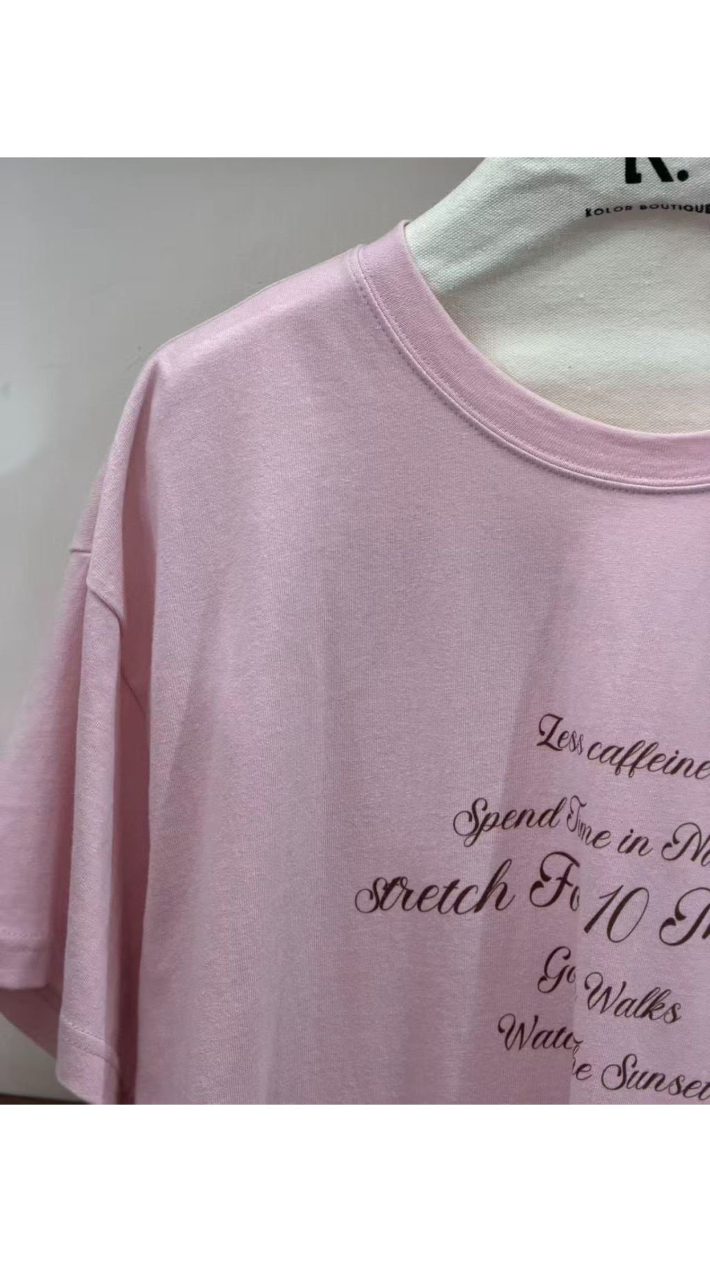 • 復古英文花體印花:衣身飾有弧形排列的英文花體字,質感細膩,打破基礎款的單調,打造滿滿文藝氛圍與設計感,溫柔又減齡。