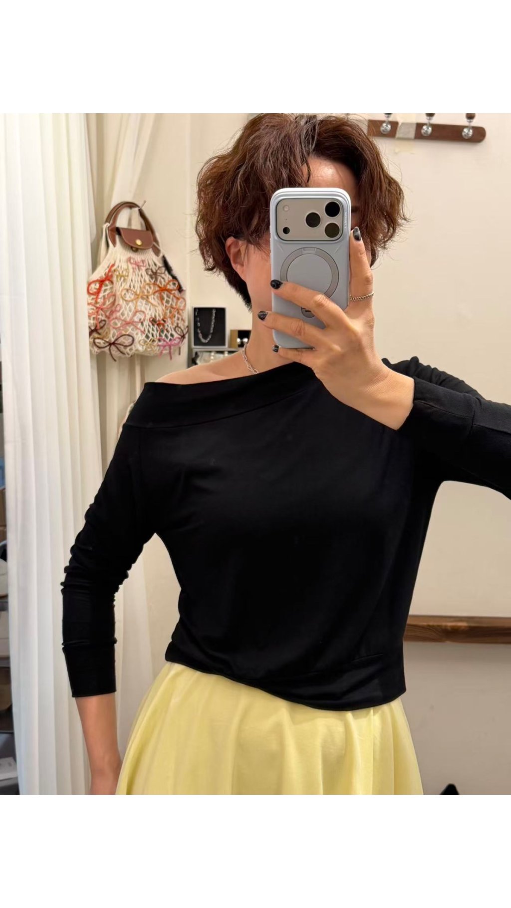 盪領斜肩設計:大面積盪領斜肩剪裁,修飾肩頸線條,拉長臉部比例,打造顯瘦效果,同時增添法式浪漫感,單穿、疊穿皆可。