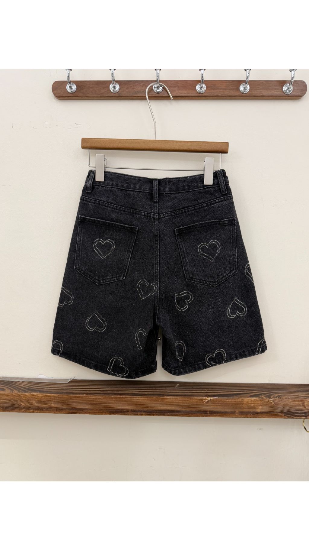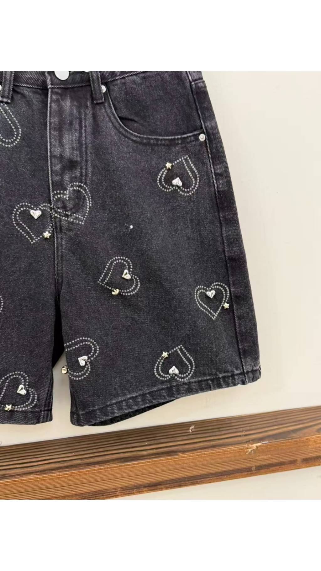 SP60414005 甜酷愛心燙鑽高腰牛仔短褲