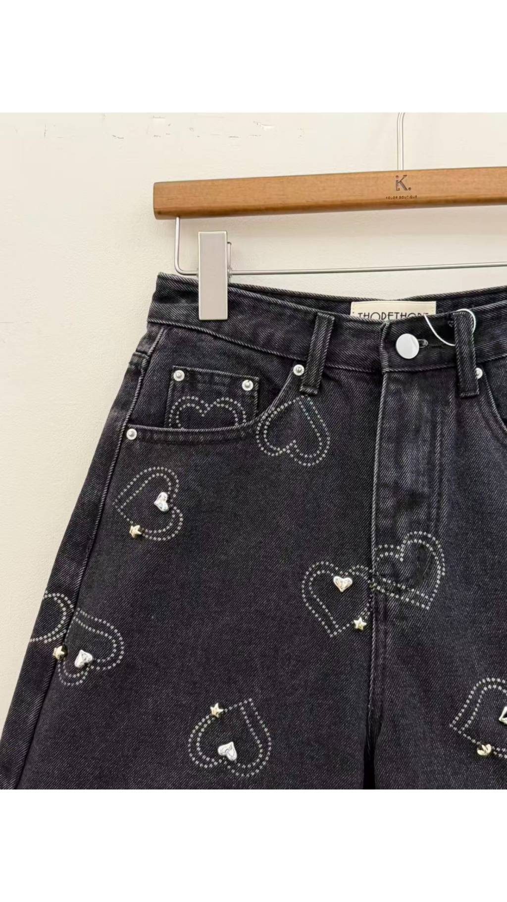 - 愛心燙鑽滿印設計:褲身滿印立體愛心圖案,搭配閃耀燙鑽 / 釘飾工藝,甜酷感拉滿,打破基礎牛仔褲的單調,瞬間提升造型吸睛度。