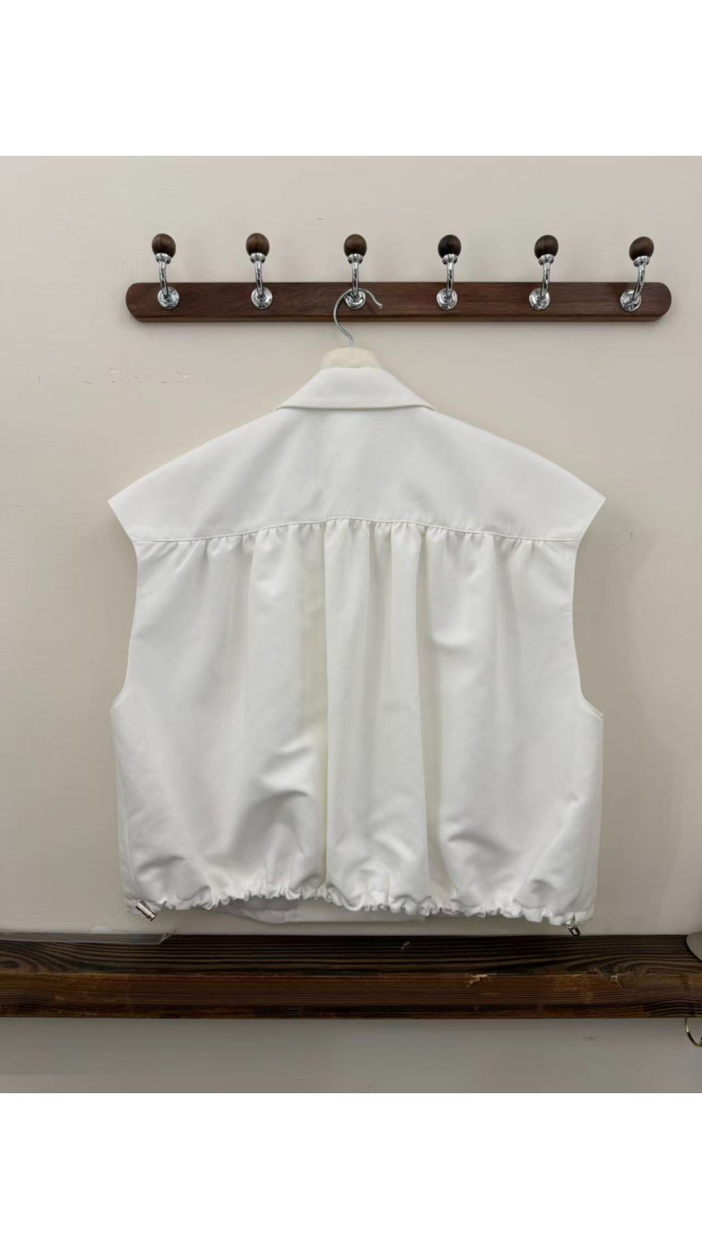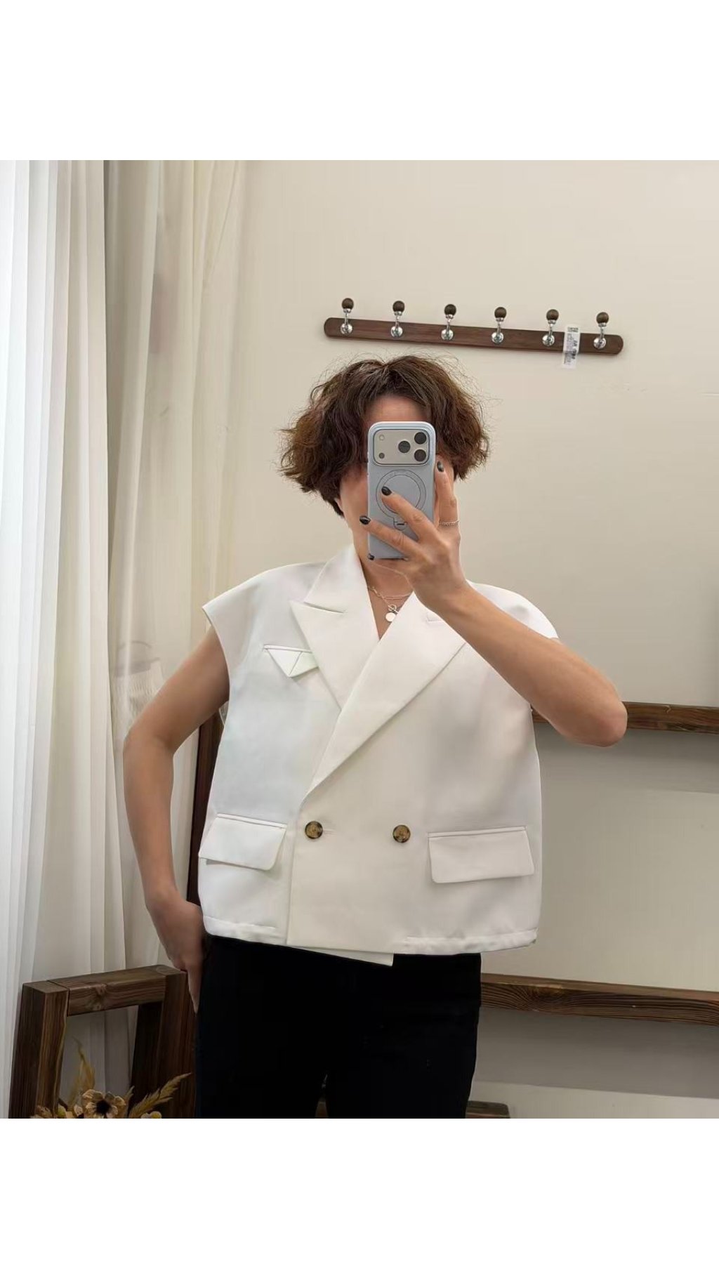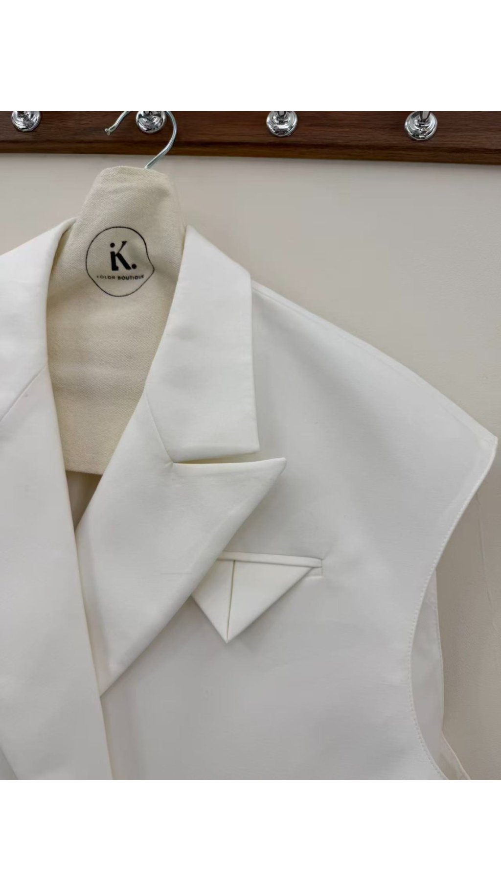 - 雙排金屬扣:胸前雙排金色圓釘裝飾,提升精致度,與白色面料形成撞色,增添設計細節,與基礎款馬甲區分開來。
