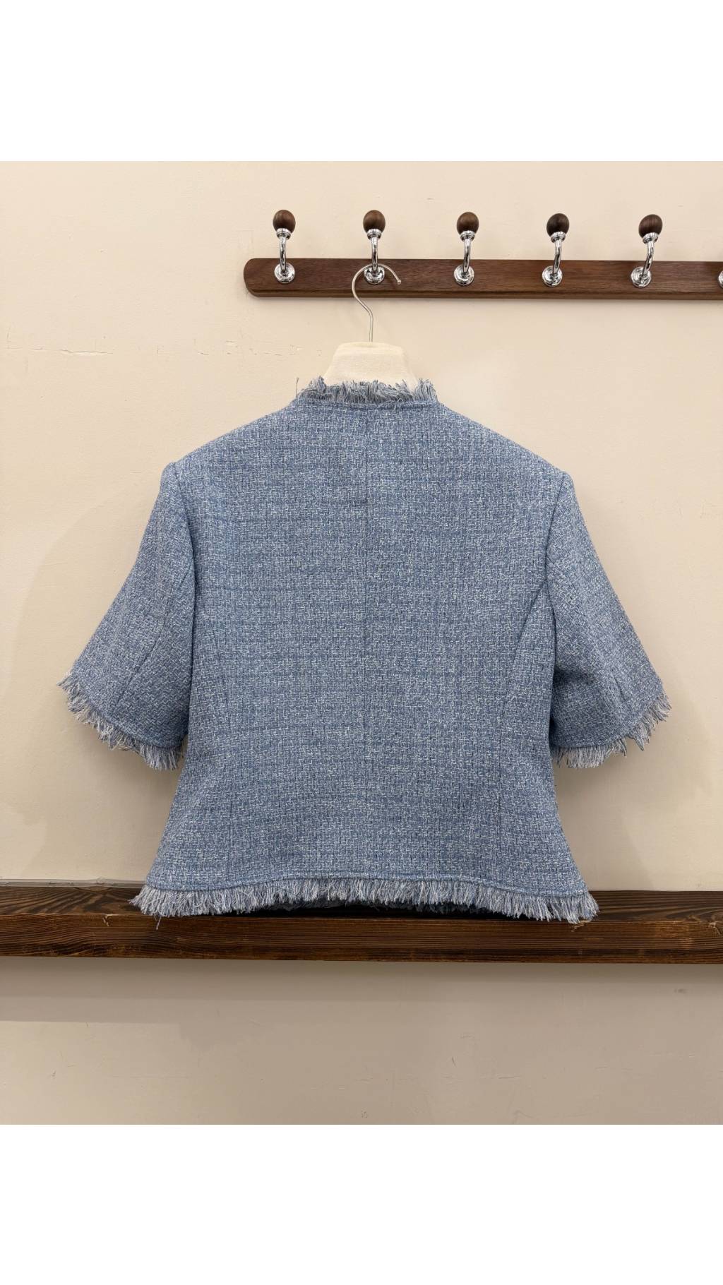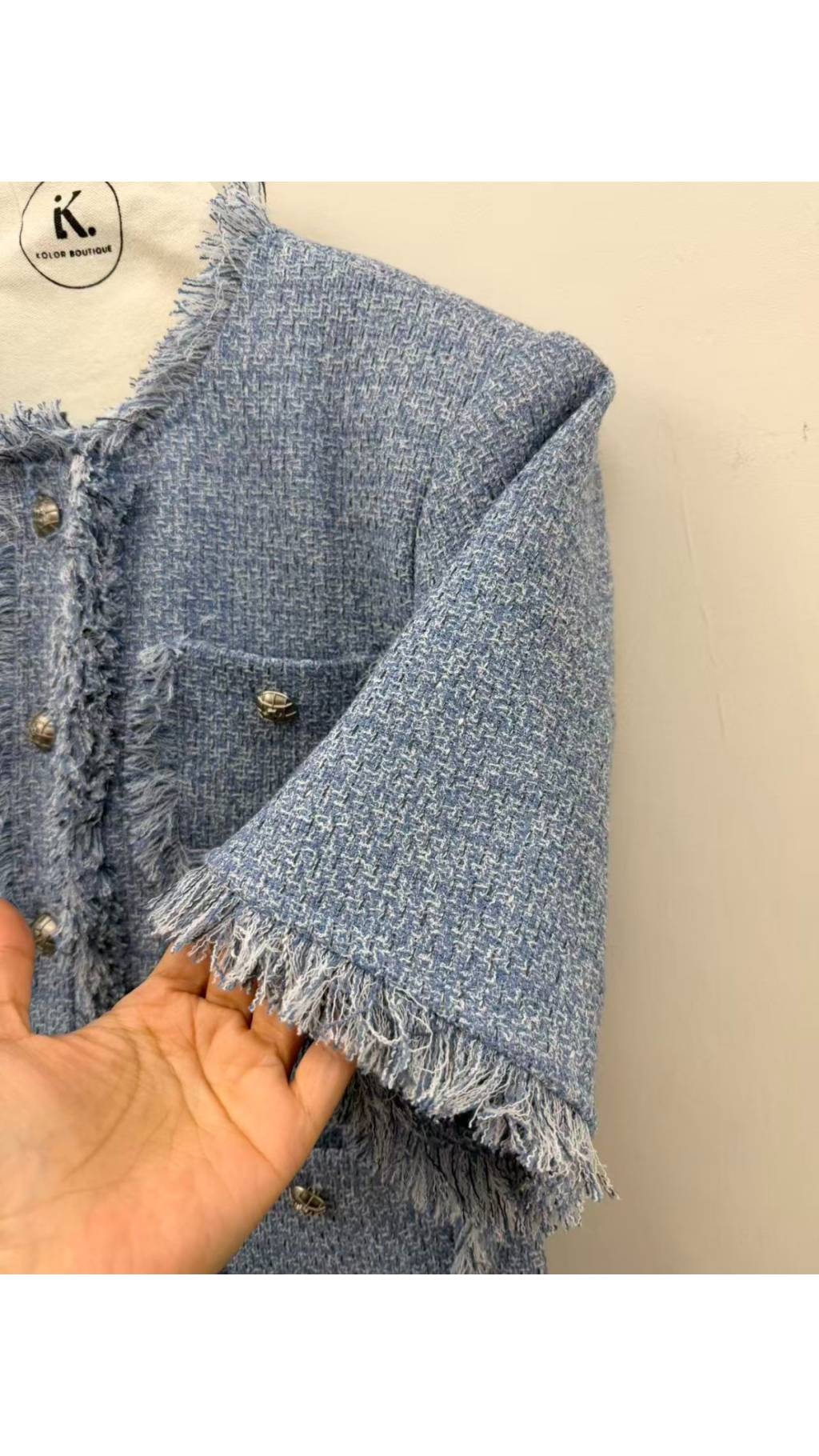 • 清新淺藍粗花呢面料:藍白混色的淺藍調粗花呢,打破傳統小香風的沉悶,帶來清爽夏日感,質感立體高級,肌理清晰。