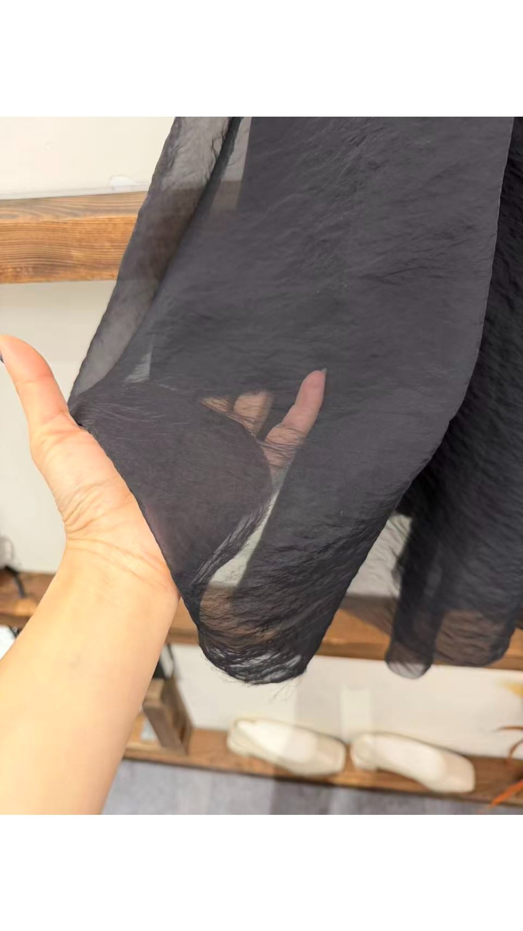 - 雙層皺感肌理面料:外層半透皺感紗料 + 內層同色襯布,層次感滿滿,肌理立體獨特,不易起皺,自帶柔光效果,溫柔不暴露。