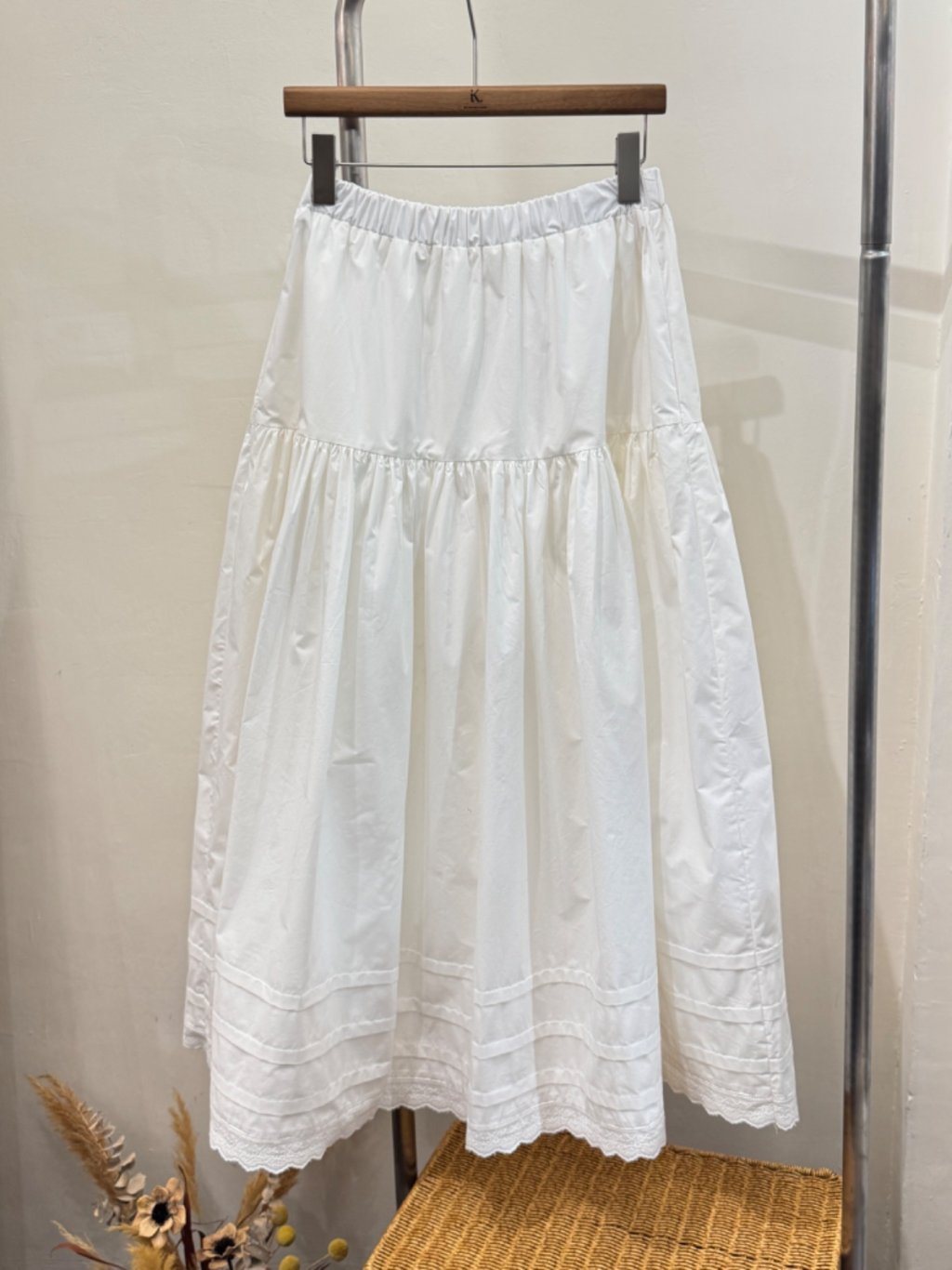 韓國設計師純白百褶裙,輕盈棉質面料舒適透氣,鬆緊腰頭設計穿脫方便,包容多種身形。層次百褶營造豐富立體感,底部精緻蕾絲邊增添浪漫仙氣與甜美氣質。