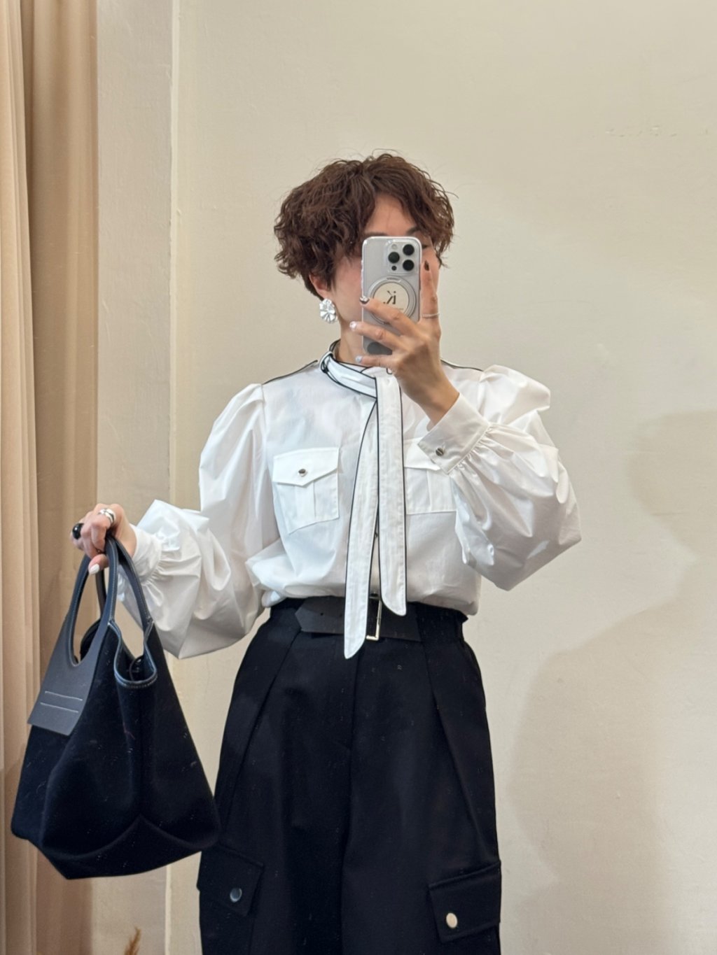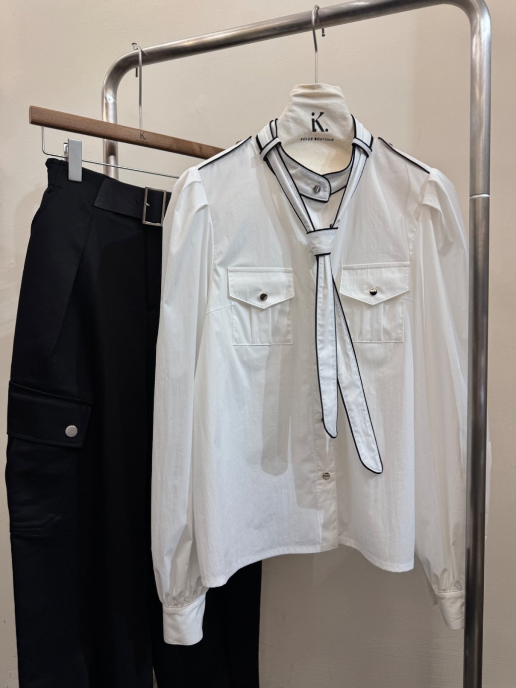 立體泡泡袖、撞色滾邊細節、可拆蝴蝶結領帶