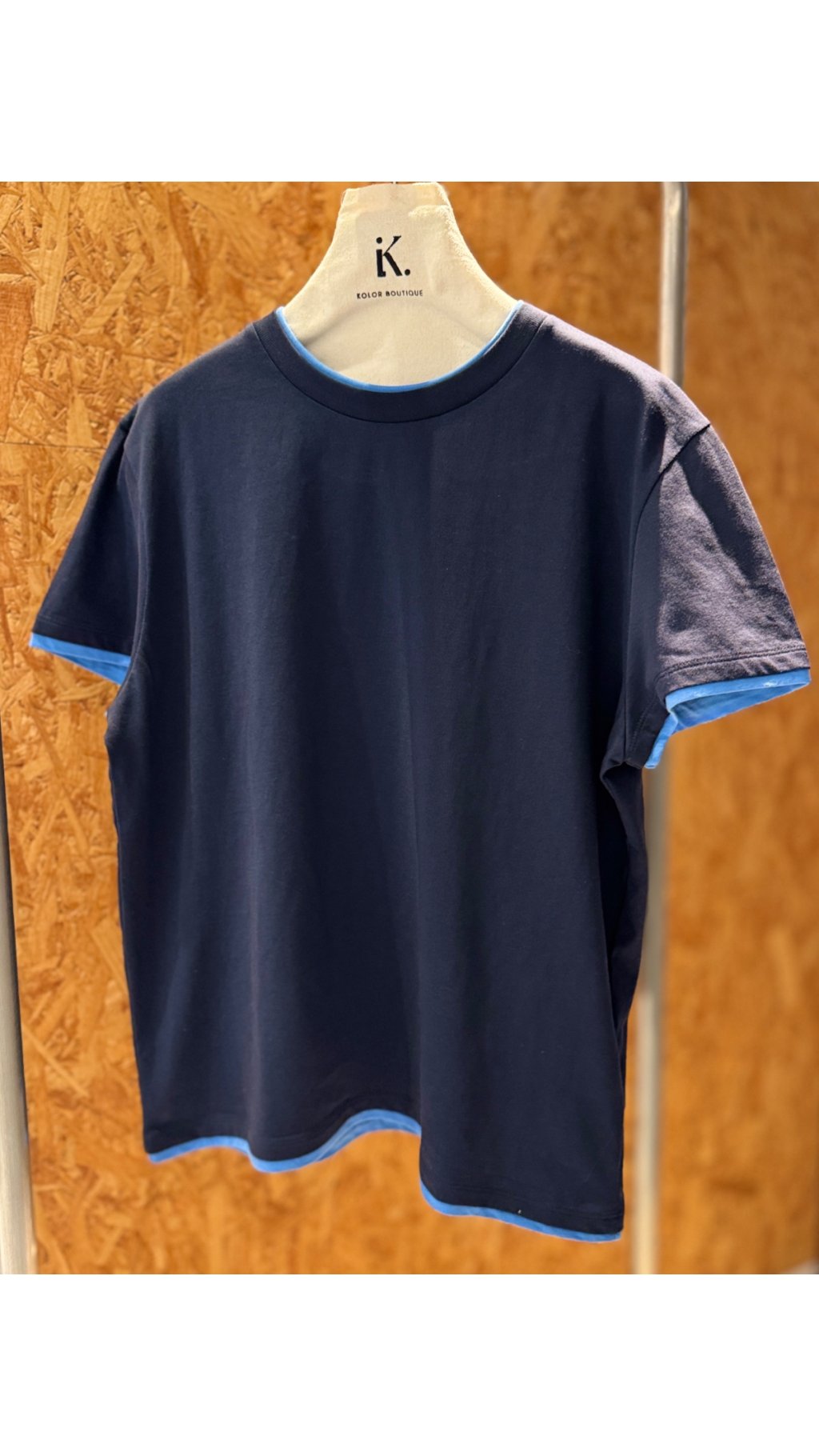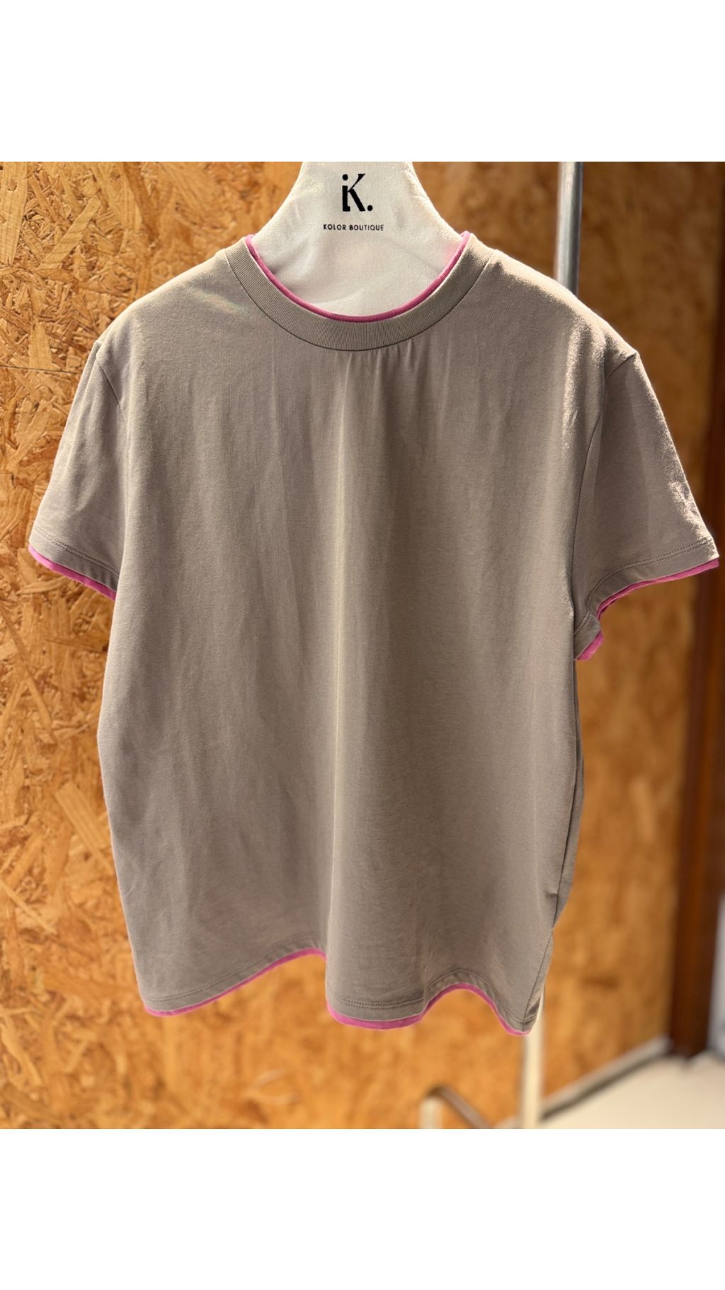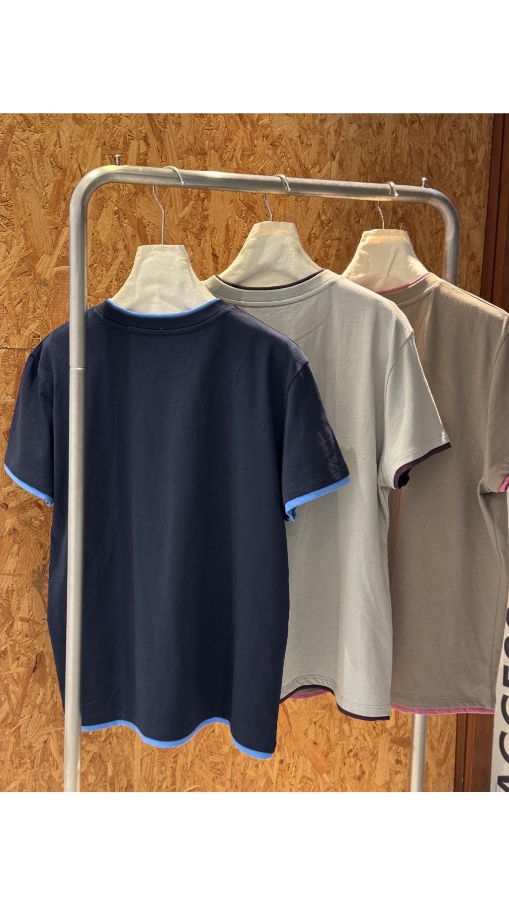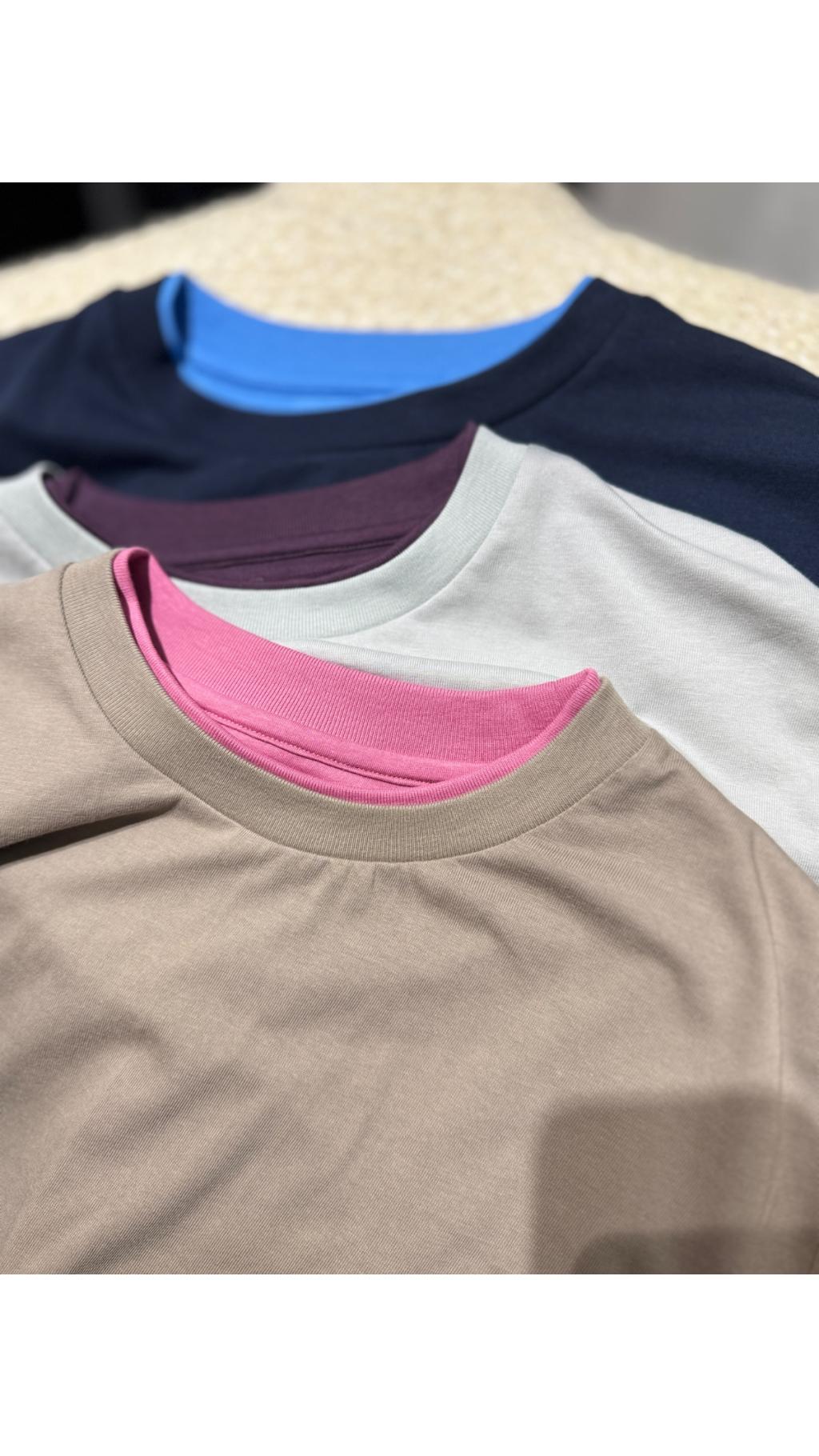 • 撞色假兩件包邊:領口、袖口、下擺均採用撞色包邊設計,視覺上營造出「內搭小圓領」的層次感,簡單卻充滿細節,區別於普通基礎款T恤。